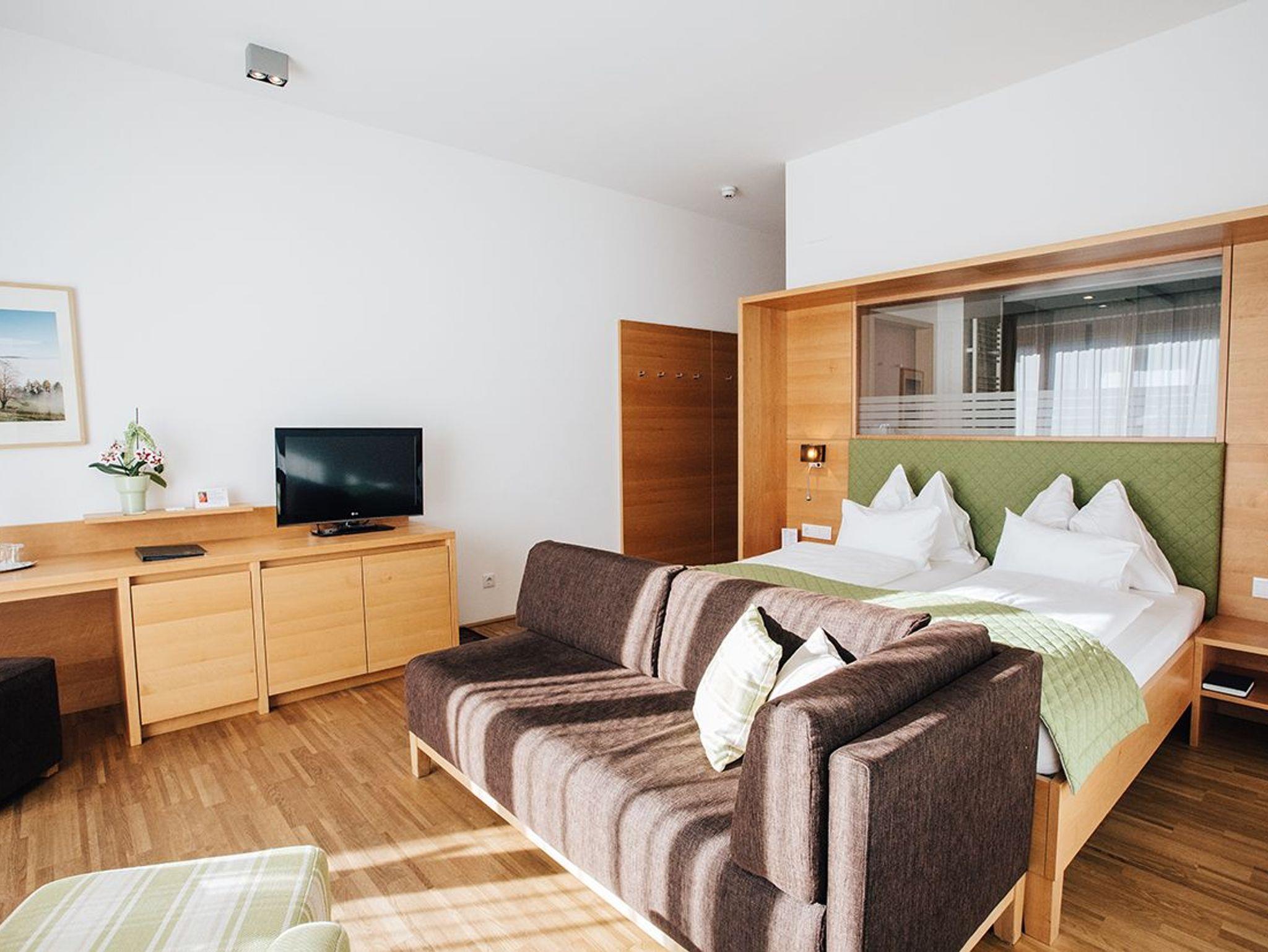 Doppelzimmer „Seeseite de luxe“ mit 34 m² Schlafzimmer mit seeseitig ausgerichteten Betten, Lümmelcouch (bei Buchungen als Dreibettzimmer als drittes Bett zu verwenden, Länge der Couch: 180 cm) und Lesestuhl. Seebalkon (im Erdgeschoss mit Gartenterrasse) mit traumhaftem Blick auf den See, Bad mit verglastem Duschbereich und WC, teilsatiniertes Fenster vom Bad in den Schlafraum, Sat-TV, Telefon und Glasfaser-WLAN.