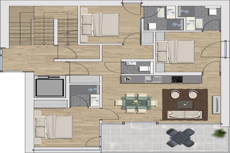 I 2. etasje: (åpent kjøkken(vedovn, komfyr med kokeplater, vannkoker, brødrister, kaffetrakter, stekovn, mikrobølgeovn, oppvaskmaskin, kjøleskap med fryser), Stue/spisestue(TV(Tyske TV-kanaler)), Sovrum med badrum(dobbeltseng, dusj, toalett), Sovrum med badrum(dobbeltseng, dusj), WC) fellesrom(dusj, badstue), oppbevaring av ski, tørketrommel(deles med andre gjester, betalt), vaskemaskin(deles med andre gjester, betalt), terrasse, parkering, Hårtørker
