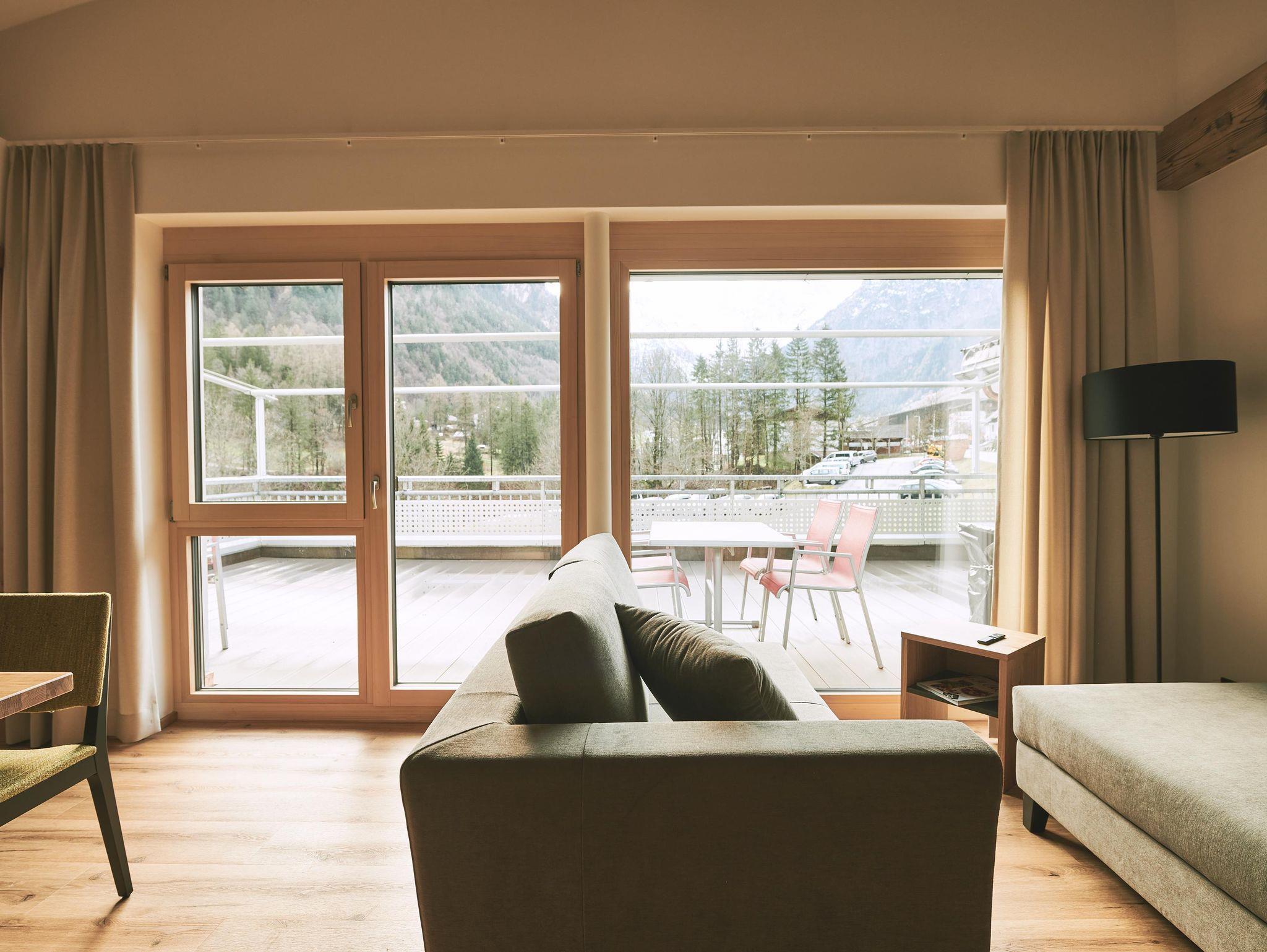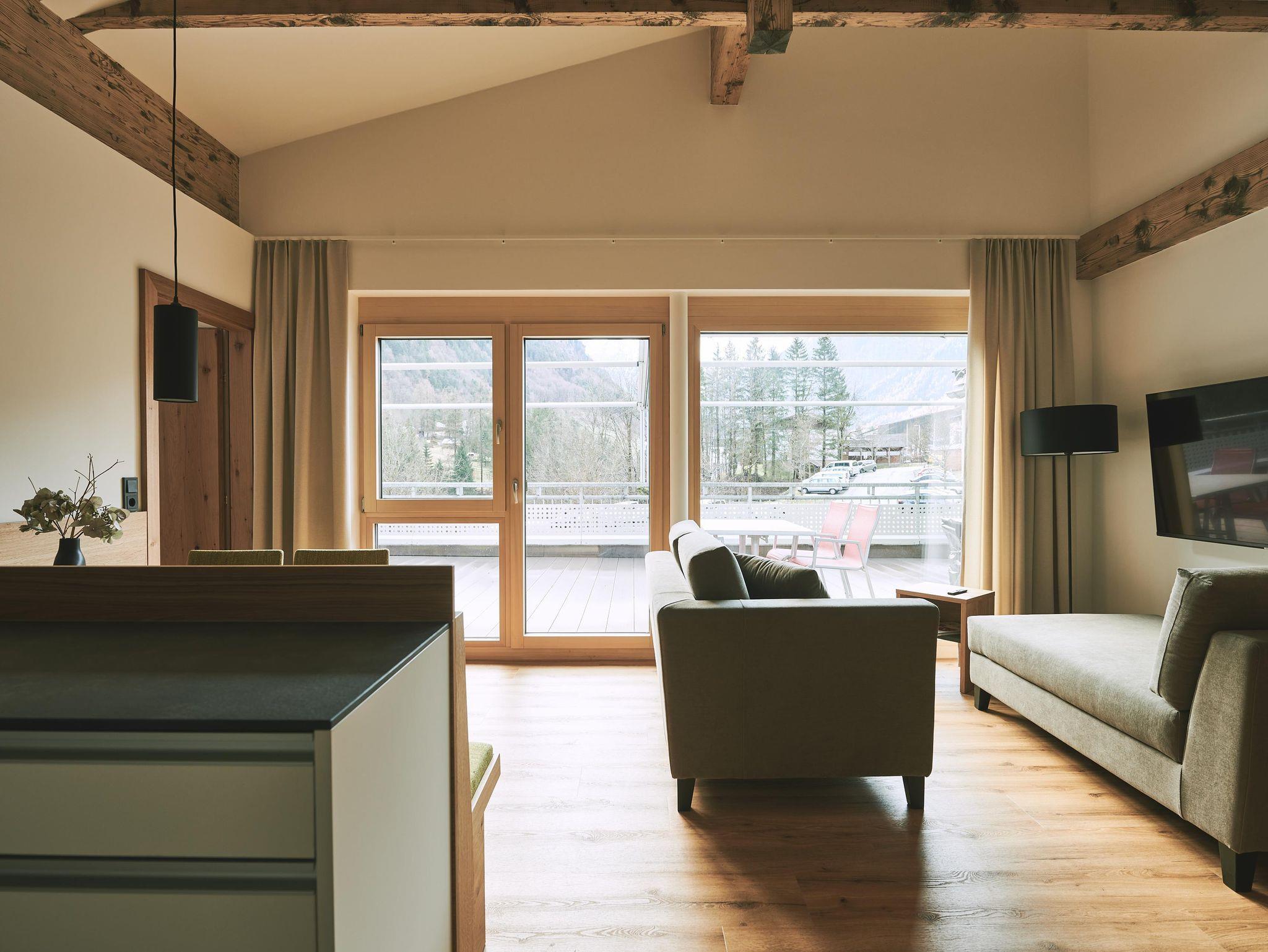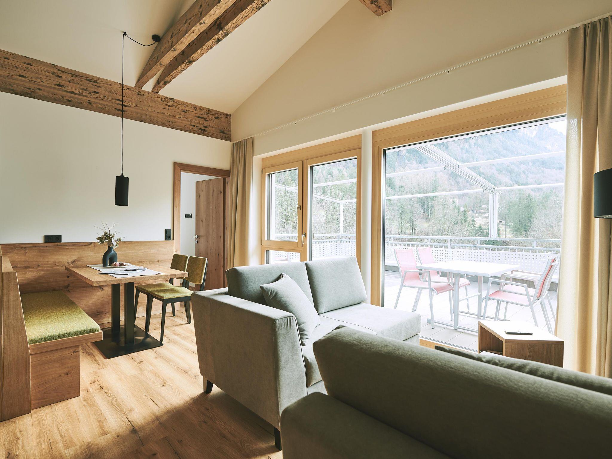 NATÜRLICHES WOHLBEFINDEN ERFAHREN Direkt an das Restaurant angrenzend befindet sich das 59 Quadratmeter große Appartement Schesaplana im OG2/EG und bietet Platz für zwei bis vier Personen. Ausgestattet mit einem kleinen Wohn-Essbereich, einer umso größeren südseitigen Panoramaterrasse mit Bergblick auf die Schesaplana die Königin des Rätikonmassivs, 2 Doppelzimmern, Badezimmer mit Dusche und WC sowie einem separaten WC. In der vollausgestatteten Küche befinden sich Geschirrspüler, Induktionskochfeld, Backofen und Kapsel-sowie Filterkaffeemaschine. Heimeliges Wohngefühl und viel Holz gibt es von uns gerne obendrauf!
