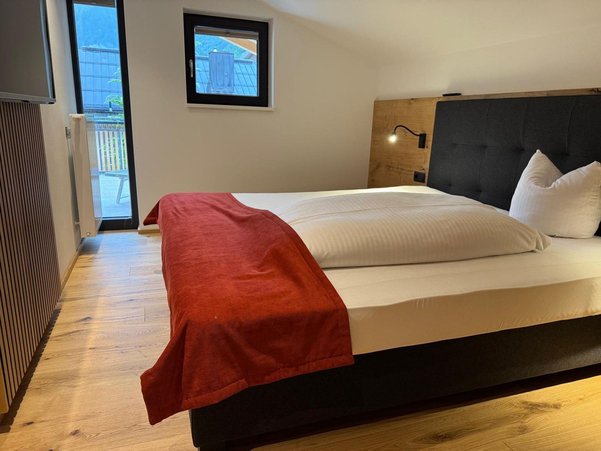 • Ein Schlafzimmer mit komfortablem Doppelbett und eigenem Badezimmer mit Dusche/WC.