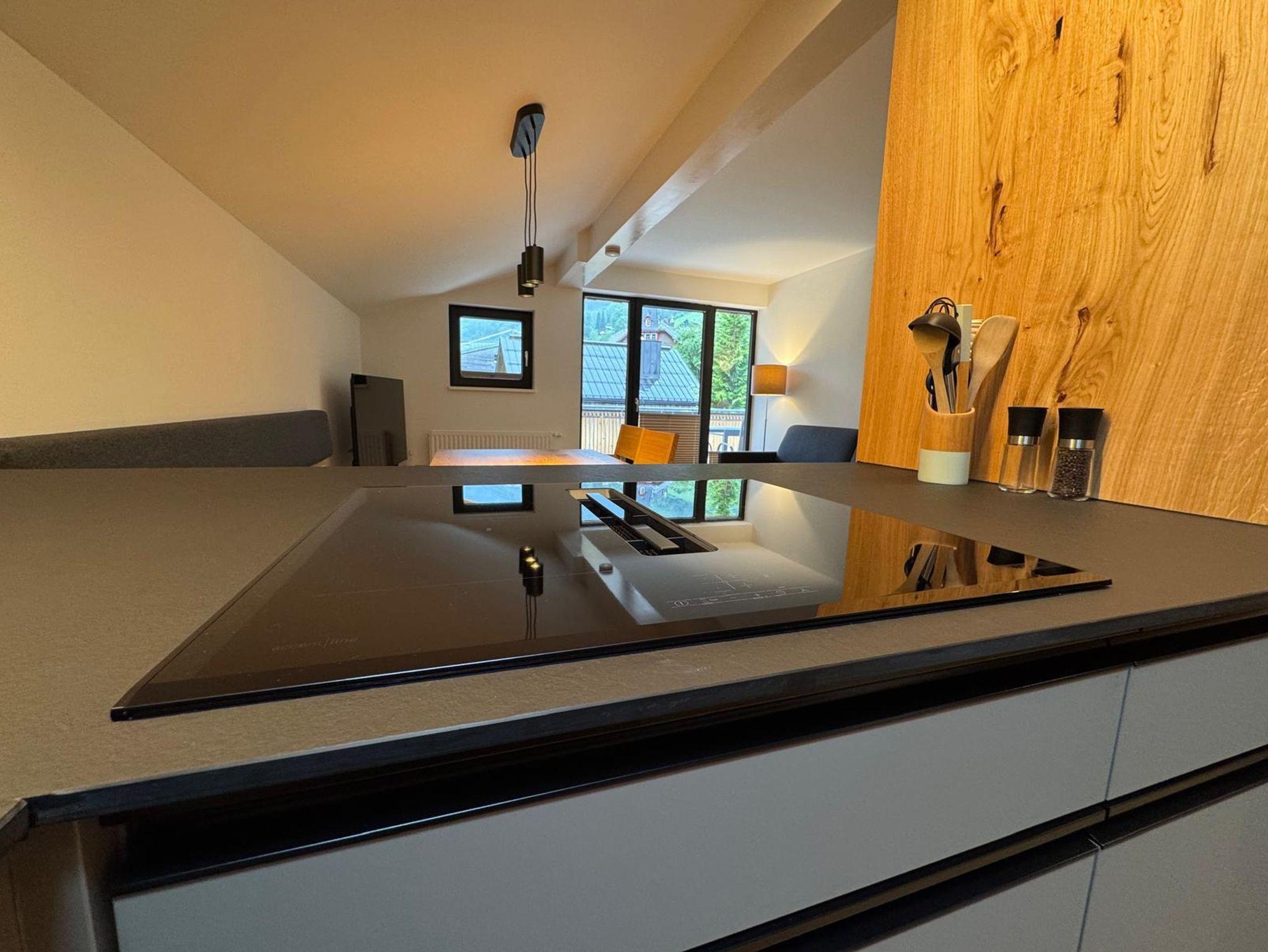 • Voll ausgestattete Küchenzeile im hellen Wintergarten, perfekt für gemeinsame Mahlzeiten.