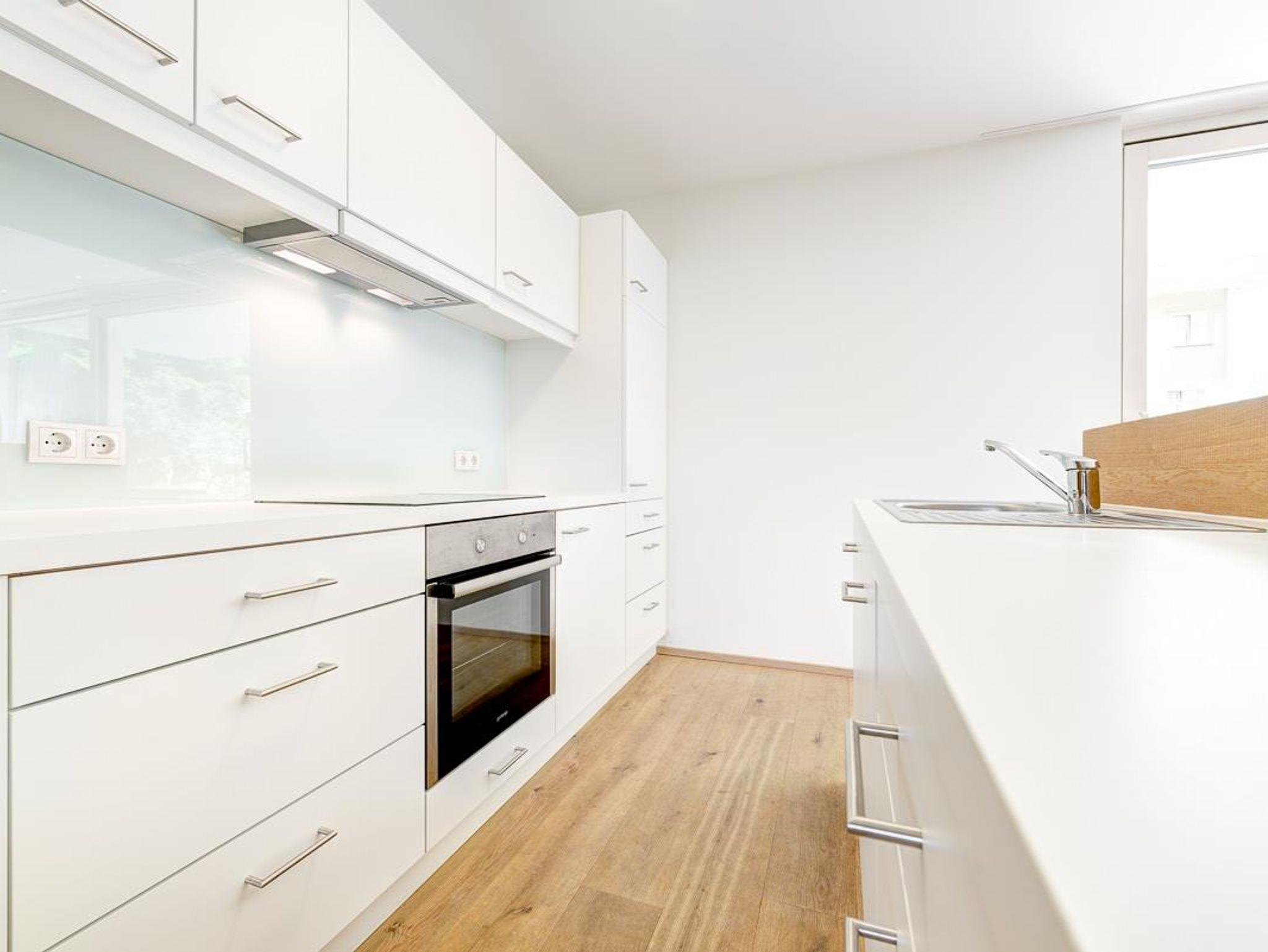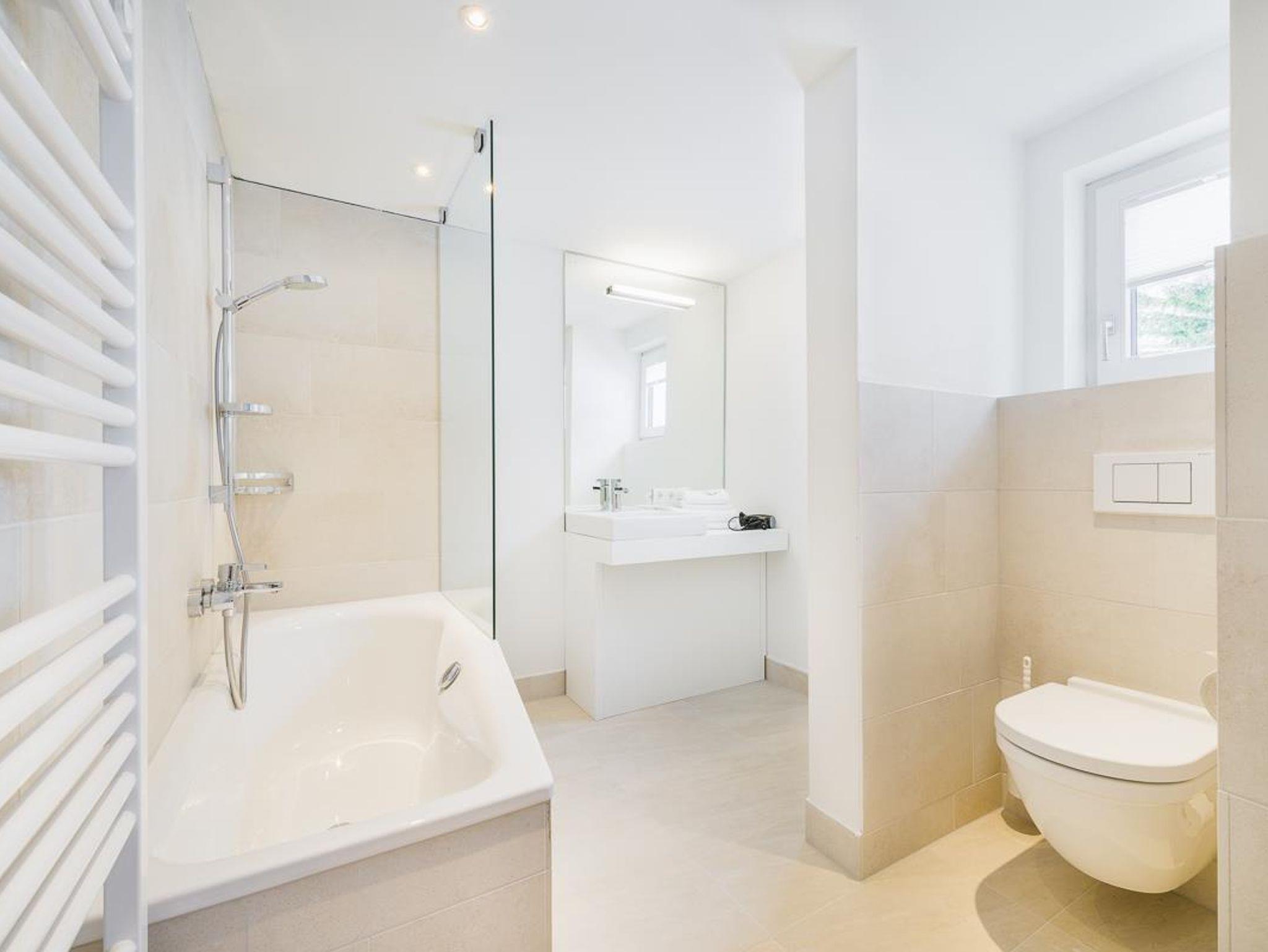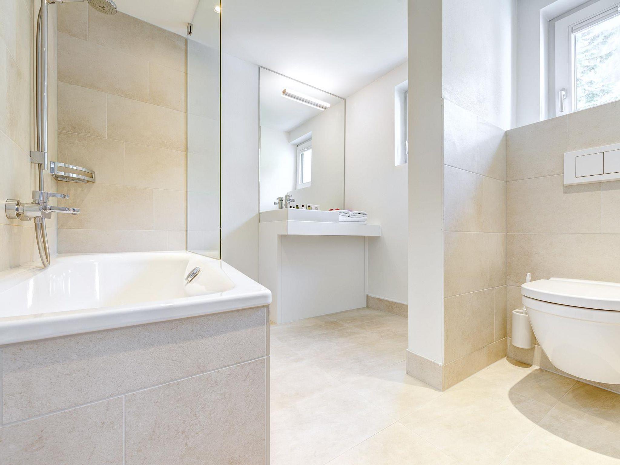 In einem hellen, großzügigen Bad befindet sich eine Badewanne.