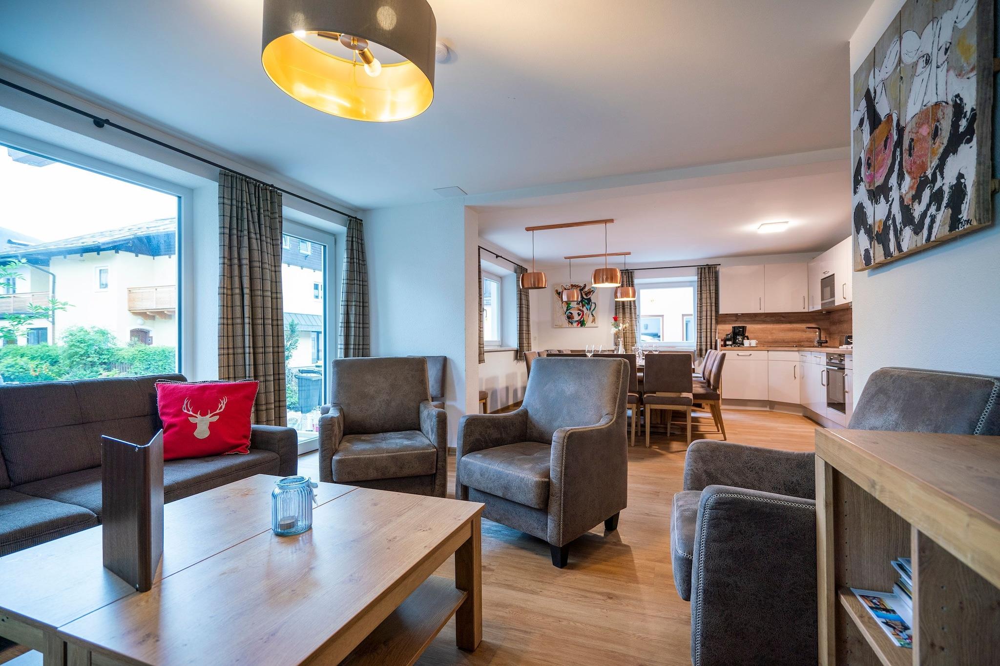 Denne moderne, frittliggende premiumhytta for maksimalt 20 personer ligger i Bruck an der Großglocknerstrasse i Salzburgerland, nær de kjente byene Zell am See og Kaprun. I første etasje er det en stor stue med et moderne åpent kjøkken, en spiseplass for alle gjester og en koselig stue. Hytta har totalt 7 soverom (2 med ekstra enkeltrom og 2 med ekstra køyeseng) og 7 bad, fordelt på 3 etasjer, stor sørvendt terrasse, finsk badstue og skibod. Du kan parkere direkte ved hytten. Tre forskjellige skiområder, to vakre skisteder og en pittoresk innsjø - dette er hva skiregionen Zell am See - Kaprun tilbyr ved foten av den berømte Kitzsteinhorn-breen. Løypene på Schmittenhöhe, familieskiområdet Maiskogel og det snøsikre skiområdet på Kitzsteinhorn byr på til sammen 150 kilometer med bakker fulle av variasjon. Zell am See - Kaprun-regionen er også ideell for vinterturister, langrennstilhengere og freestylere. Om vinteren stopper den gratis skibussen i nærheten av huset. Den store og berømte innsjøen Zell og to 18-hulls golfbaner ligger kun 4 km fra huset. Takket være den sentrale beliggenheten i Salzburgerland, er du nær de fleste severdigheter når som helst på året og selvfølgelig nær Østerrikes høyeste fjell, Großglockner. Om sommeren vil du finne mye bademoro i den naturlige badesjøen Niedernsill - Piesendorf eller i den naturlige badesjøen i Maishofen. Rett i byen finner du mange shoppingmuligheter for dine daglige behov samt et godt utvalg av restauranter.