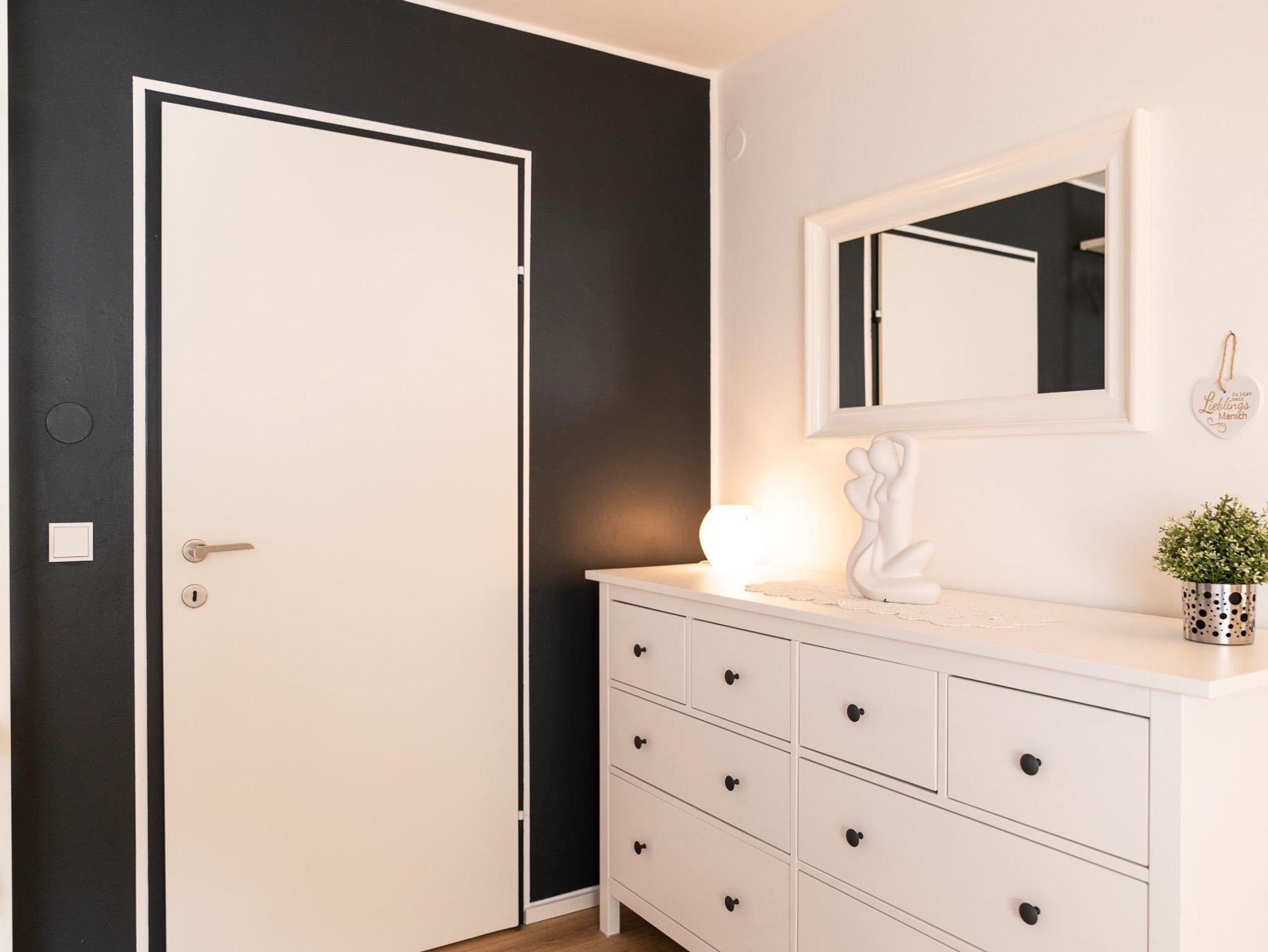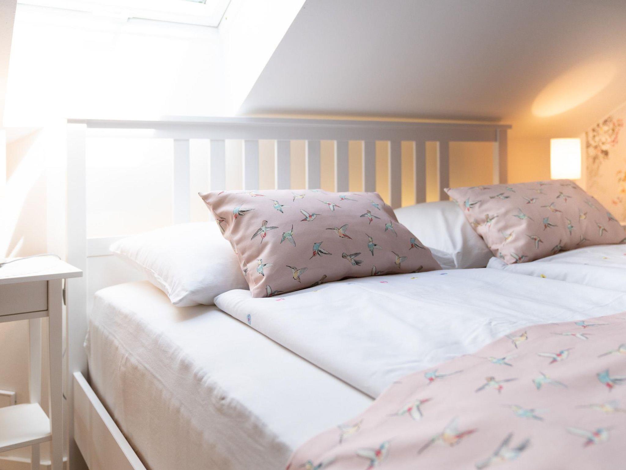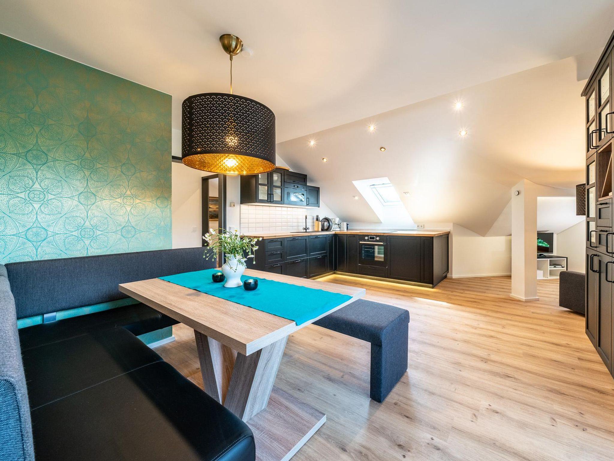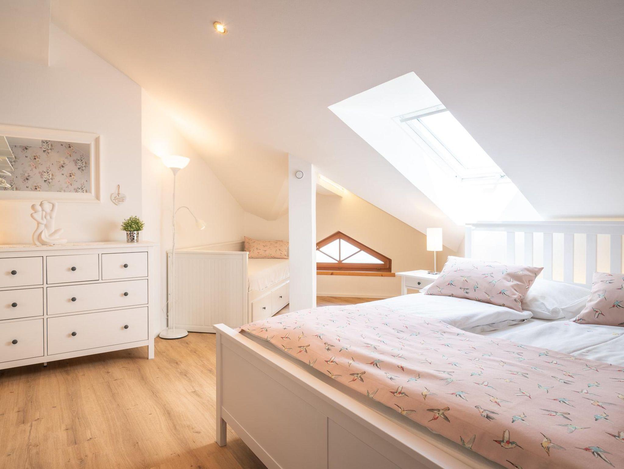 Die Ferienwohnung im Dachgeschoss bietet eine Wohnfläche von 80 m². Sie umfasst ein Schlafzimmer mit Doppelbett sowie ein weiteres Schlafzimmer mit zwei Doppelbetten. Der Wohnraum verfügt über eine komplett ausgestattete Küche und einen Esstisch mit Sitzbank. Zusätzlich gibt es eine Ausziehcouch im Wohnbereich mit den Maßen 140 x 200 cm.