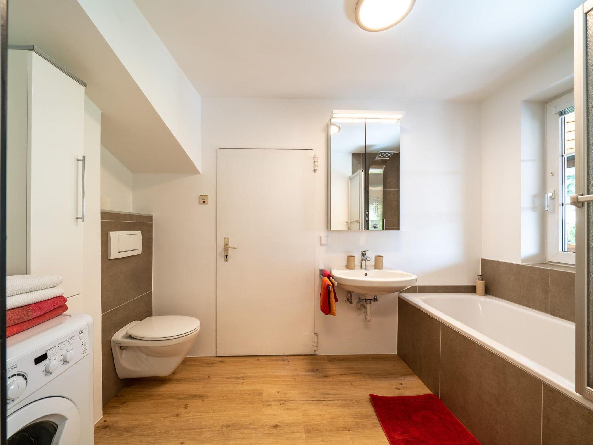 Der Balkon ist mit Sitzgelegenheiten und einer Liegemuschel ausgestattet und bietet einen traumhaften Ausblick auf den Millstätter See und die umliegende Bergwelt. Das Badezimmer ist mit einer Badewanne und einem WC ausgestattet.