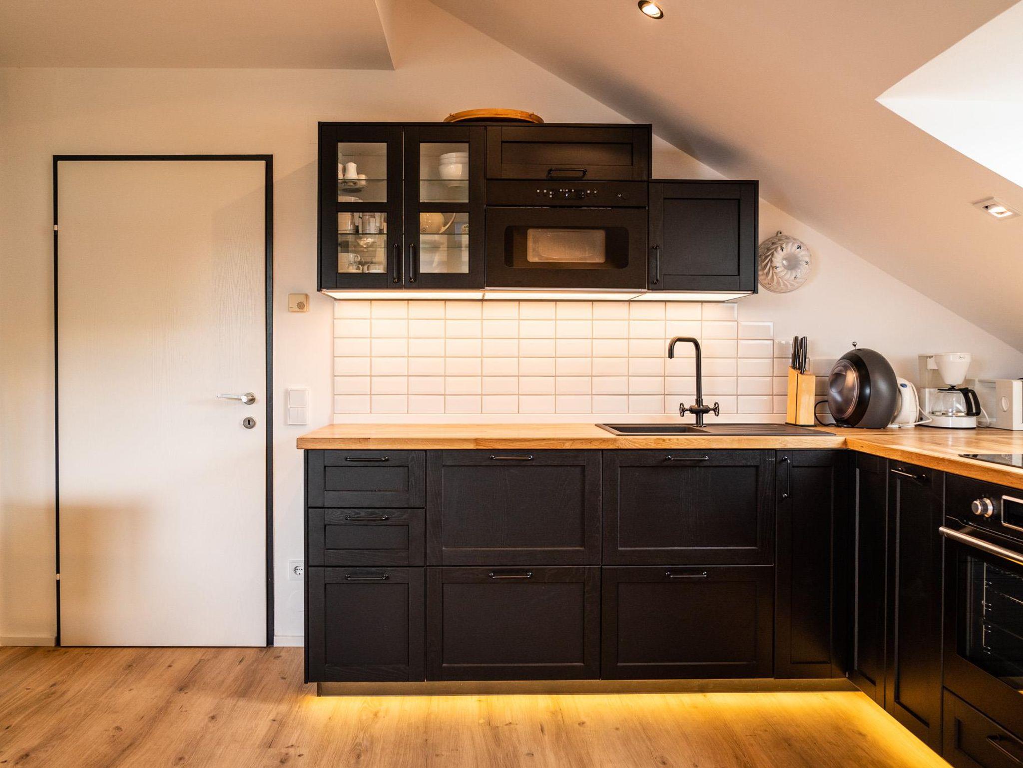 Die Küche enthält einen Kühlschrank, Geschirrspüler, Wasserkocher, Espresso- und Filterkaffeemaschine, Mikrowelle, Backofen und Herd. Eine Waschmaschine steht ebenfalls zur Verfügung.