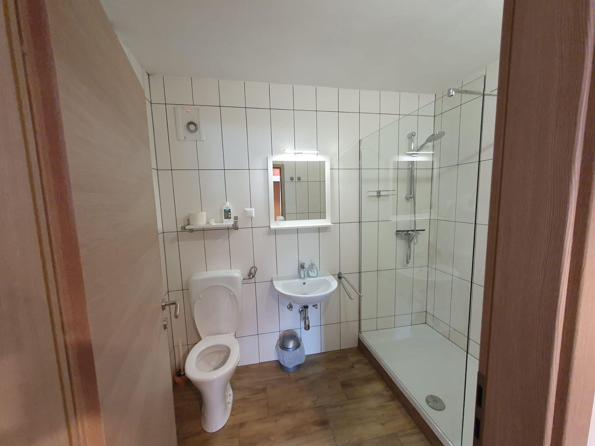 Das moderne Bad ist mit einer walkin Duche (1,4m) Waschbecken und WC ausgestattet .
