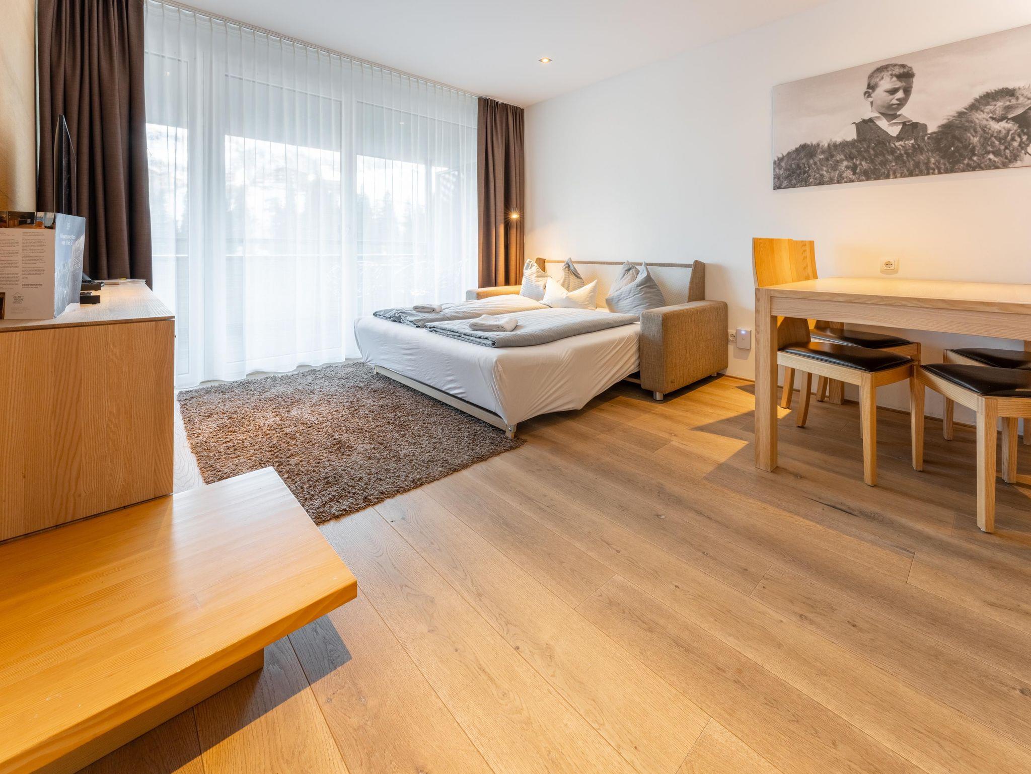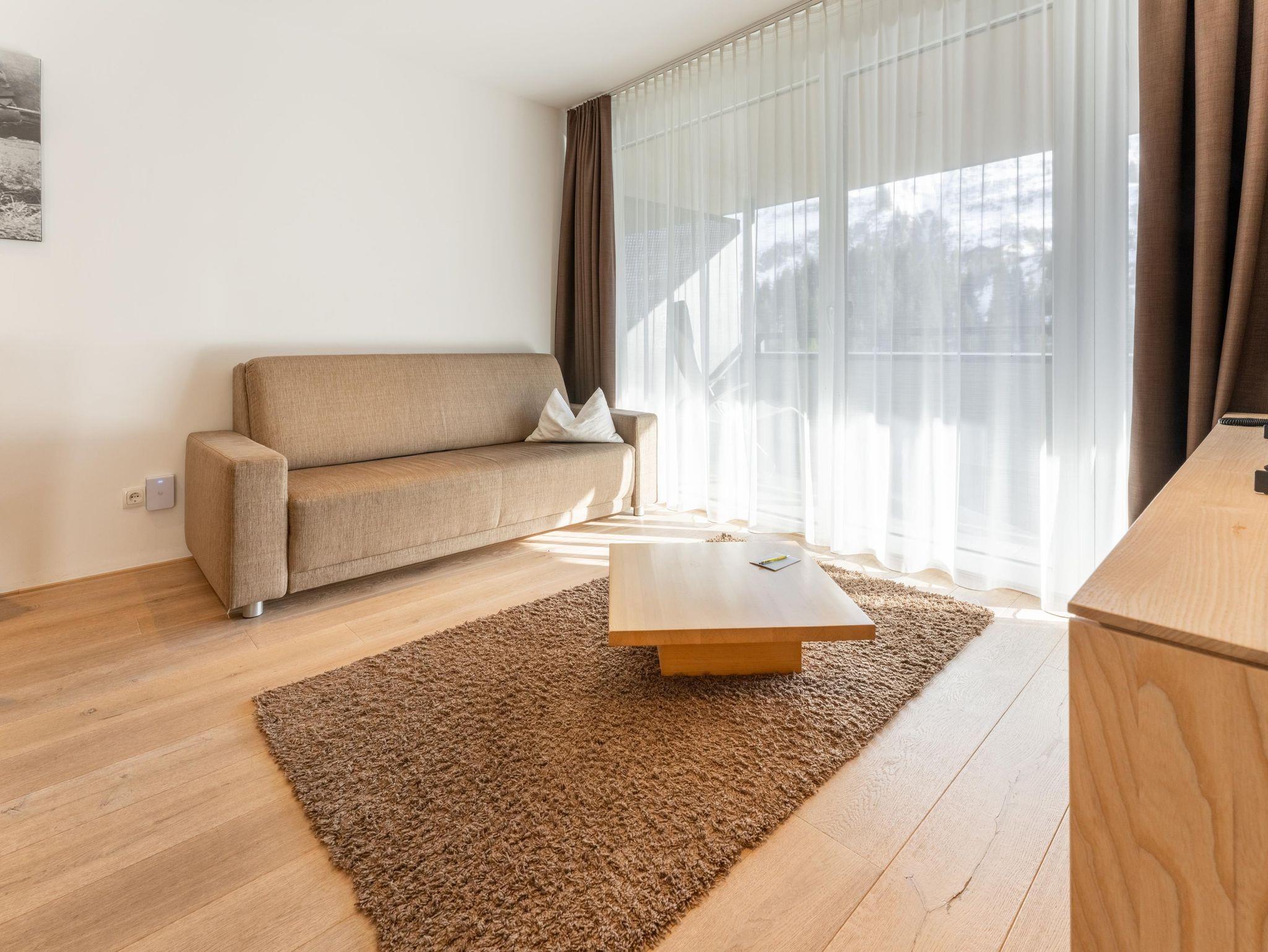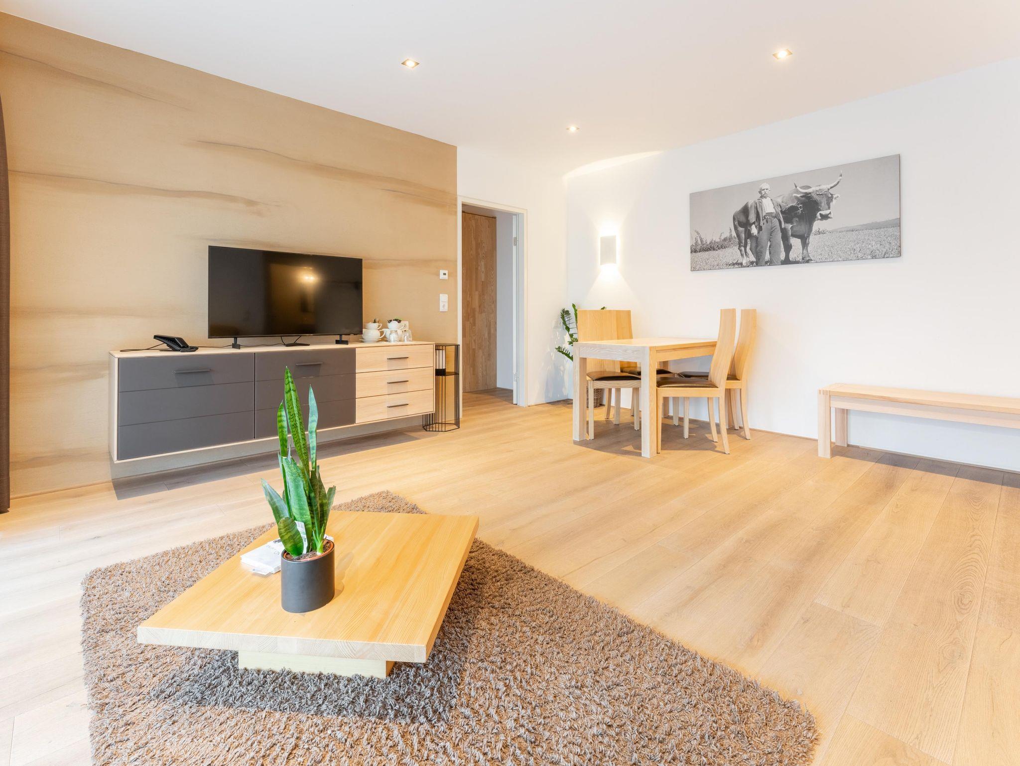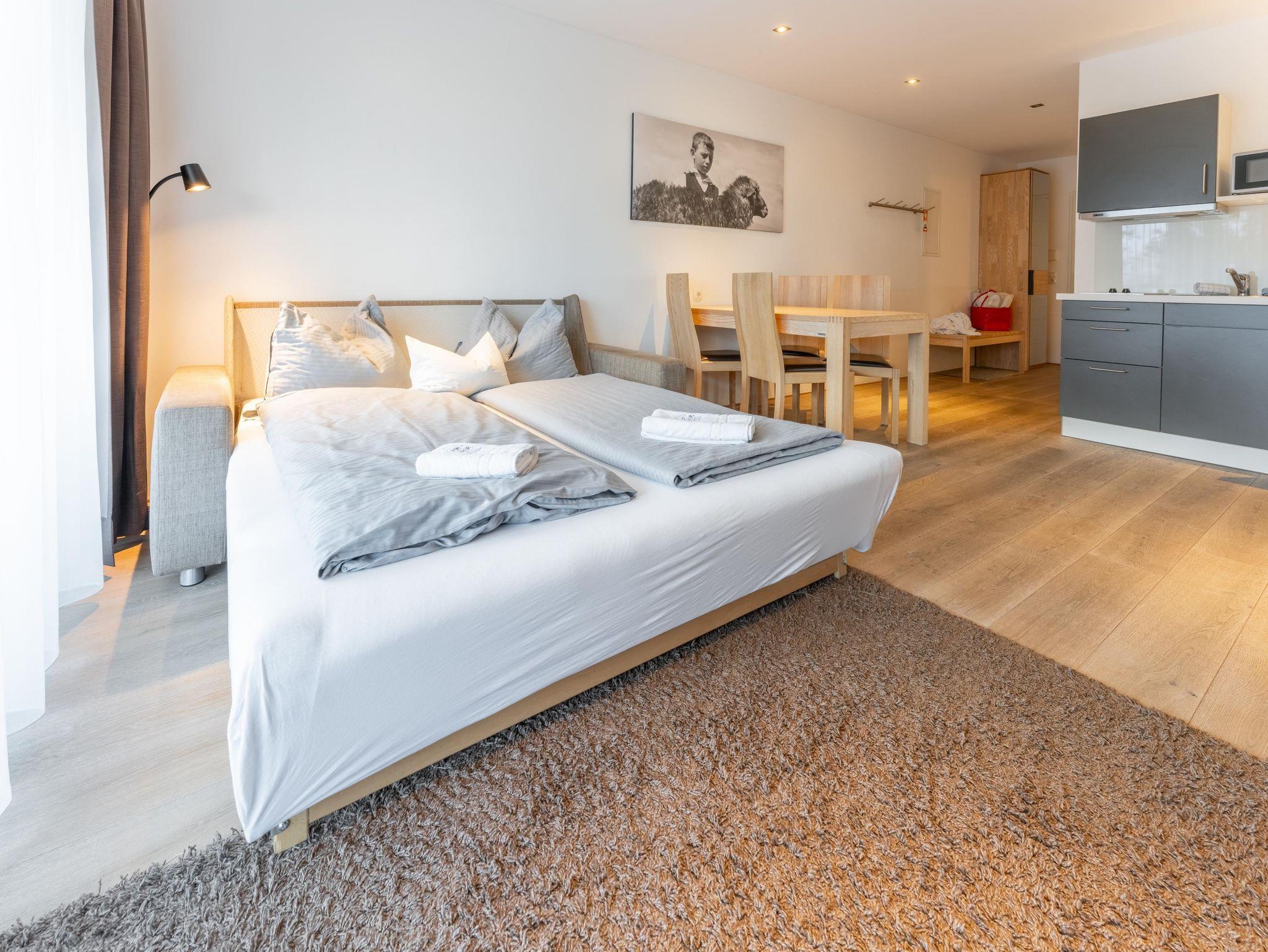 Dieses moderne Apartment verfügt über eine große Terrasse mit Bergblick und zwei Schlaffzimmer. Das Wohnzimmer ist mit komfortablen Sofas und einem Flachbild-Sat-TV ausgestattet. Außerdem bietet das Apartment kostenfreies WLAN sowie eine komplett ausgestattete Küchenzeile und einen Essbereich. Eine tägliche Reinigung und Bademäntel werden auf Anfrage gegen Aufpreis angeboten.Das Appartement steht Ihnen ohne Verpflegung zur Verfügung! Frühstück von unserem reichhaltigen Frühstücksbuffet ist zum Aufpreis von €21,-- buchbar. Die Endreinigungsgebühr von 60,--€ ist im Preis inkludiert und wird vor Ort verrechnet!