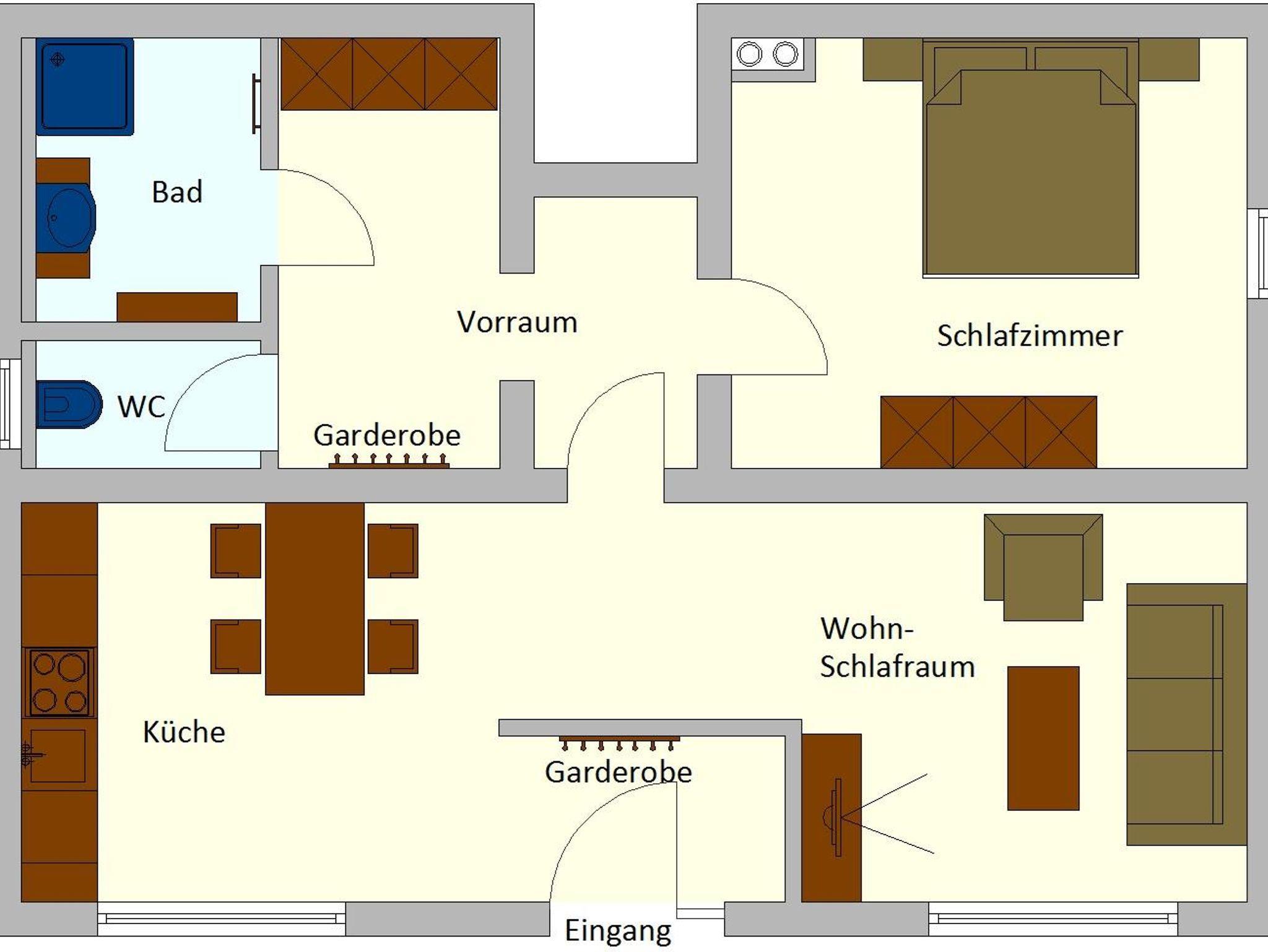 Das modern eingerichtete Appartement besteht aus einem großzügigen Wohn-Schlafraum, voll ausgestattete Küchenzeile, seperatem Schlafzimmer, Badezimmer mit Dusche, getrenntes WC.