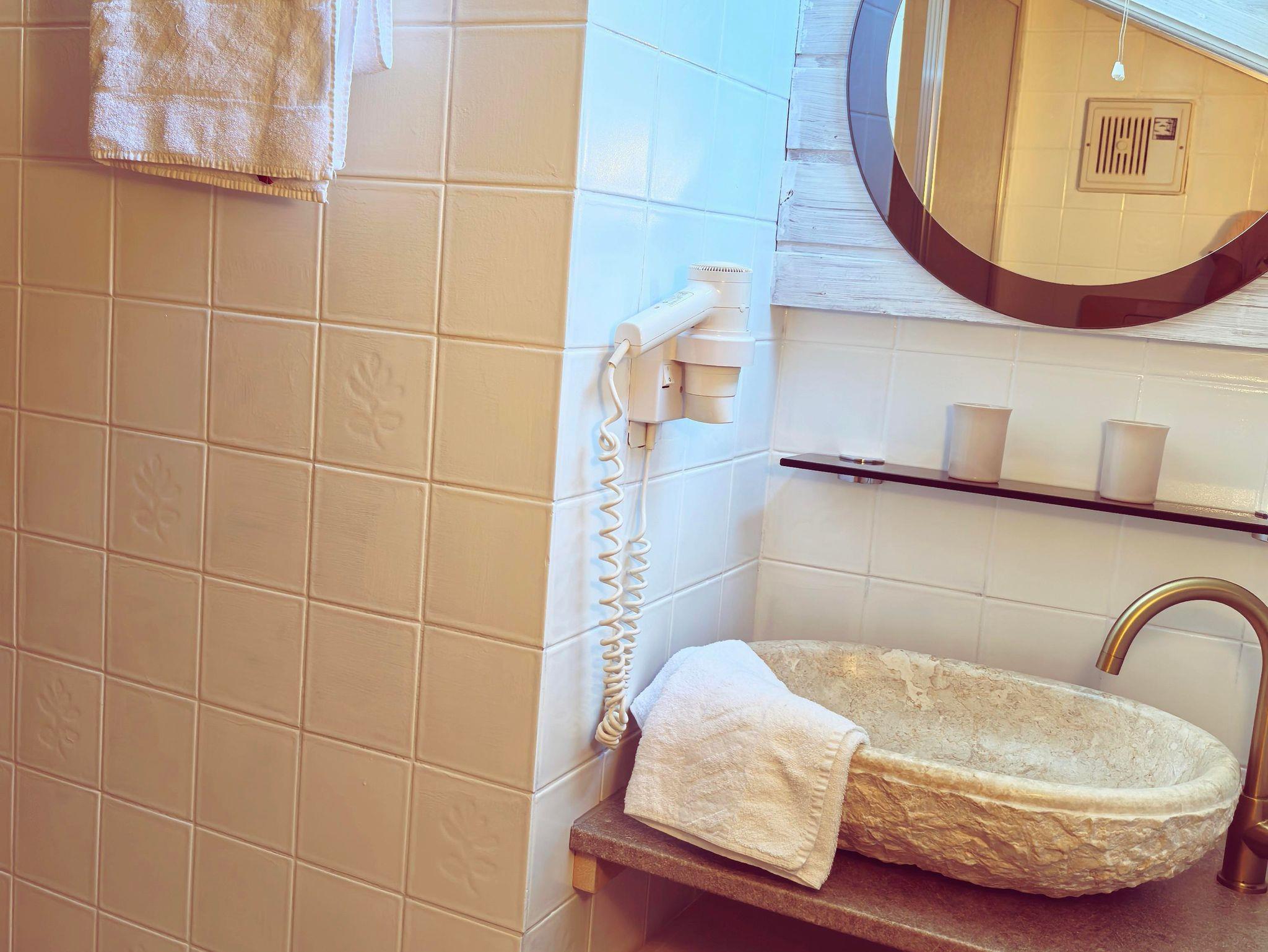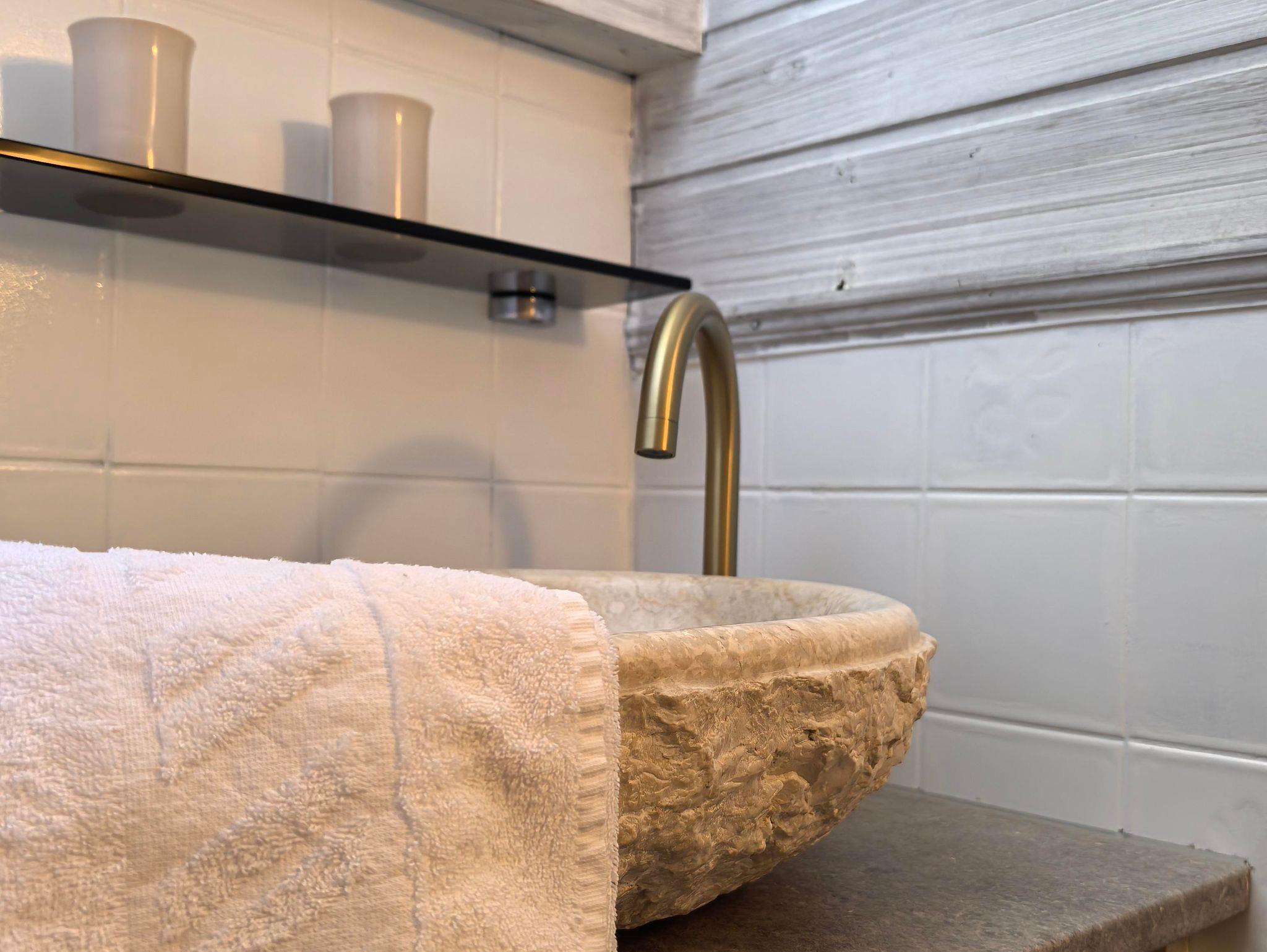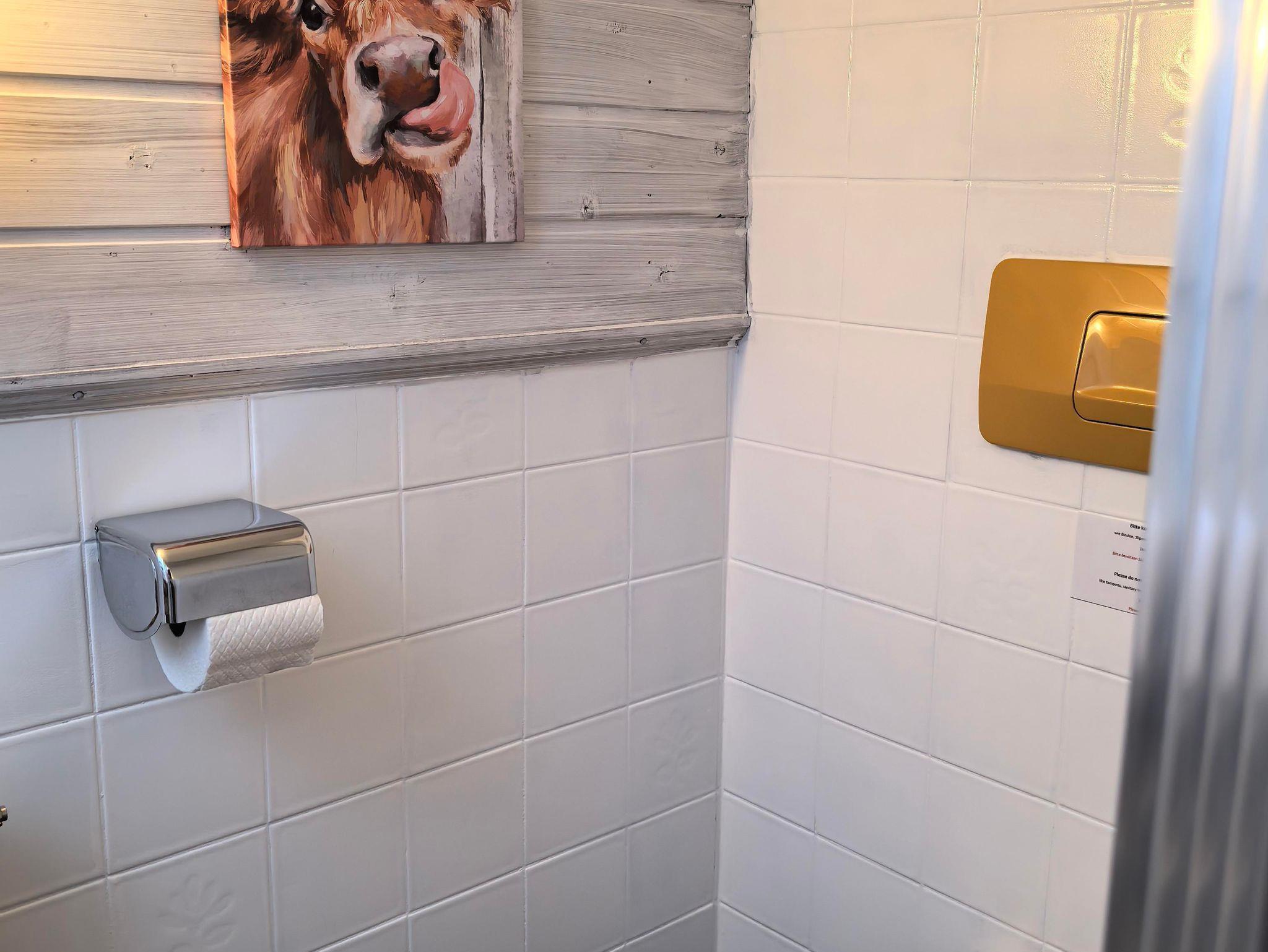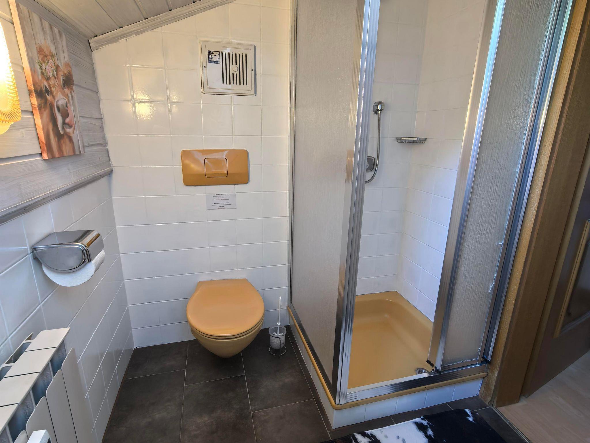 Das hell gestaltete Badezimmer ist mit WC, Waschbecken und Dusche ausgestattet.
