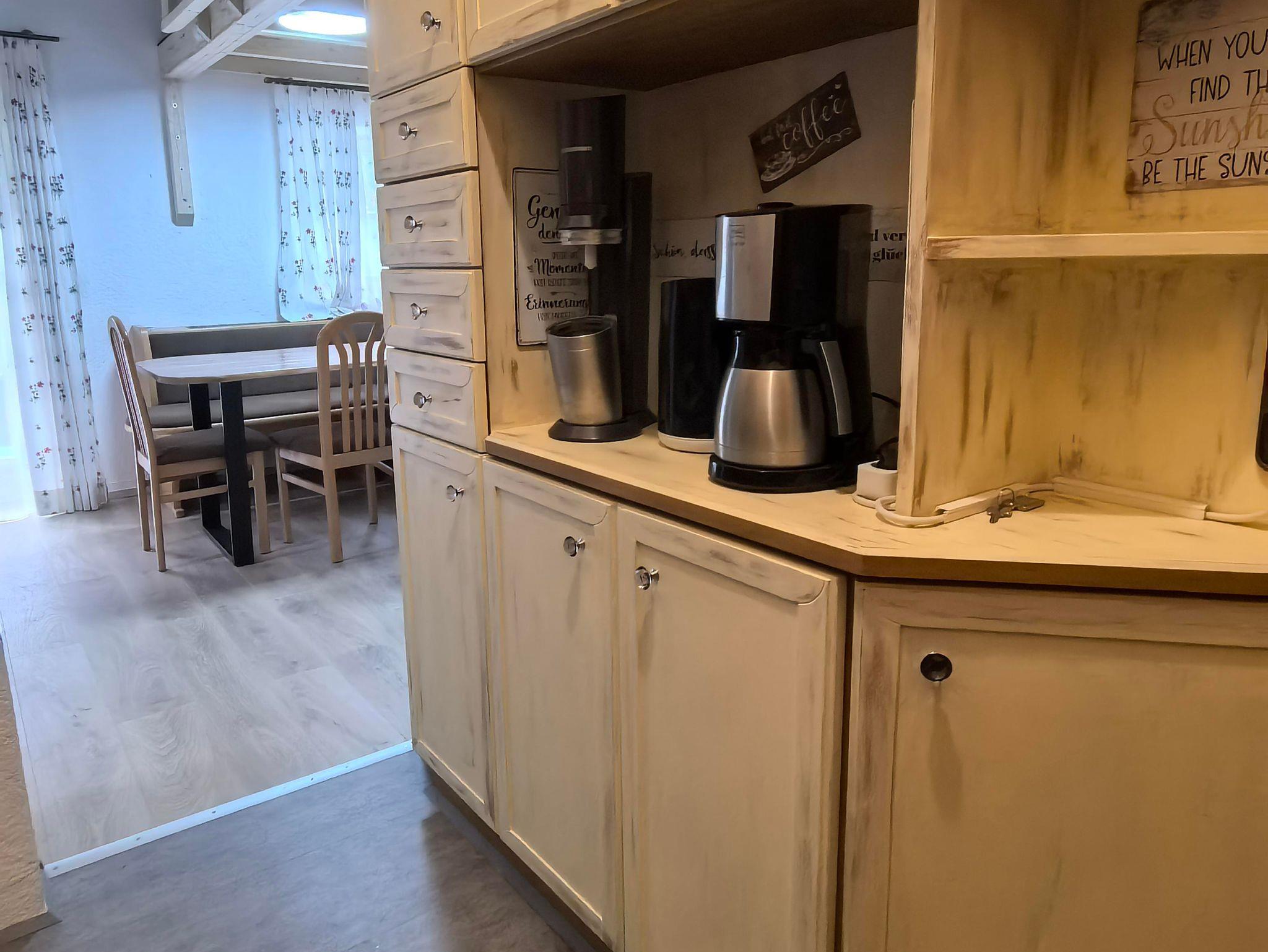 Die Küche ist voll ausgestattet mit Geschirr, Besteck, Gläsern, Kaffeemaschine, Toaster, Wasserkocher und Heißluftbackofen.