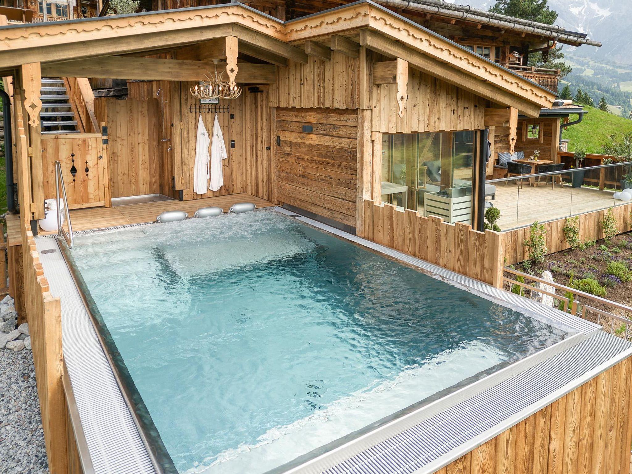 Für das Chalet Hoamat und für das Chalet Ursprung gibt es ganz exklusiv einen neuen 5 x 3 Meter großen Infinity Edelstahlpool mit Sprudelliegen und Massagedüsen für wohlig warme Stunden.