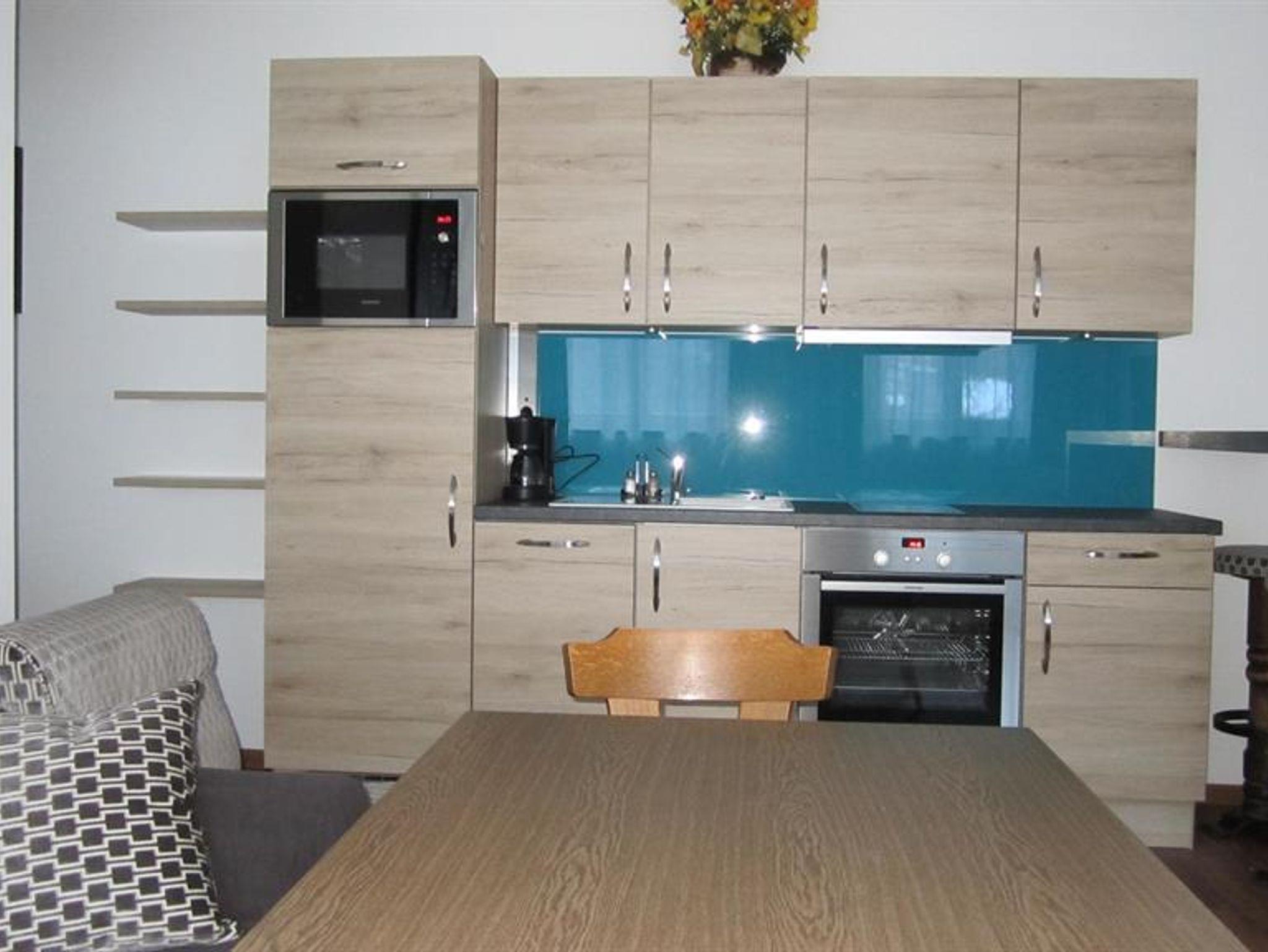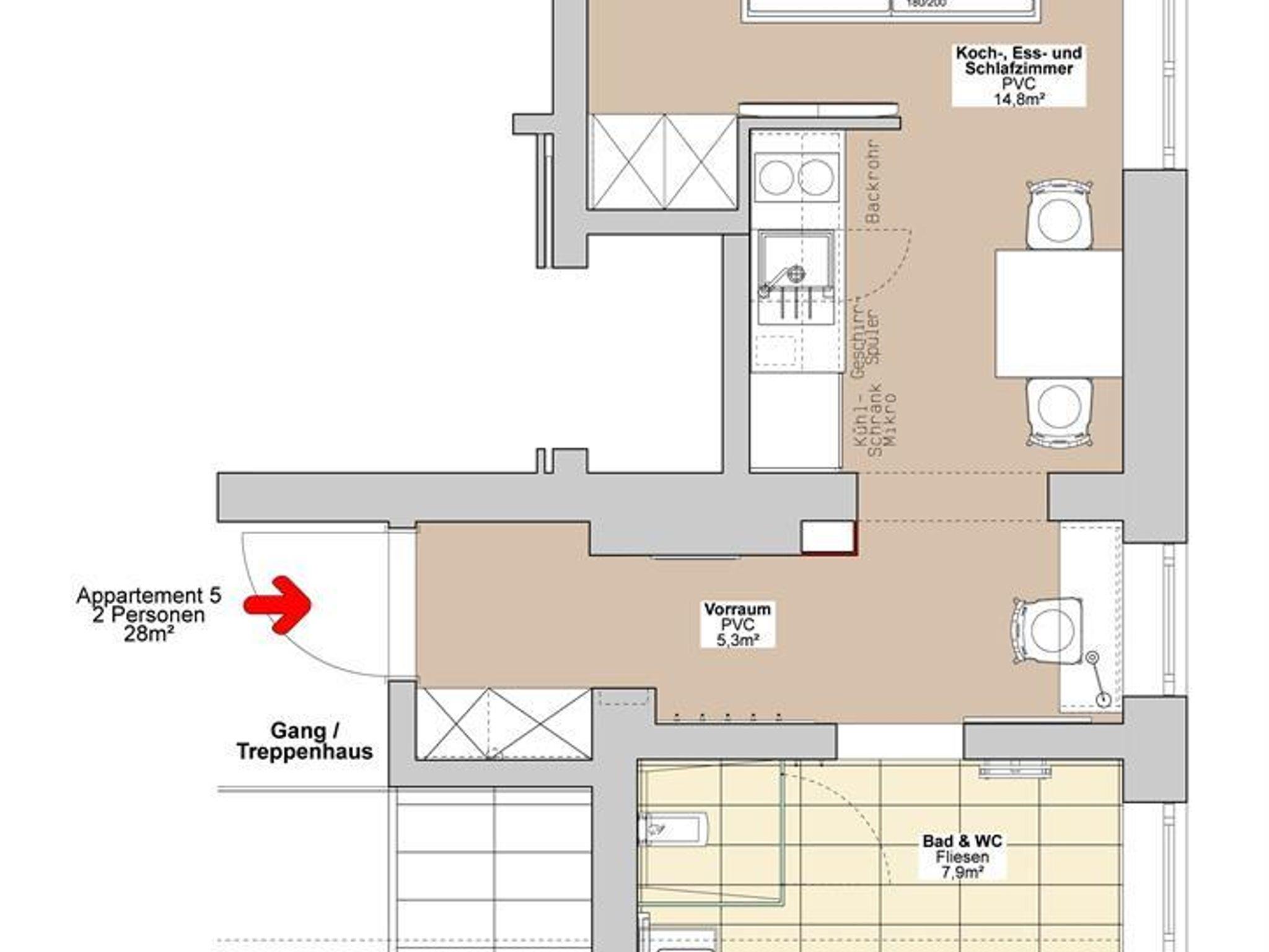 • Wohnschlafraum mit komplett eingerichteter Küchenzeile, Kühlschrank mit kleinem Gefrierfach, Filterkaffeemaschine, Wasserkocher, Geschirrspüler, Backrohr, Ceranfeld, Mikrowelle, Esstisch mit Stühlen, Doppelbett, SAT-TV, Safe, WLAN, Schreibtisch