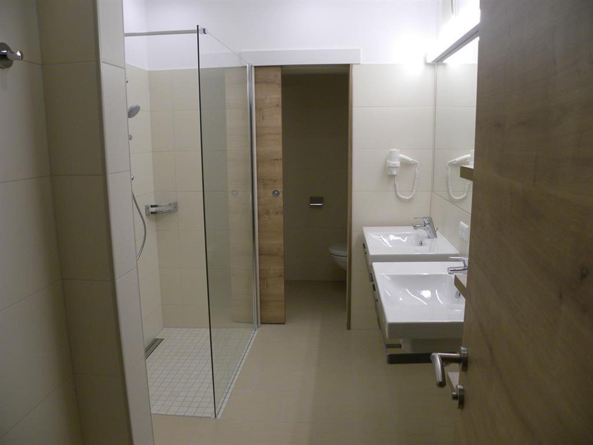 • Badezimmer mit Doppelwaschbecken, Dusche, WC, Föhn und Handtuchtrockner,