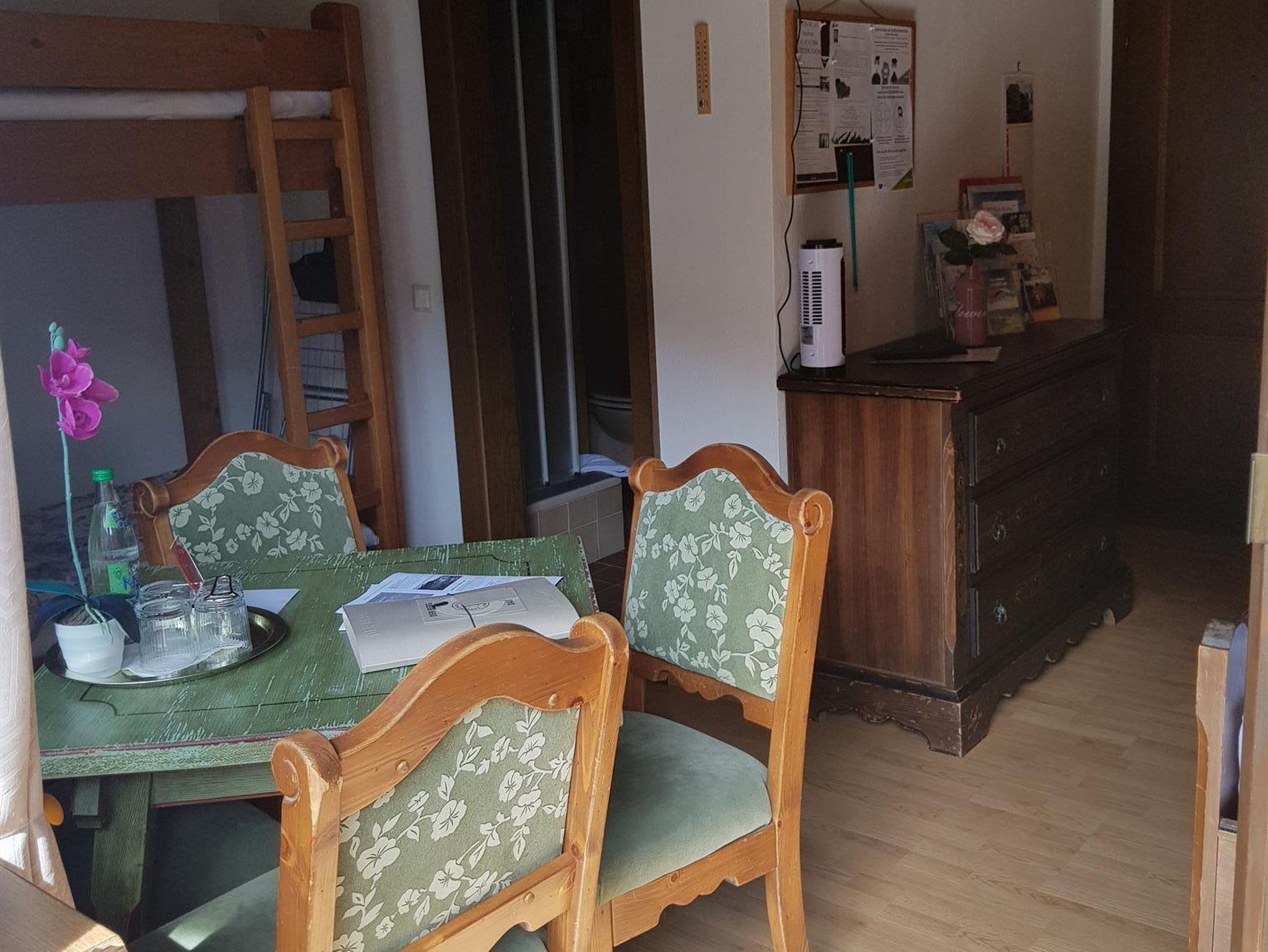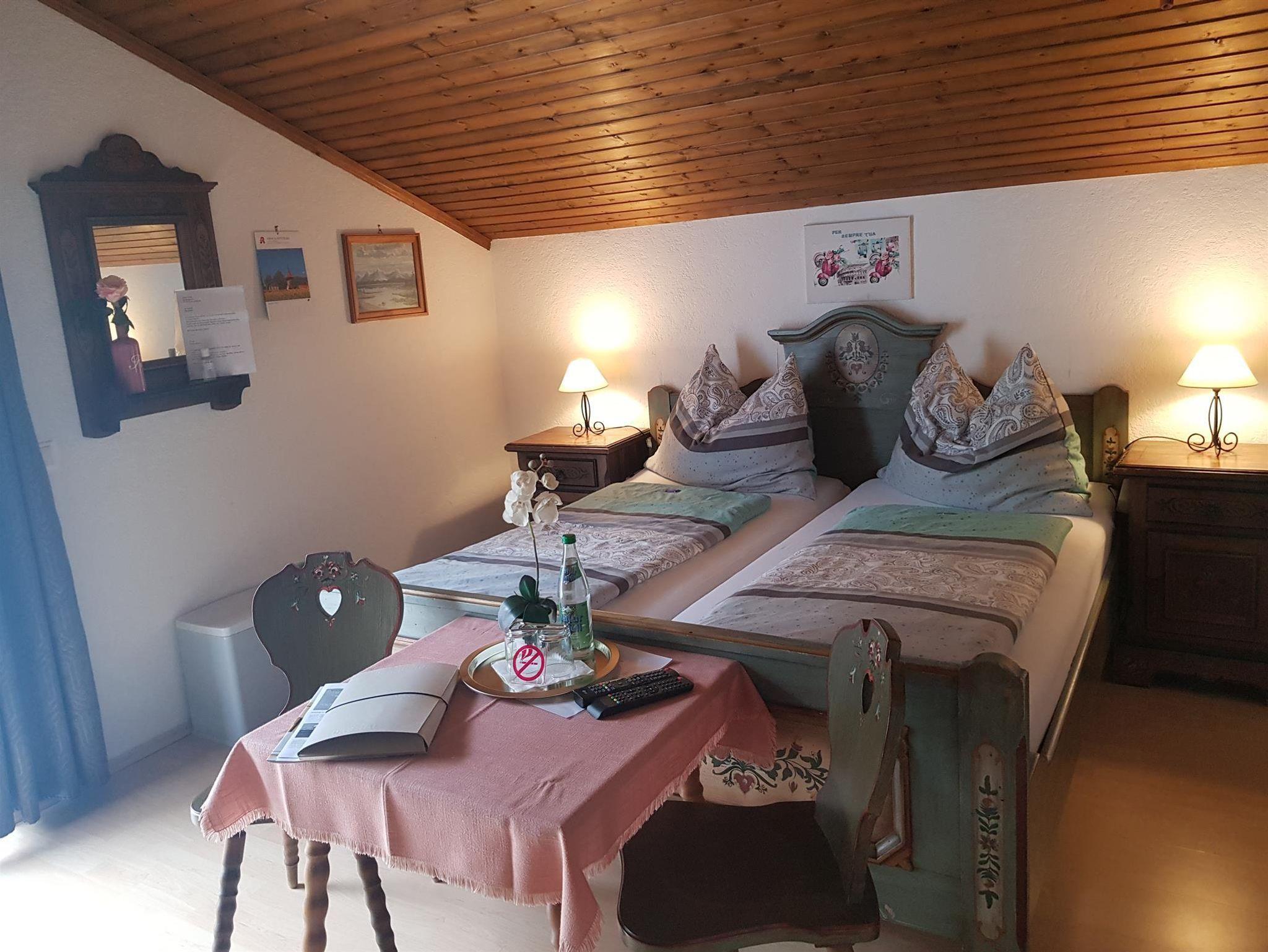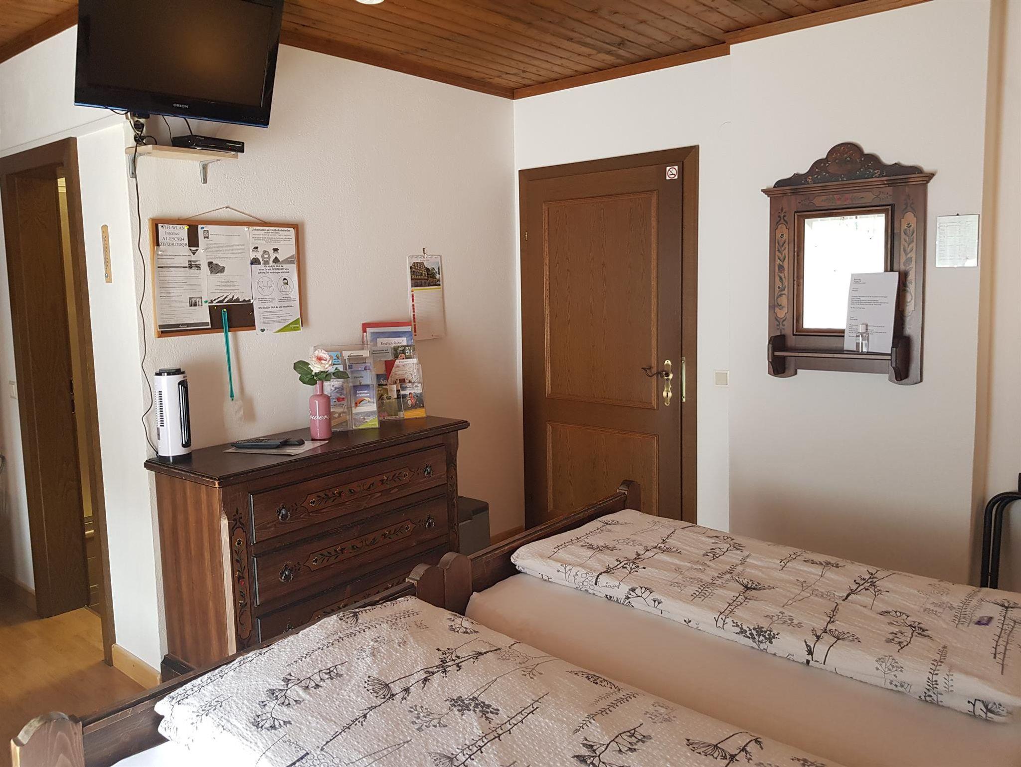 Geräumiges Zimmer mit Holzmöbeln, Fußbodenheizung, einem Sitzbereich, einem Flachbild-Sat-TV, einem Bad mit Dusche/WC und einem Balkon mit Panomramabergblick. Im Badezimmer liegt ein Haartrockner für Sie bereit. Eine Teeküche mit Aufenthaltsraum auf gleicher Etage steht zu Ihrer Verfügung.
