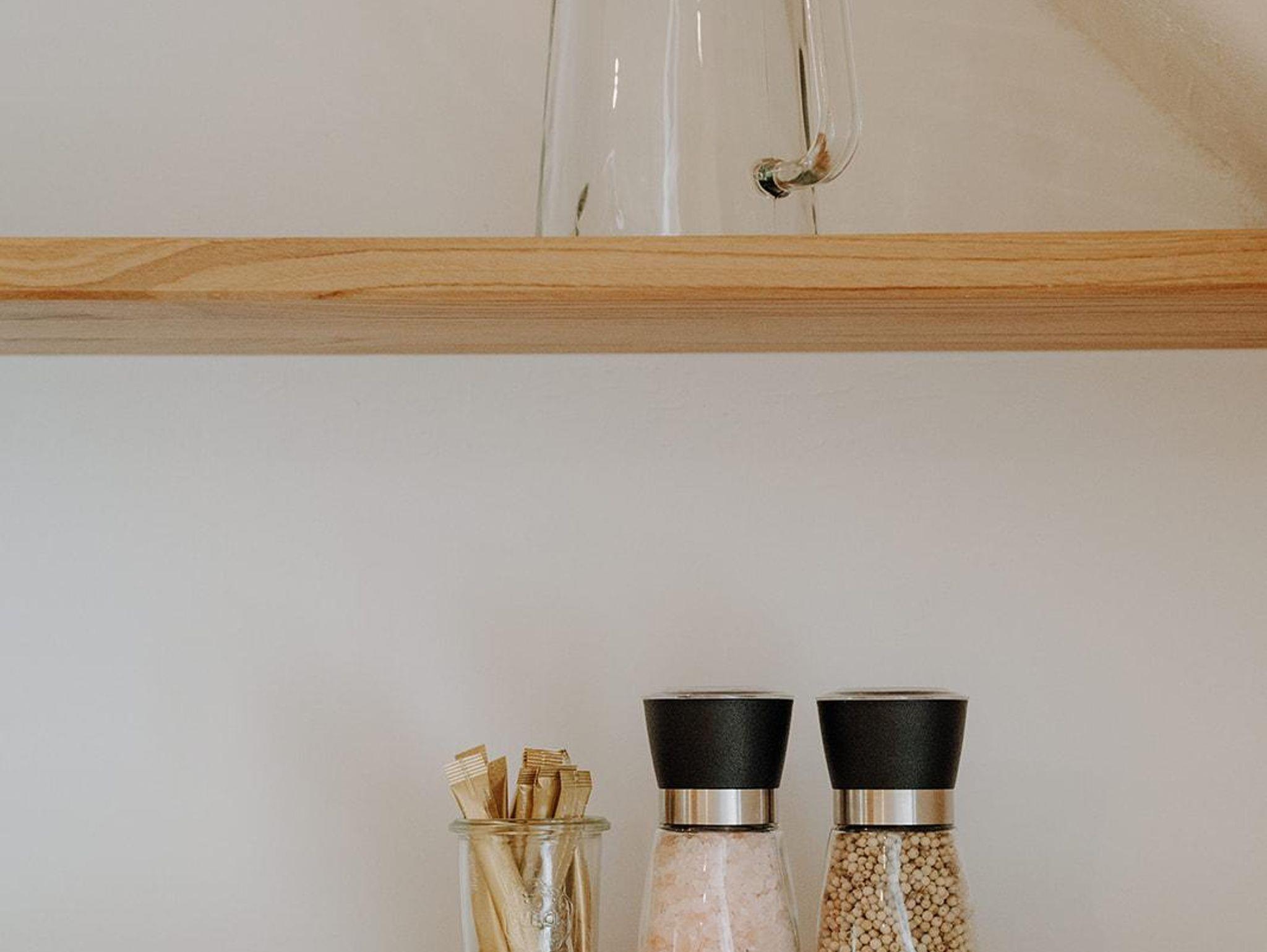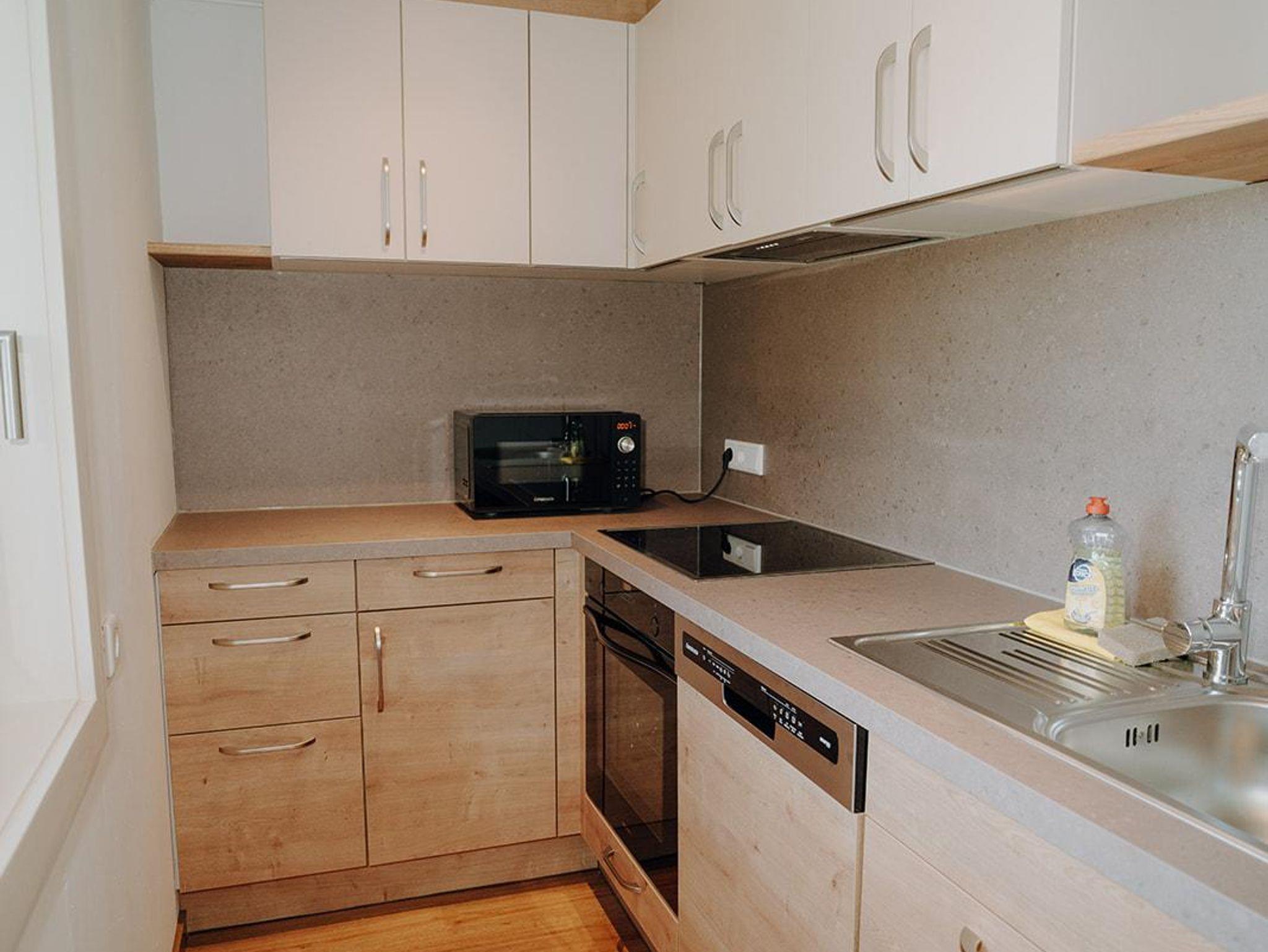 Küchenzeile mit Induktionsherd, Backofen, Kühlschrank, Kaffeemaschine, diverse Kleingeräte ( wie Toaster, Wasserkocher usw. ) Geschirrspüler und Geschirrausstattung komplett.