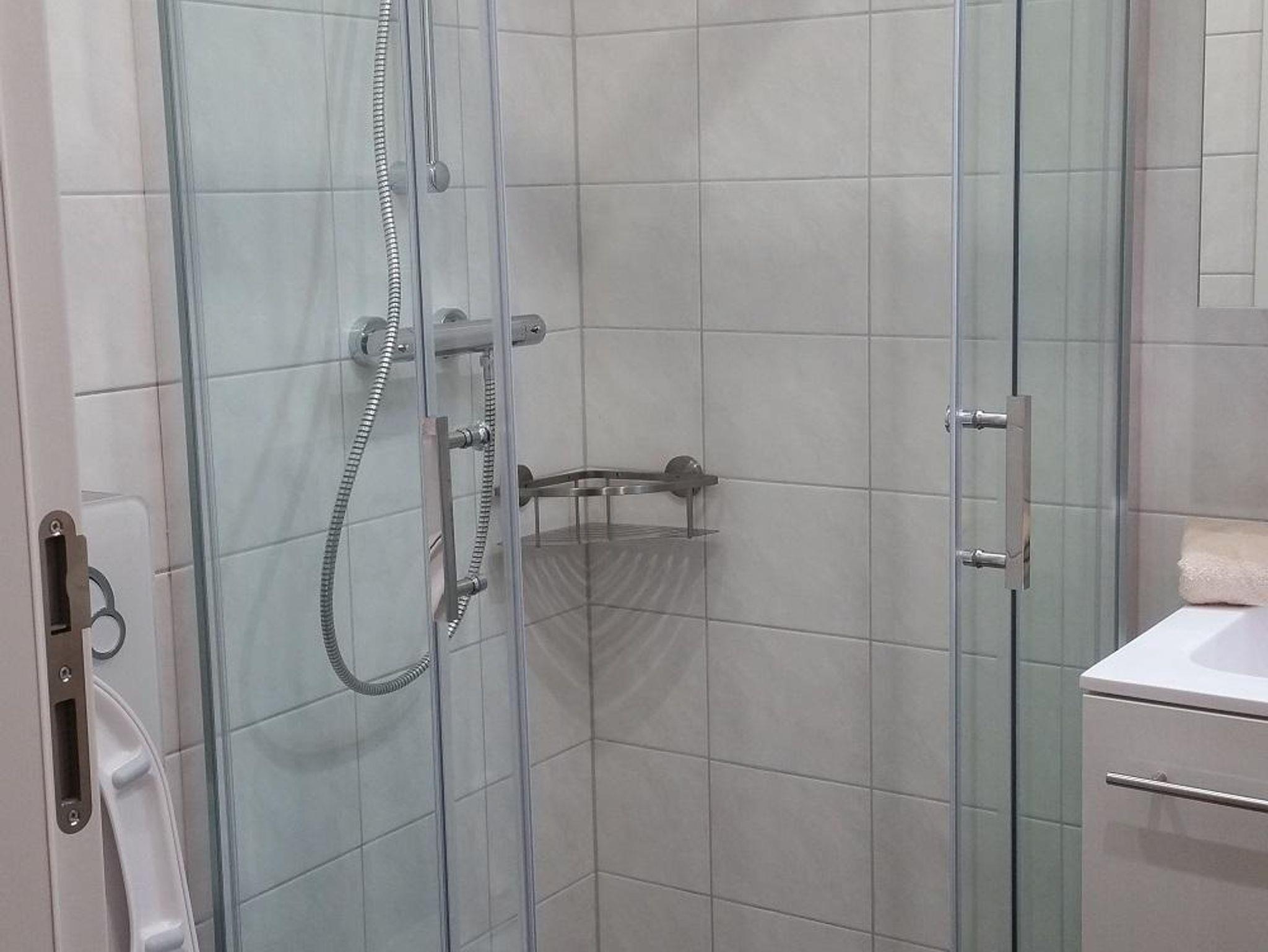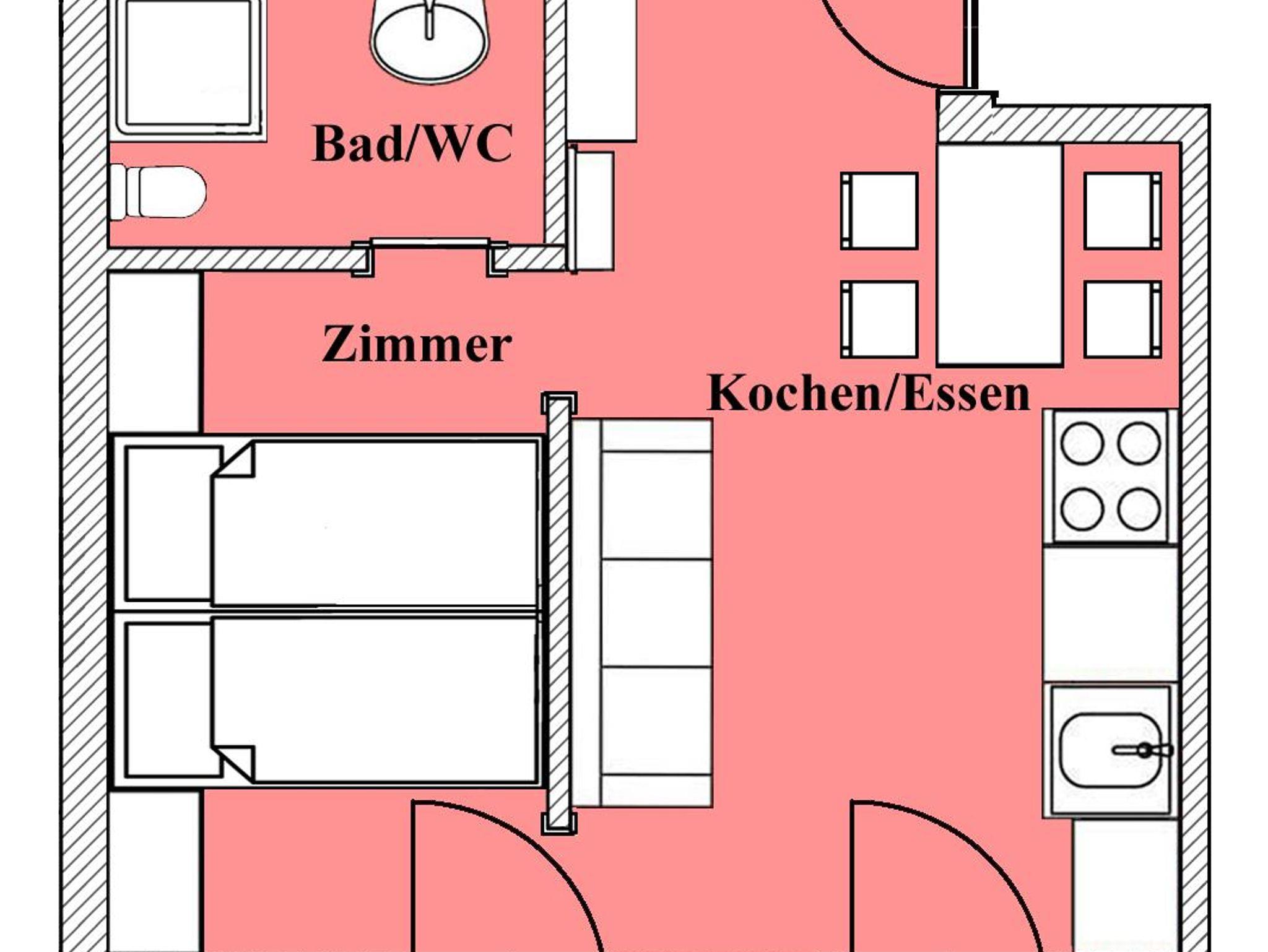 ~ 30 m2 für max. 3 Personen. Eine große Wohnung mit einer Wohnküche mit Küchenzeile mit Ceran Kochfeld, Mikrowelle, Kühlschrank und Kaffeemaschine. Esstisch mit 4 Stühlen und einer Auszieh-Couch, Sat-TV in der Wohnküche, ein Zweibettschlafzimmer, Bad mit Dusche, Waschbecken und WC. Wohnung hat einen eigenen Balkonzugang.