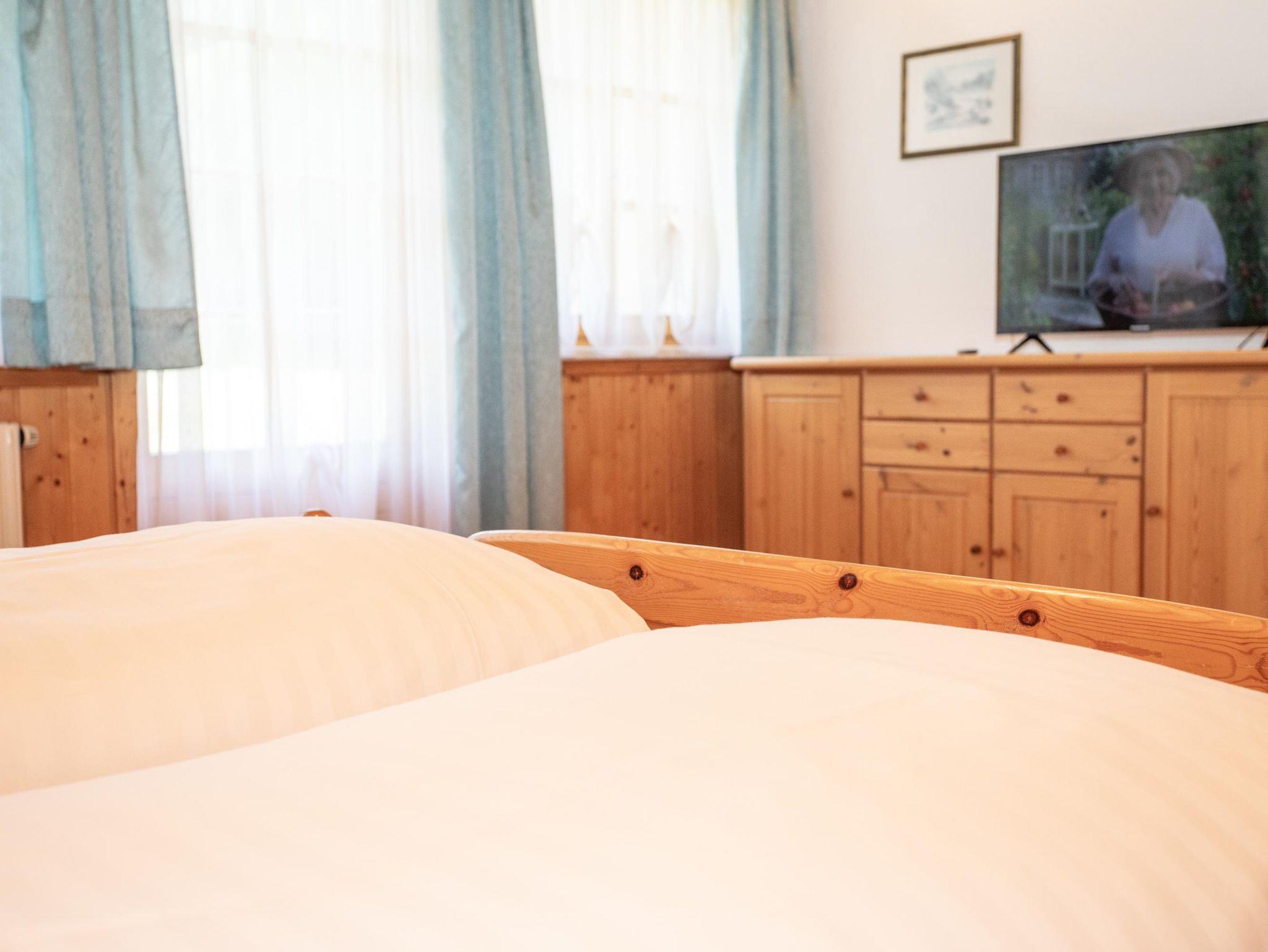 großzügiges Appartement mit zwei Schlafzimmern und Schlafnische im Küchenbereich (1 Schlafzimmer mit Doppelbett und Stockbett, 1 Schlafzimmer mit Doppelbett, 1 Stockbett in Schlafnische), Bad mit Badewanne, separates WC, voll ausgestattete Küche sowie Balkon mit Gartenblick