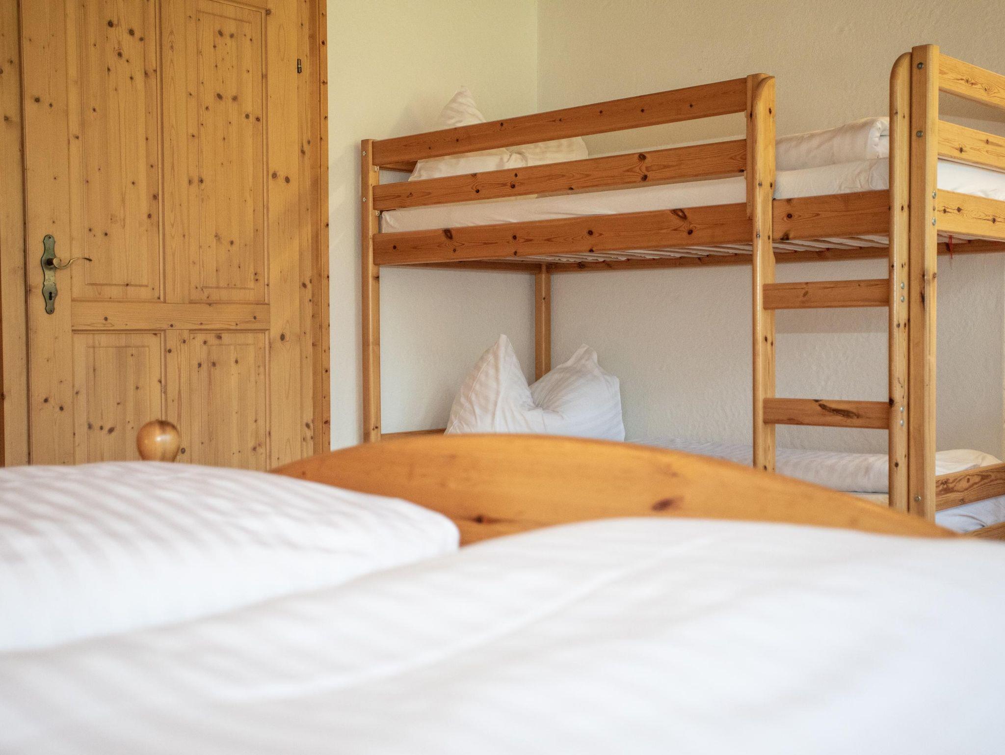 großzügiges Appartement mit zwei Schlafzimmern (jeweils Doppelbett und Stockbett), Bad, separates WC, voll ausgestattete Küche sowie Terrasse mit direktem Gartenzugang