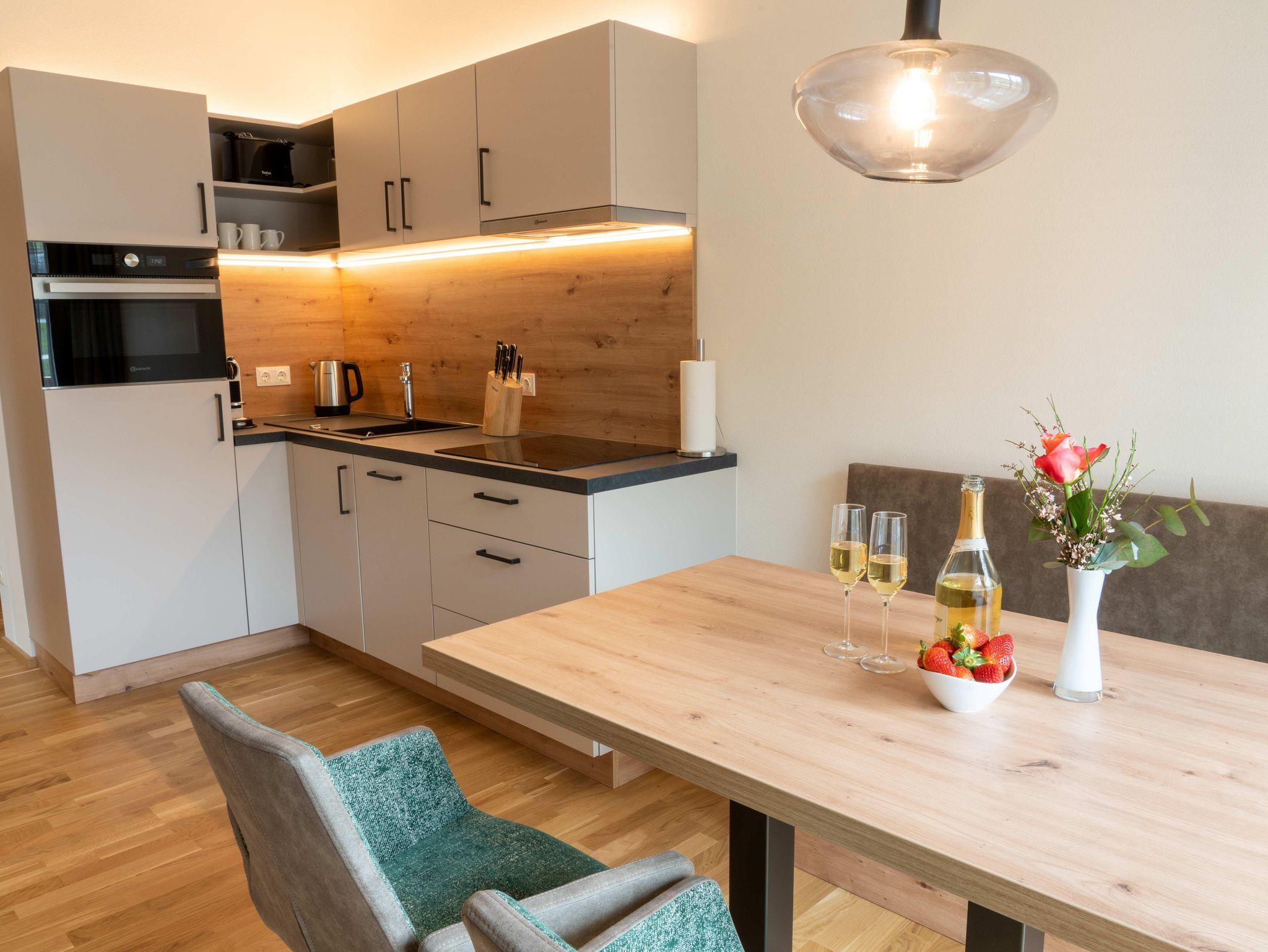 • nagelneuen, topausgestatteten Ferienwohnungen für 1 – 6 Personen mit Wohnküche inkl. „Kitchen-Kit“, 1-2 Schlafzimmern mit hochwertigen „Voglauer“ Betten inkl. Bettwäsche, 1-2 Badezimmern inkl. Handtücher und Haarfön sowie modernen Annehmlichkeiten wie Smart-TV in jedem Zimmer, WLAN, Geschirrspüler, Kühlschrank mit Gefrierfach, Backofen mit Mikrowellenfunktion u.v.m.