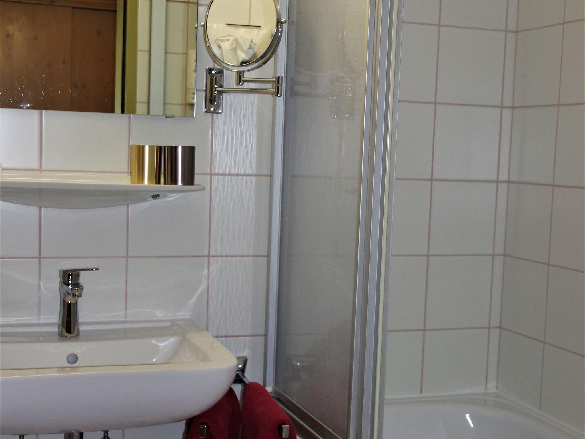Badezimmer mit Dusche oder Badewanne mit getrenntem WC.