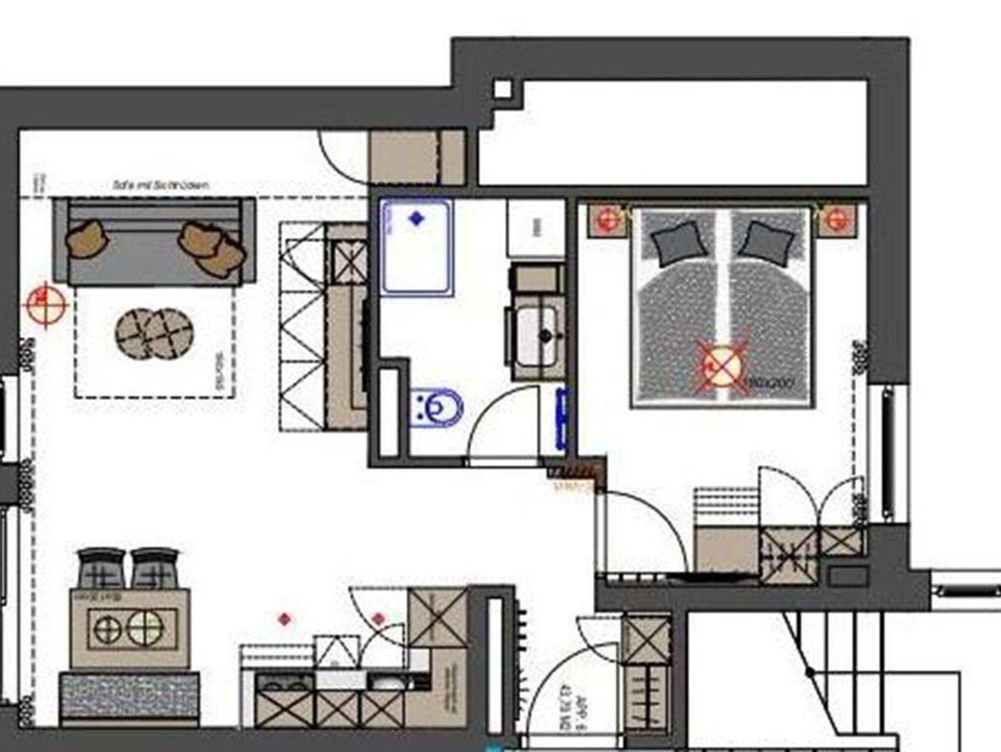 Wohnküche mit Essbereich, 1 Schlafzimmer, Dusche/WC, Schlafsofa, Balkon, Bergblick