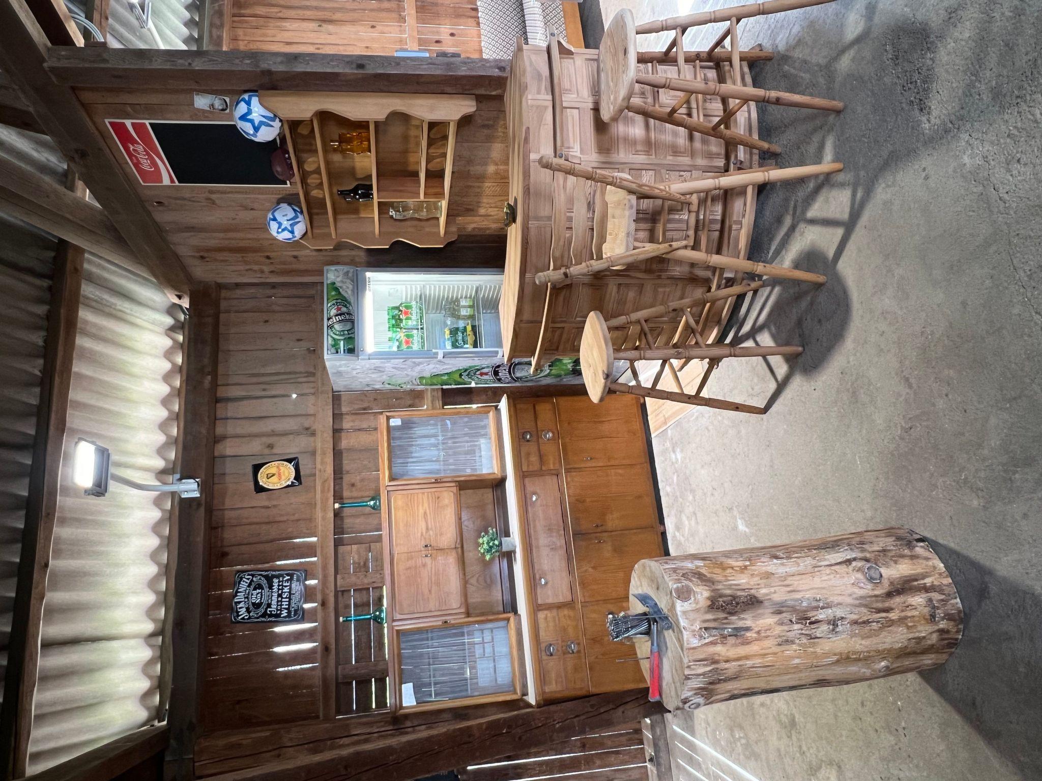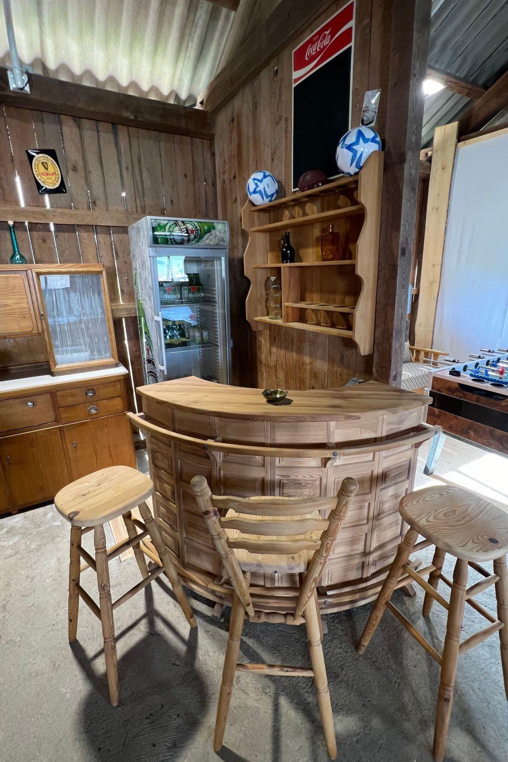- barn with seating, bar, TV and a darts game as well as a nail tree trunk