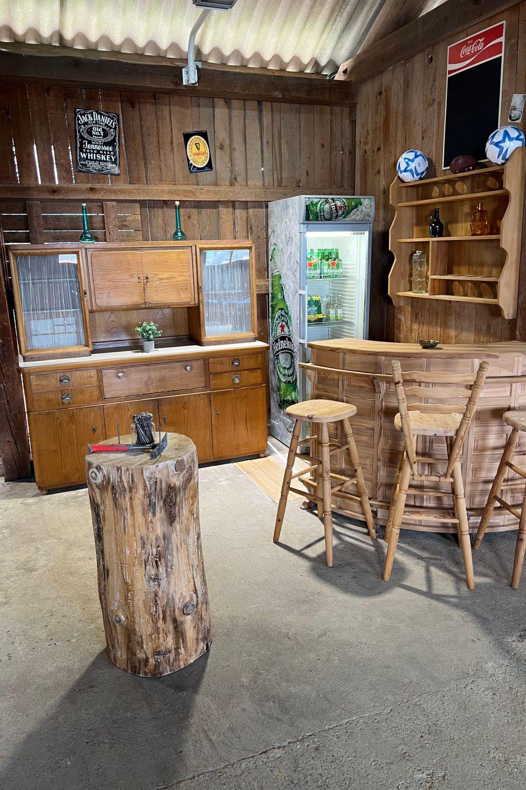 - barn with seating, bar, TV and a darts game as well as a nail tree trunk