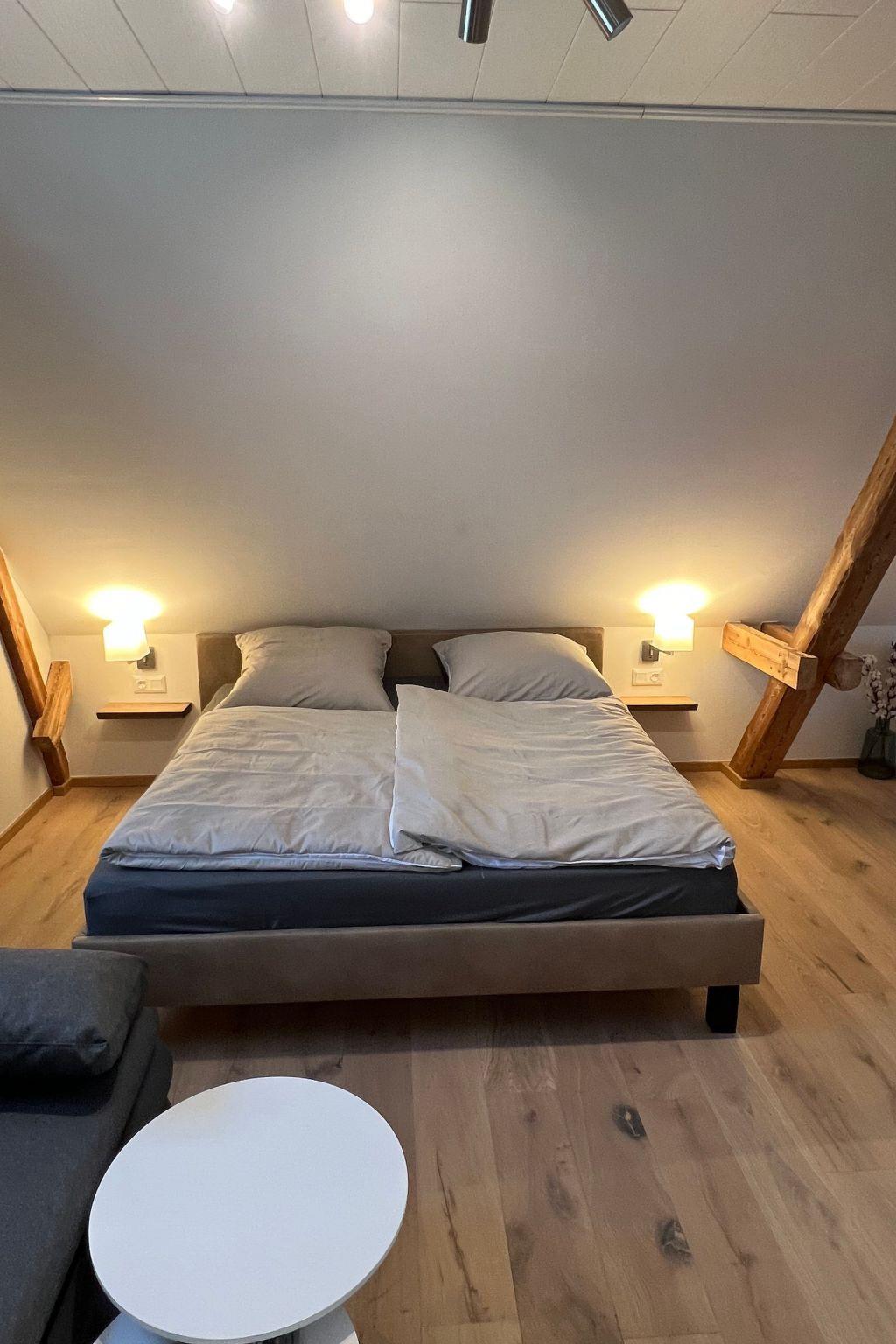 Our two flats are newly renovated and have a spacious bathroom with toilet and shower, as well as a kitchen with living room and a double bed with comfortable Emma mattresses for a good night's sleep.