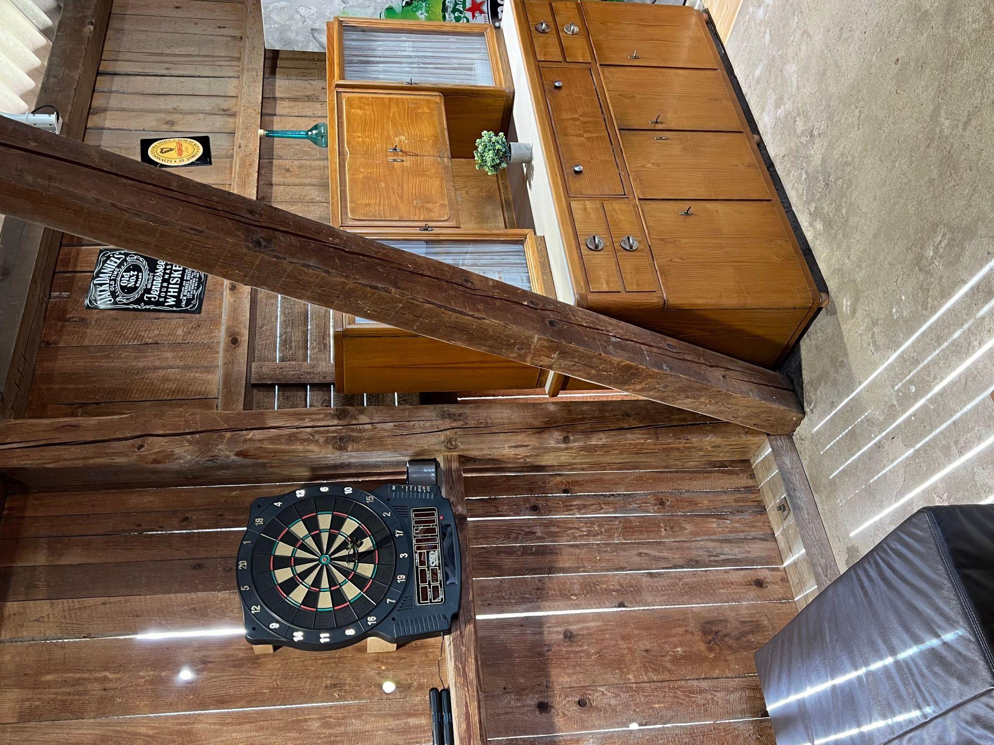 In the barn there is a bar with a couch, a table-tennis table, a game of wuzler and darts, as well as a nail stick for a sociable get-together.