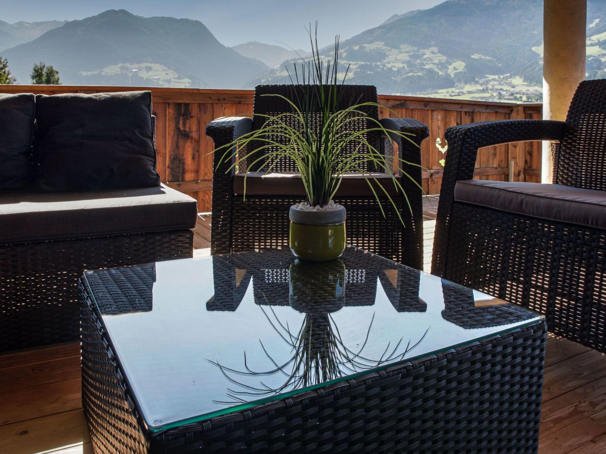 The outdoor area of the chalet invites you to spend relaxing evenings on the south-facing terrace with cosy lounge furniture. Enjoy the music via a second Bose sound system zone outside and watch the deer at the edge of the forest at dusk. This special location also guarantees a breathtaking view of the Zillertal Alps and optimal sunshine until late in the evening.