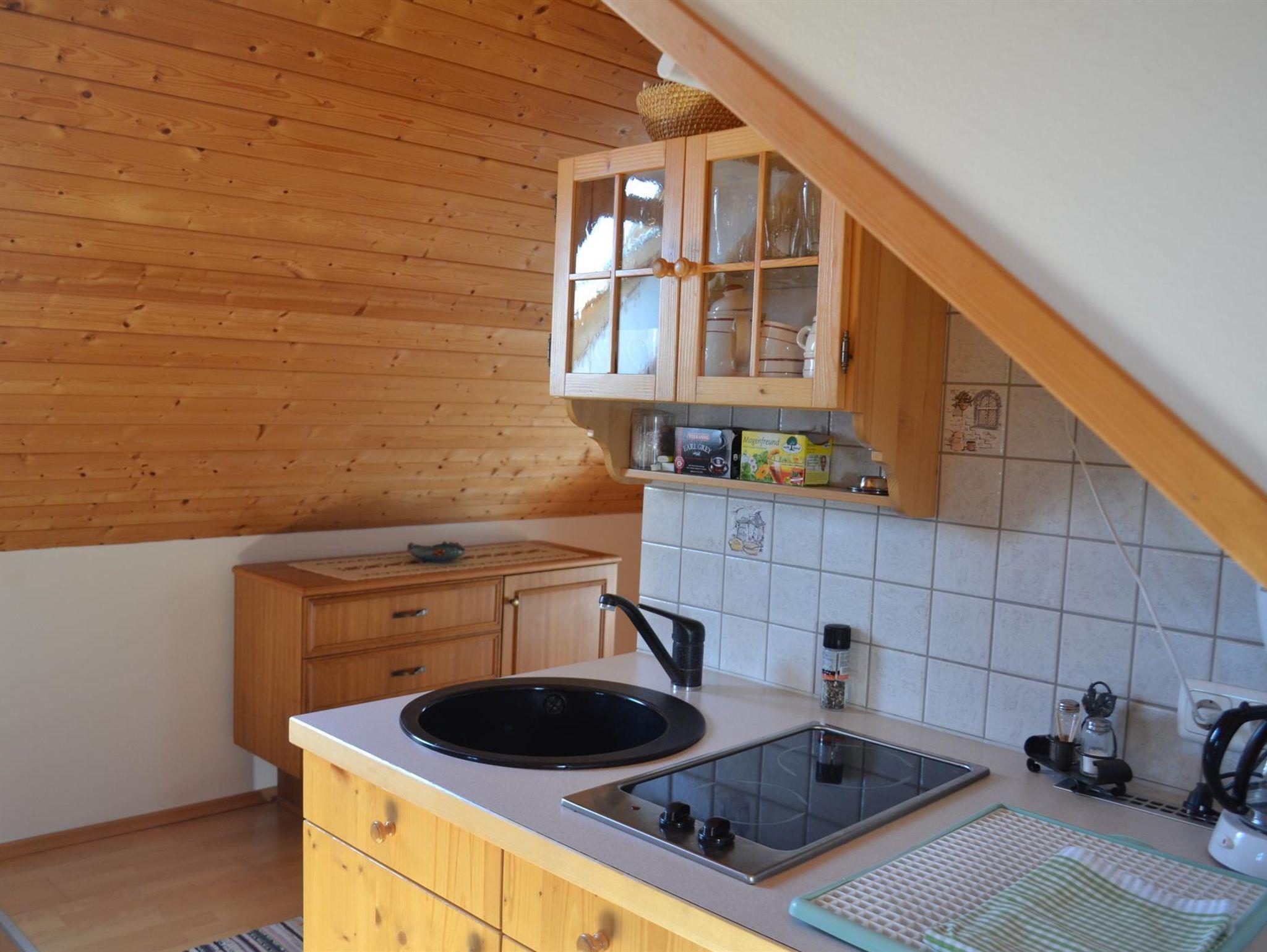 Ferienwohnung mit ca. 40 qm Wohnfläche im Dachgeschoss (Schlafzimmer mit Doppelbett und zwei Zustellbetten), TV, Dusche, WC, Kochecke, überdachter PKW-Abstellplatz, Sitzterrasse.
