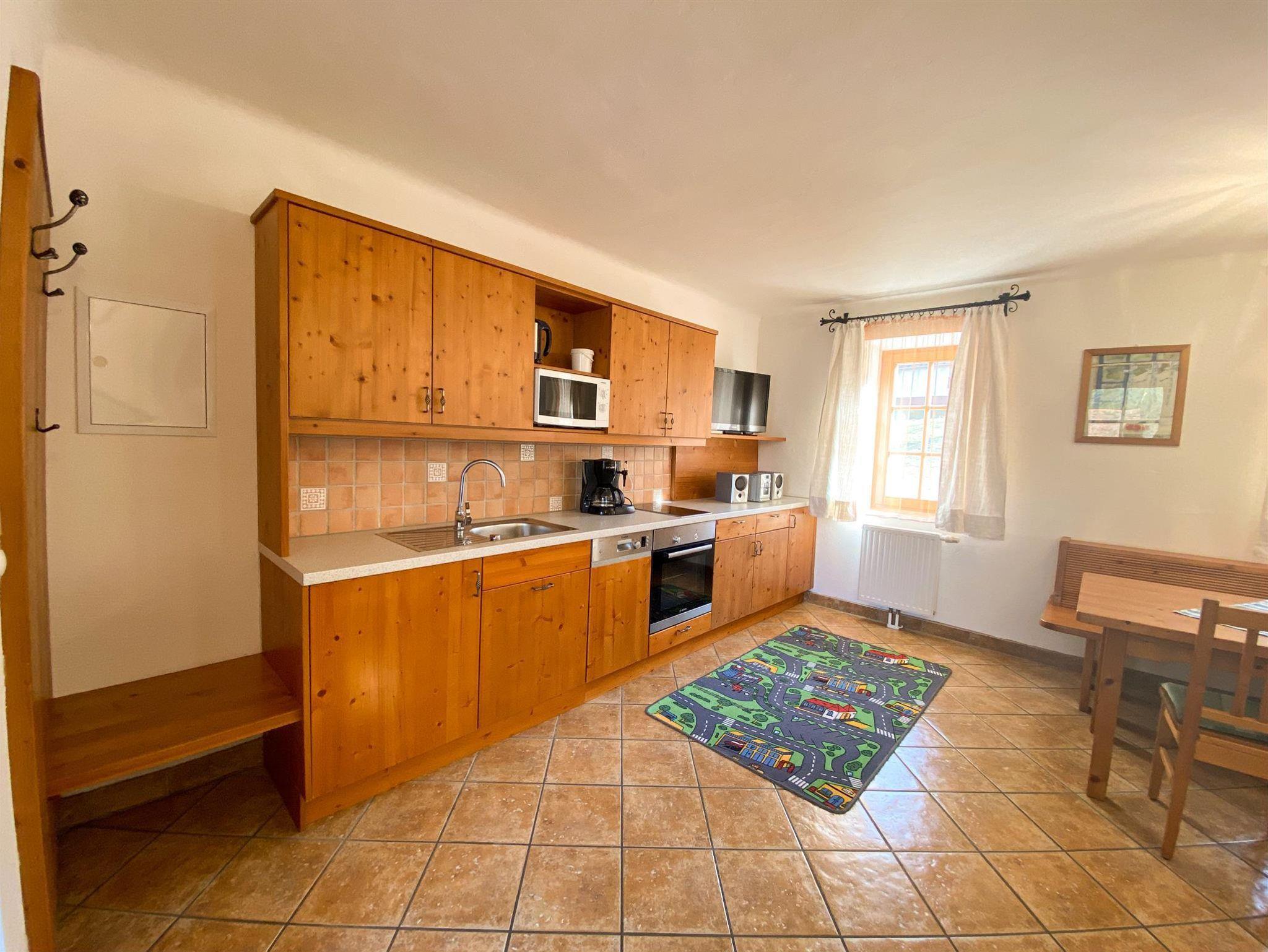 1 Wohnraum mit urigem Kuchlherd, Sitzecke, Kochnische (2 Kochplatten, Backrohr, Mikro, Kühlschrank, Geschirrspüler, Kaffeemaschine, Mixer, Geschirr, Gläser), Sat-TV, ADSL-Internetzugang, Hifi-Anlage, Garderobe, 1 Schlafraum mit Himmelbett und Schrank, 1 Kinderzimmer mit 3 Einzelbetten (1x Stockbett), 1 Dusche/WC mit Fön und Radio.