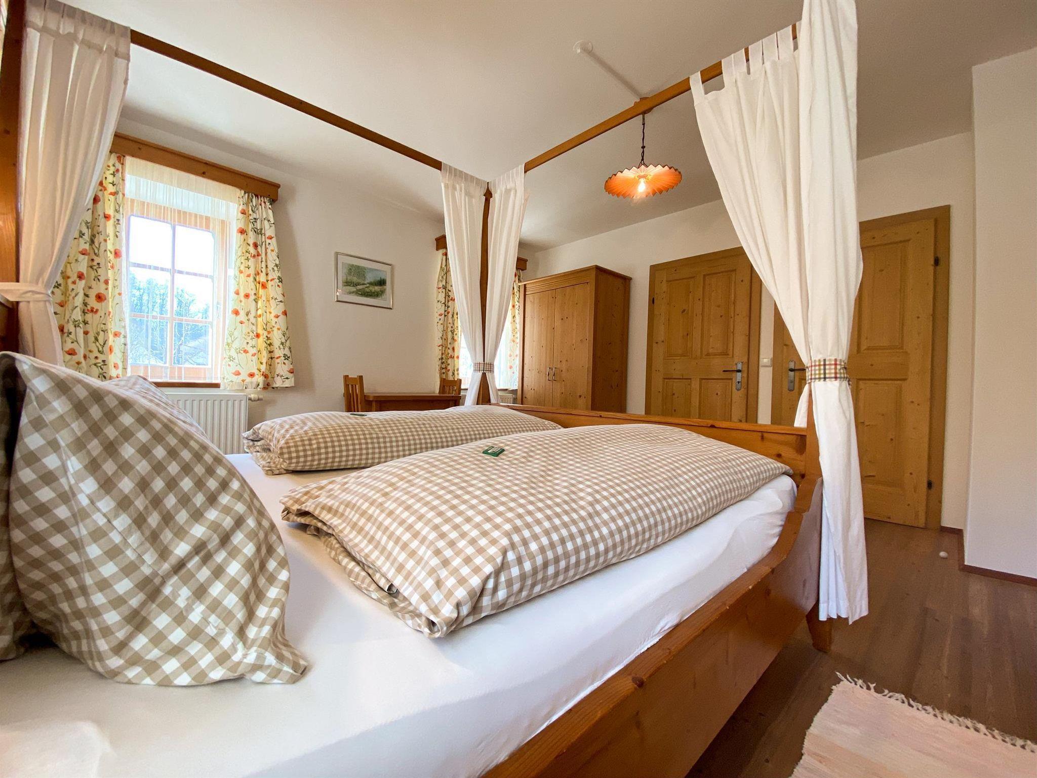Wohnen in der ehemaligen Bauernkuchl. Rein ins tischlergefertigte Himmelbett, Karniesen und Leuchten vom Kunstschmied, geölte Lärchenböden.