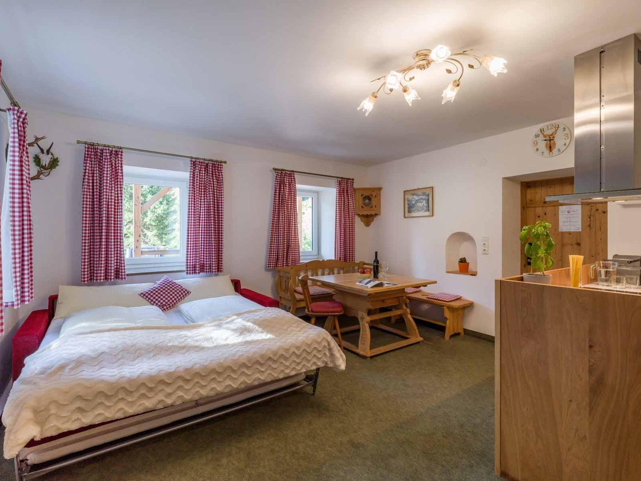 Die vollausgestattete Wohnküche inklusive Essecke mit Massivholztisch sowie einem gemütlichem Couchbett für 2 Personen grenzt an das Schlafzimmer mit Doppelbett (160 x 200).