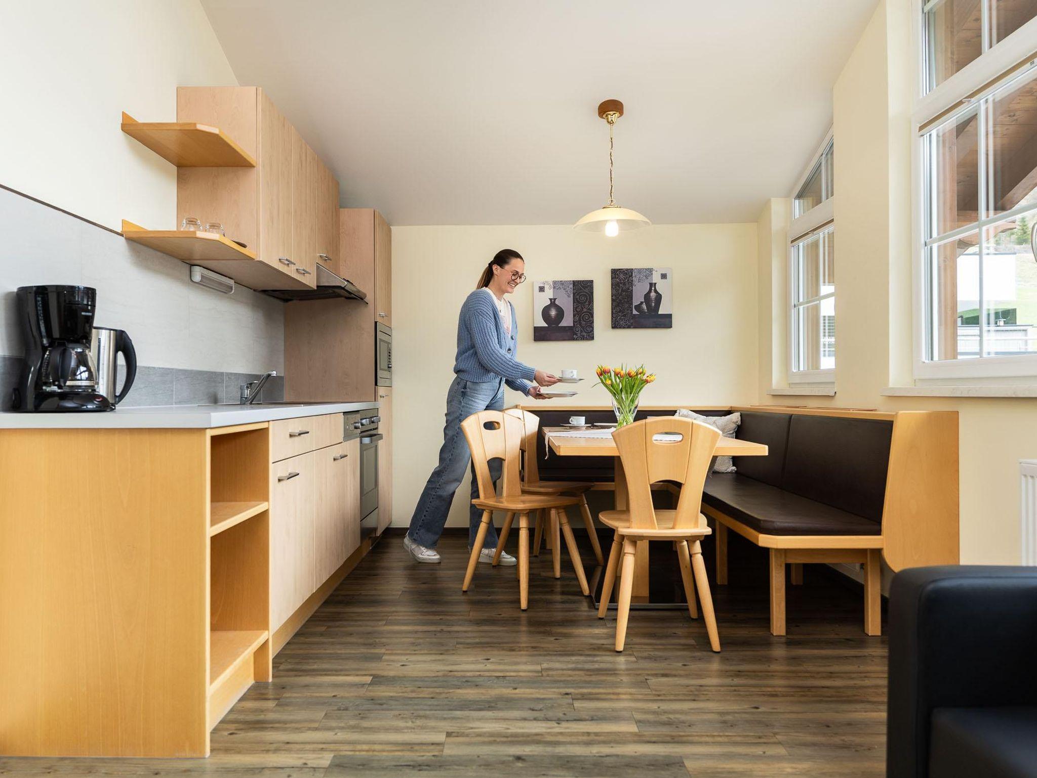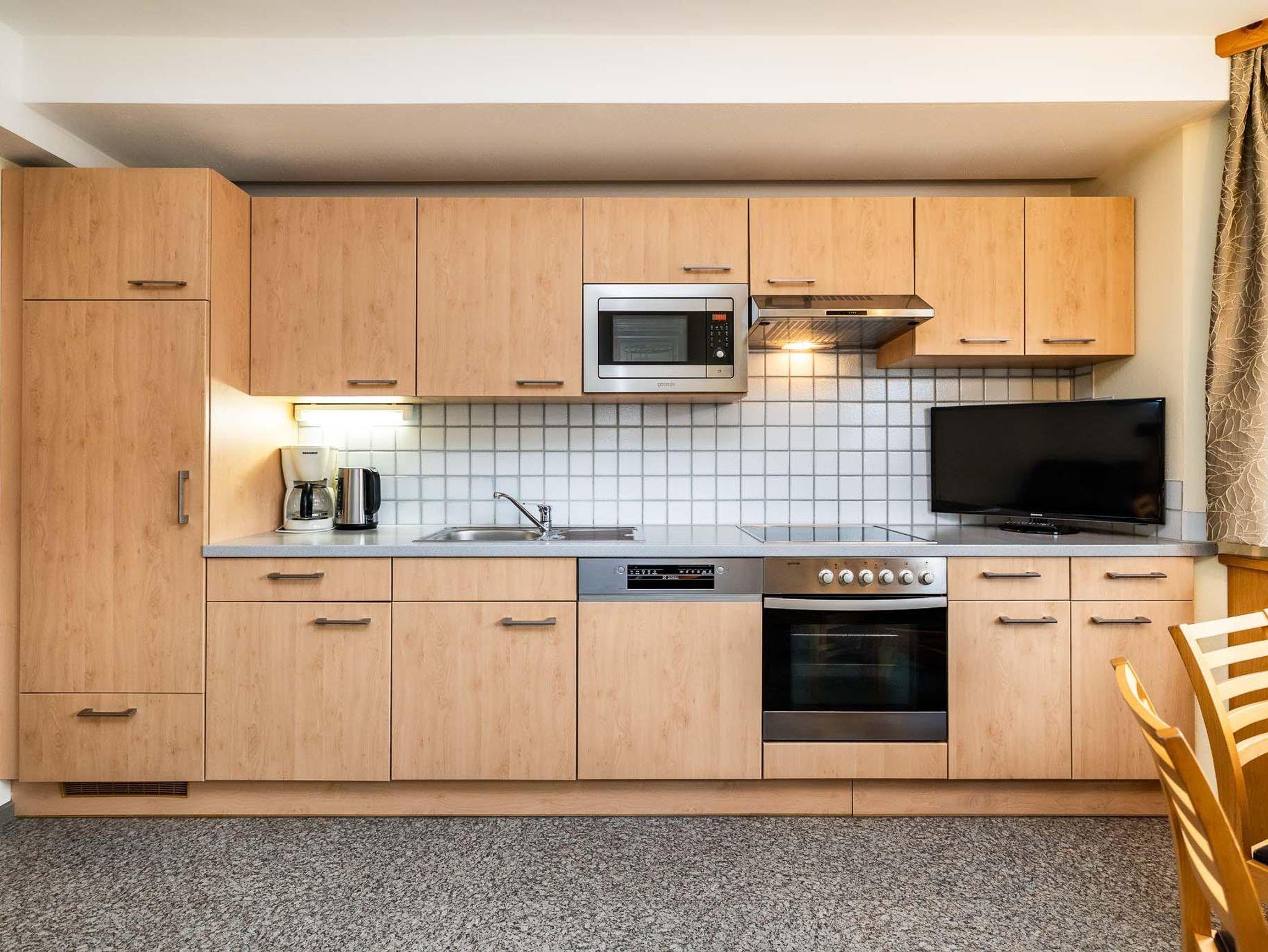 Wohnraum mit komplett ausgestatteter Küche oder Kochnische (von den Schlafräumen getrennt)