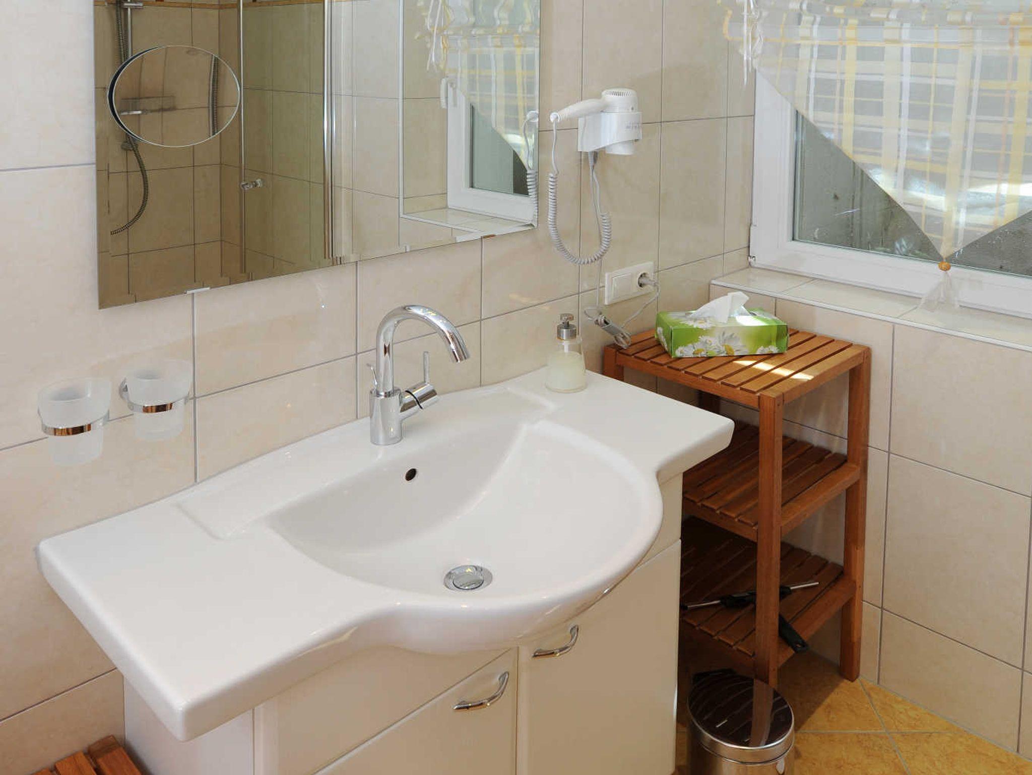 für 2 - 6 Personen, Vorraum, 1 Schlafzimmer groß für 2 Personen mit SAT-TV und Dusche/WC, 1 Schlafzimmer klein mit getrennten Betten und Dusche mit kl. Saunakabine, 1 WC extra, Wohnzimmer mit SAT-TV und Schlafmöglichkeit für 2 Personen, die Küche (eigener Raum mit Tür)komplett mit Kühlschrank, Eisfach, Filterkaffeemaschine und Nespresso-Kapselmaschine, Backrohr, Geschirrspülmaschine, Mixer, Toaster, Eierkocher, Wasserkocher, Radio, Terrasse, Wiese, Tischtennistisch, Dart, Spiele für Kinder