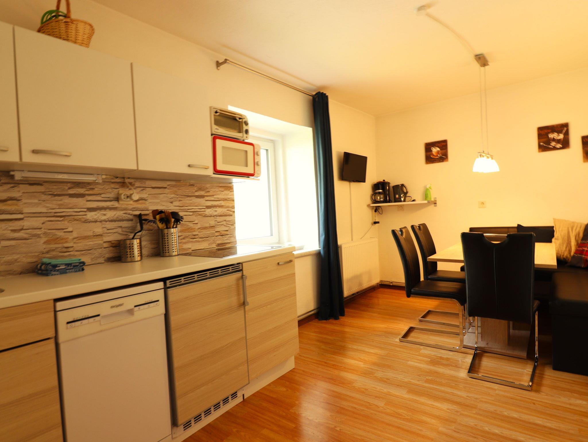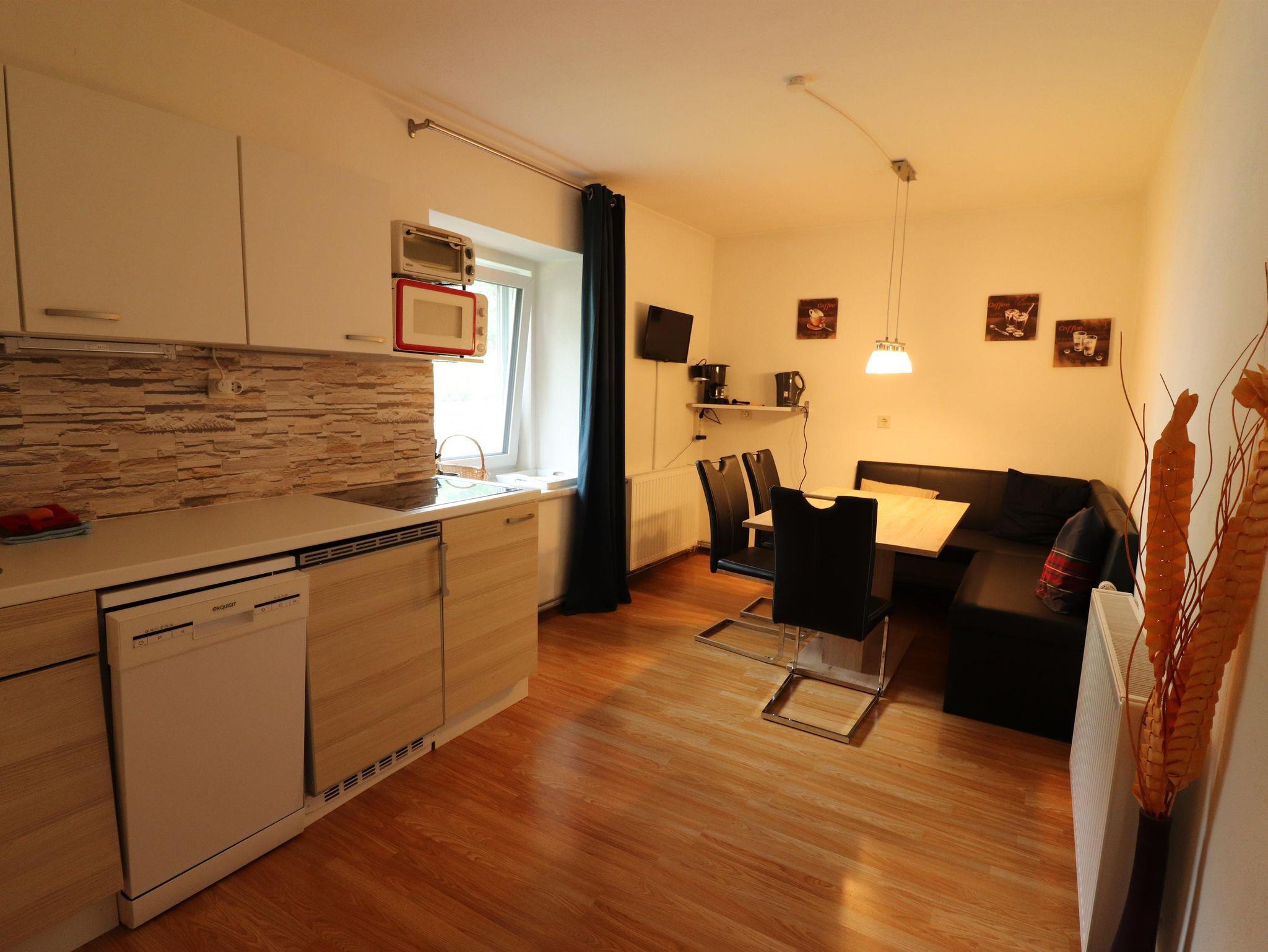 Familienapartment mit grosse Wohnküche, ein Zimmer mit Doppelbett und ein Zimmer mit zwei Etagenbetten. Douche/WC und ein Balkon.