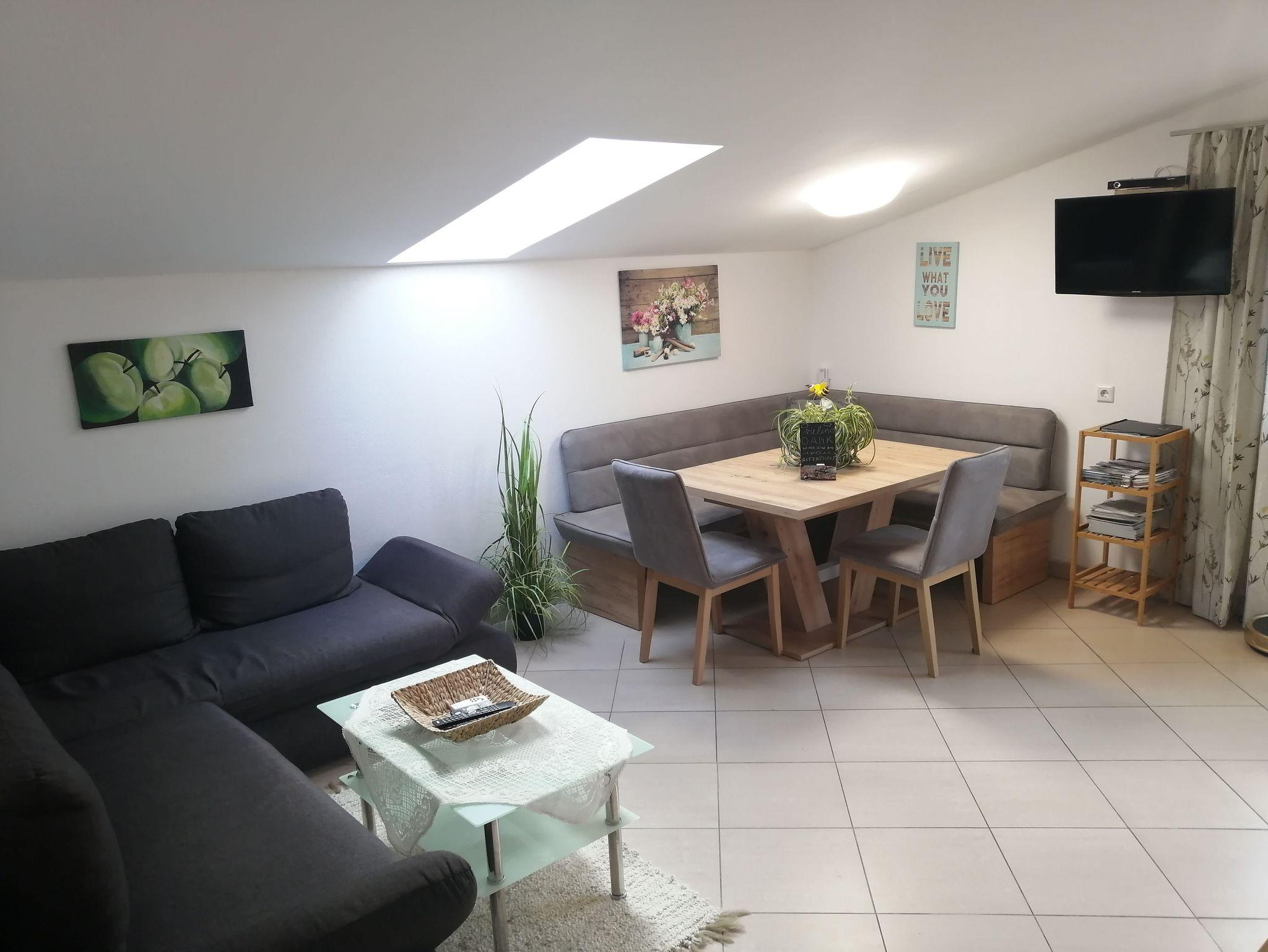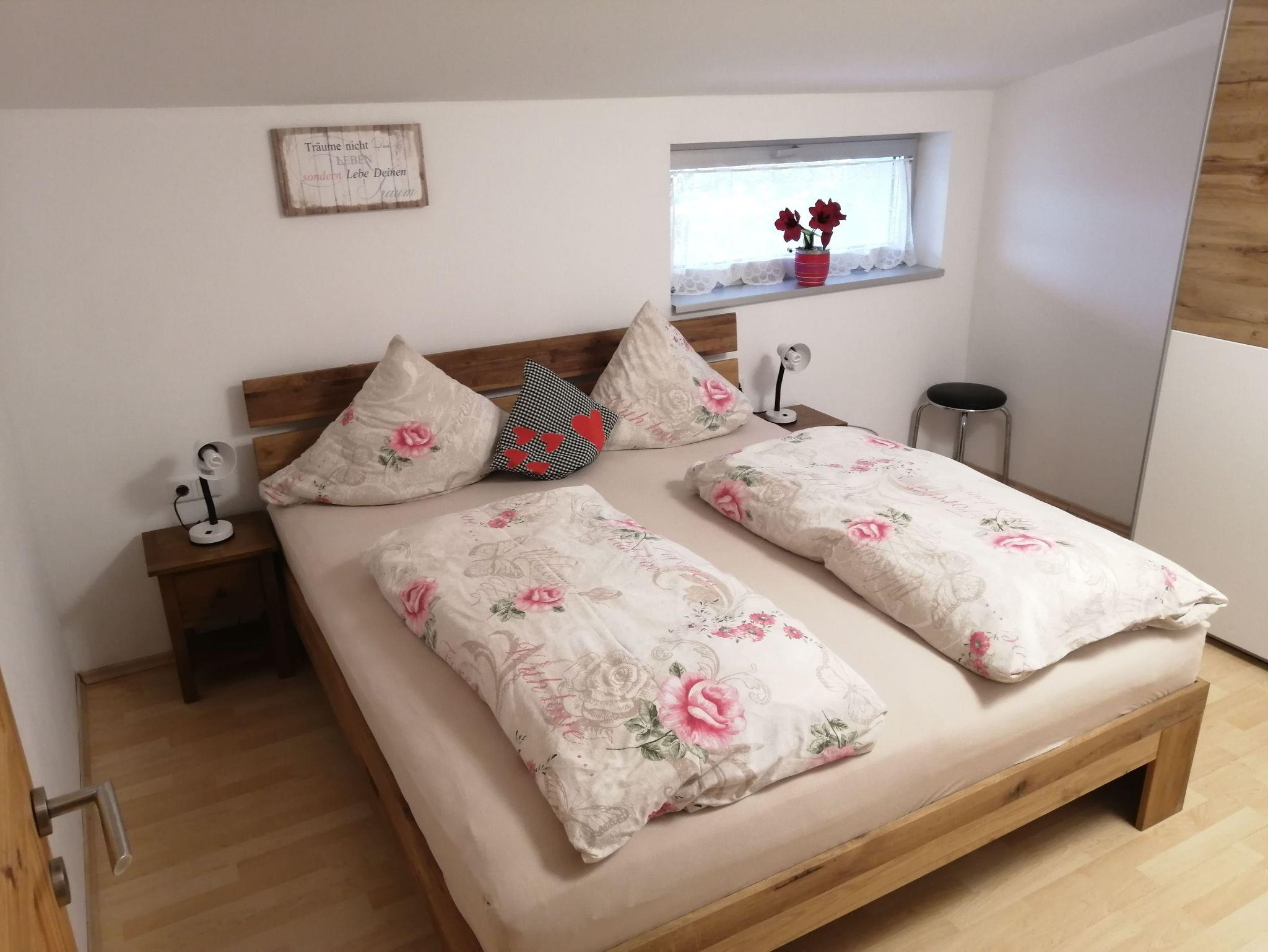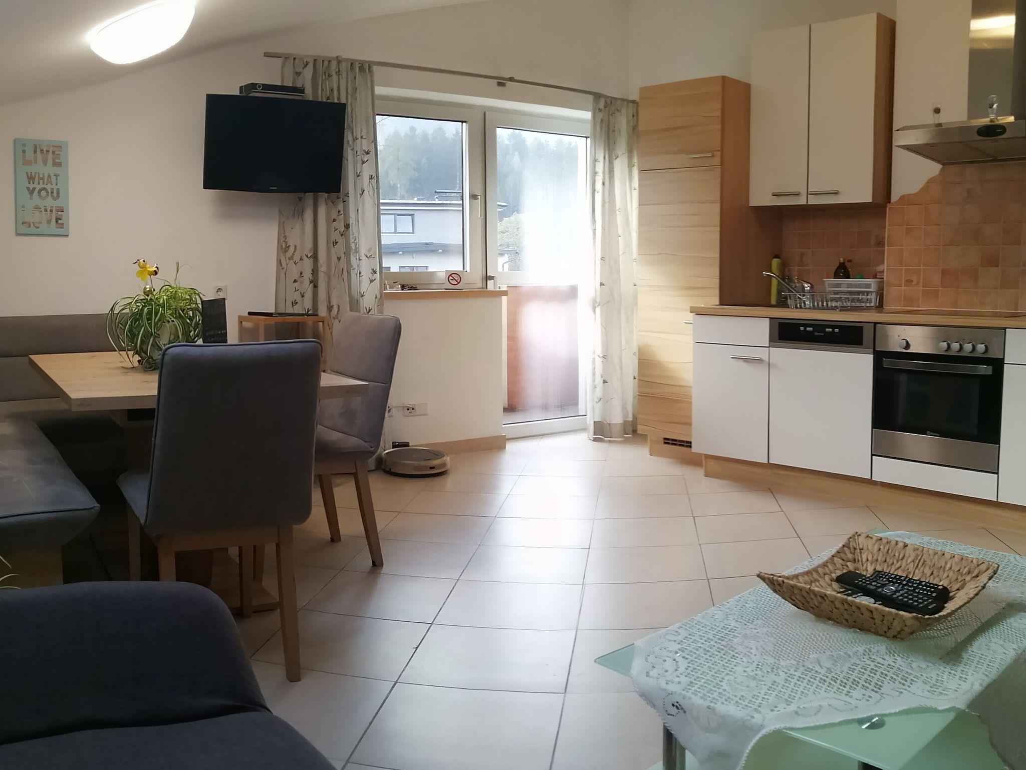 Diese traumhafte Ferienwohnung im 1. Stock besteht aus einer Wohnküche mit Essecke, Wohnlandschaft, TV/Sat, südseitiger Balkon und einem Doppelzimmer. Die Küche ist bestens ausgestattet (Geschirrspüler, Backrohr, Tiefkühleinheit etc.) Handtücher, Geschirrtücher , Bettwäsche und Toilettepapier inkl. Die Wohnlandschaft kann auch als Bett für 2 Kinder /Jugendliche umgebaut und verwendet werden. Großes Bad mit Badewanne, Dusche und WC. Kinder können im Garten die Spielgeräte nützen. Kostenloses W-Lan und Parkplatz vor dem Haus.
