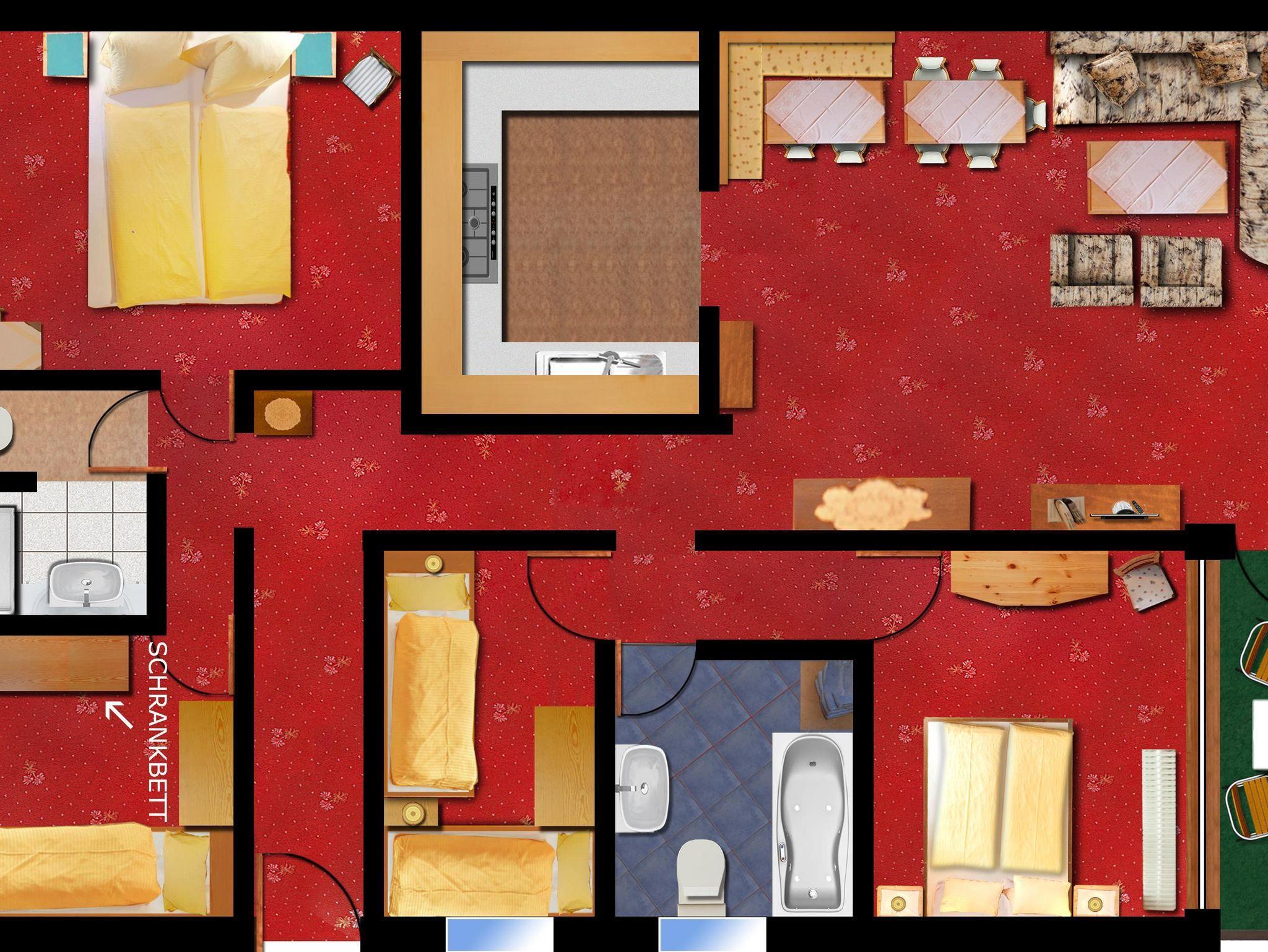 2 Doppelzimmer, Einzelzimmer, 2-Bettzimmer, Bad/WC und Dusche/WC, großer, gemütlicher Wohn-/Schlafraum und Balkon.
