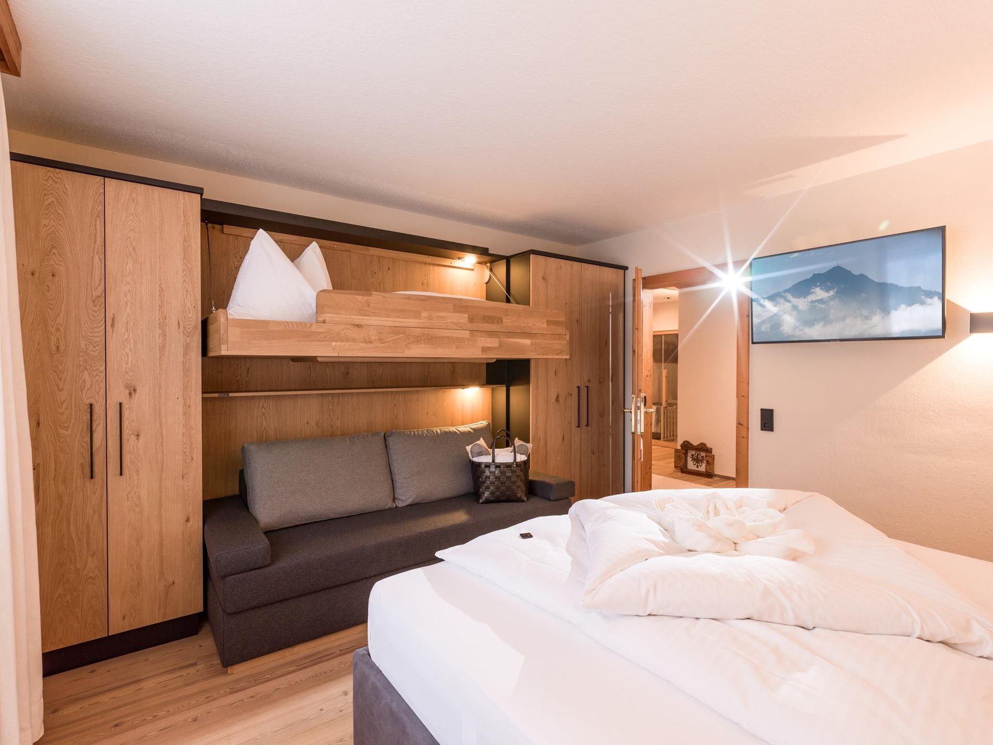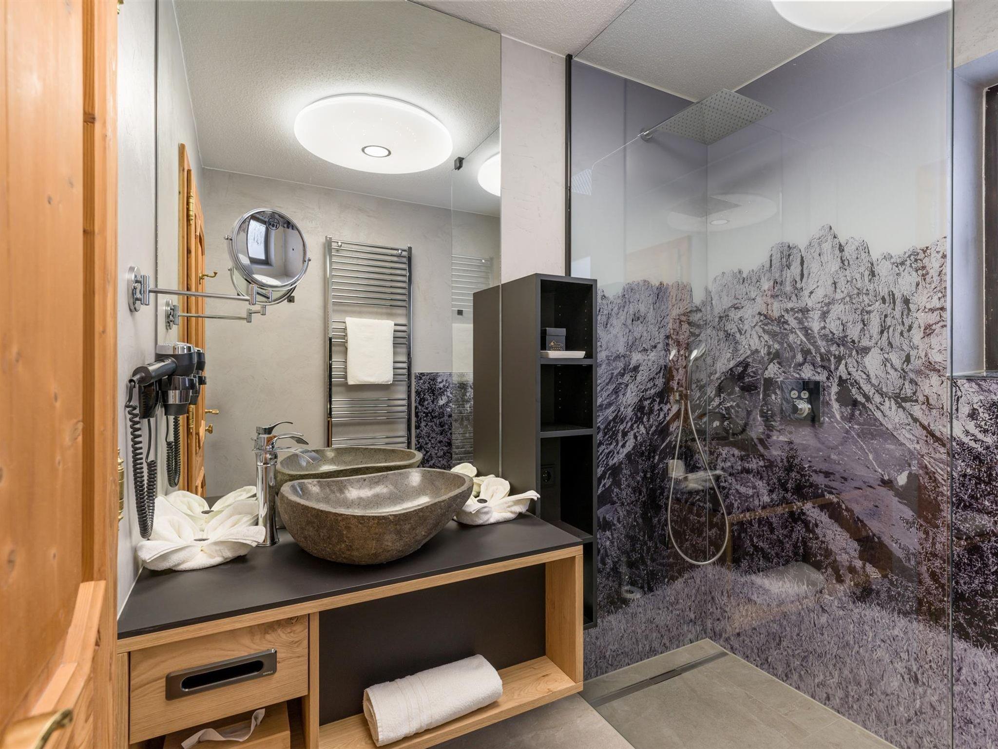 Diese Suite hat ca. 80m², verfügt über 2 Schlafzimmer, ein Wohn-Schlafzimmer, Küche, Bad/WC nochmals WC, 3x Sat-TV, Föhn, Safe, Bademäntel, große Terrasse mit eigenem Whirlpool im Freien.