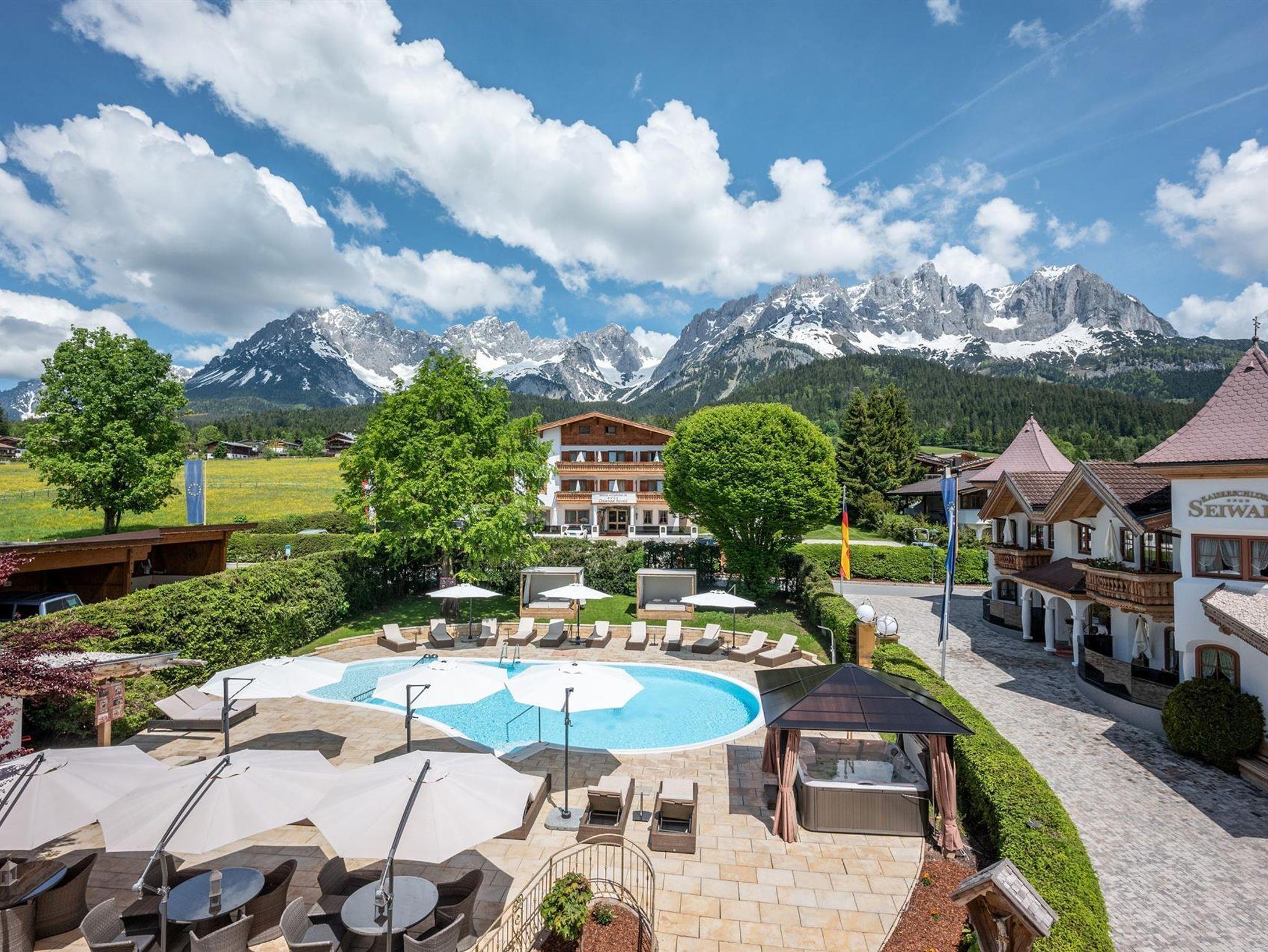 Herzlich willkommen im Familien-Wellnessresort Seiwald! Die Hotelanlage liegt sonnig und ruhig, in bester Lage von Going, 200m oberhalb vom Hotel Stanglwirt im Ortsteil Prama. In unserem familiär geführten Hotel, dem Kaiserschlöss'l und dem gegenüberliegendem Chalethotel können mehr als 100 Gäste unvergessliche Urlaubstage erleben. 10 Gehminuten ins Ortszentrum. Der kostenlose Skibus hält direkt am Hotel. Der berühmte Goinger Badesee, eine Reithalle, der Eislaufplatz und die Langlaufloipen sind vom Hotel in nur 5 Gehminuten erreichbar. Bei Schönwetter lädt der beheizte Außenpool zum Verweilen ein. Sollte Petrus mal streiken können Sie unser großes Erlebnis-Hallenbad genießen. Auf über 2.000 m² Wellnessbereich erwarten sie das Hallenbad mit Whirlpool, Sprudelbank und Luftsprudel, umgeben von einem sagenhaftem Bergbauerndorf mit Mühlrad mit Blick auf Going. Weiters ein großes Saunadorf mit türkischem Dampfbad, Sauna-Schwitzstube, Tepidarium, Solegrotte, Kneippstrasse in den Ötzikäteraum im Felsen, Infrarot-Wärmekabine sowie eine Schönheitsfarm mit Massage und Kosmetik.