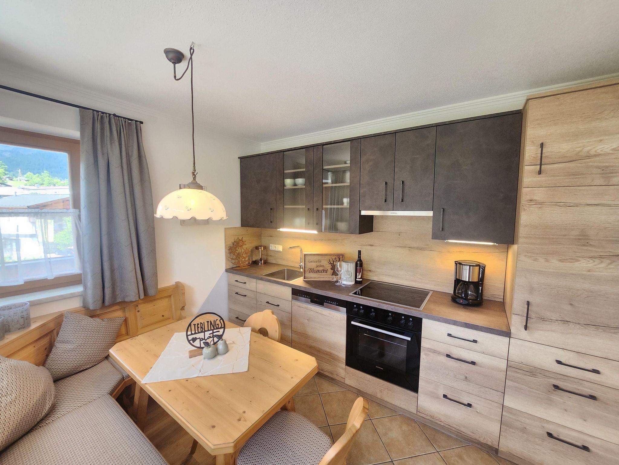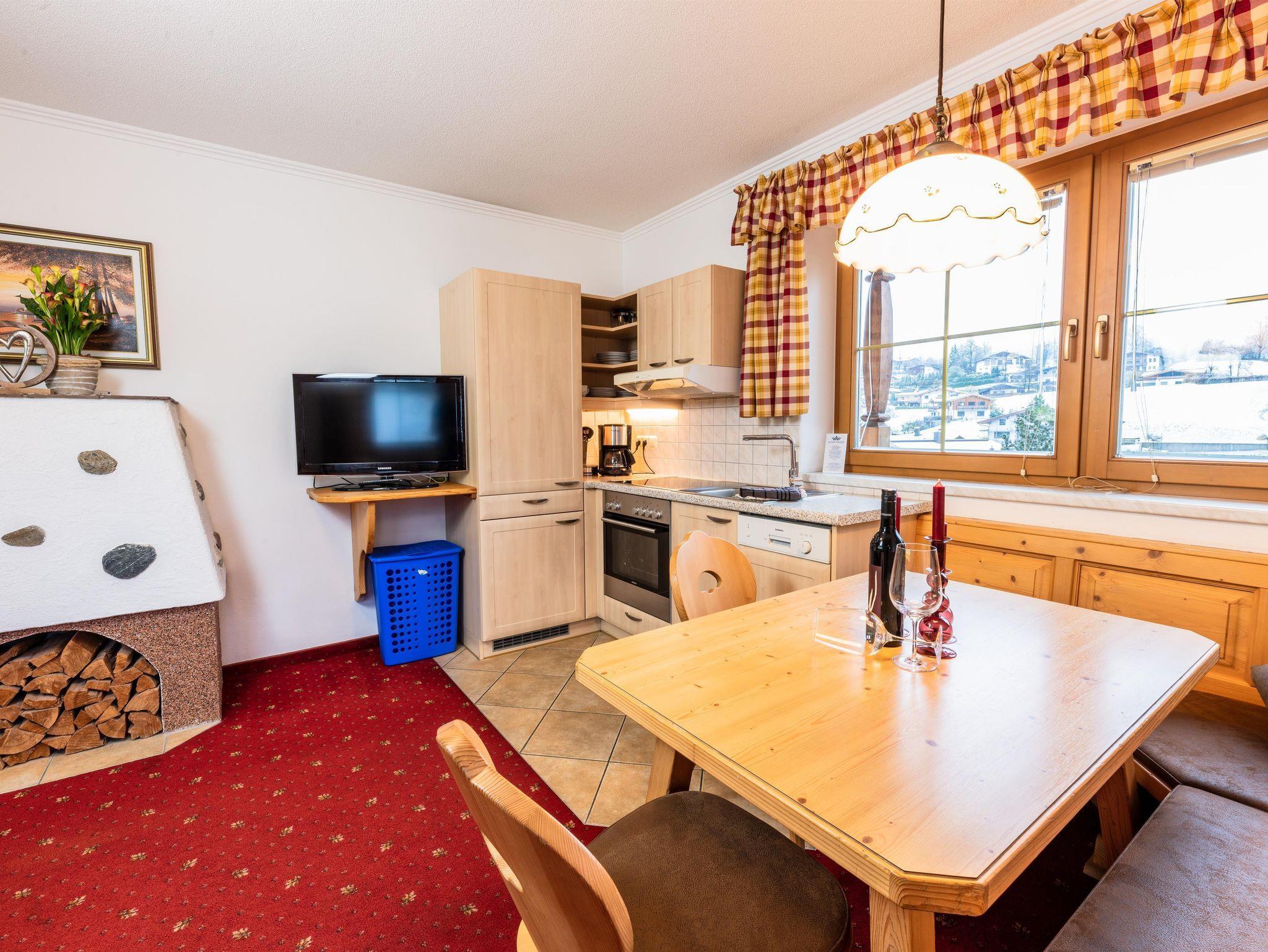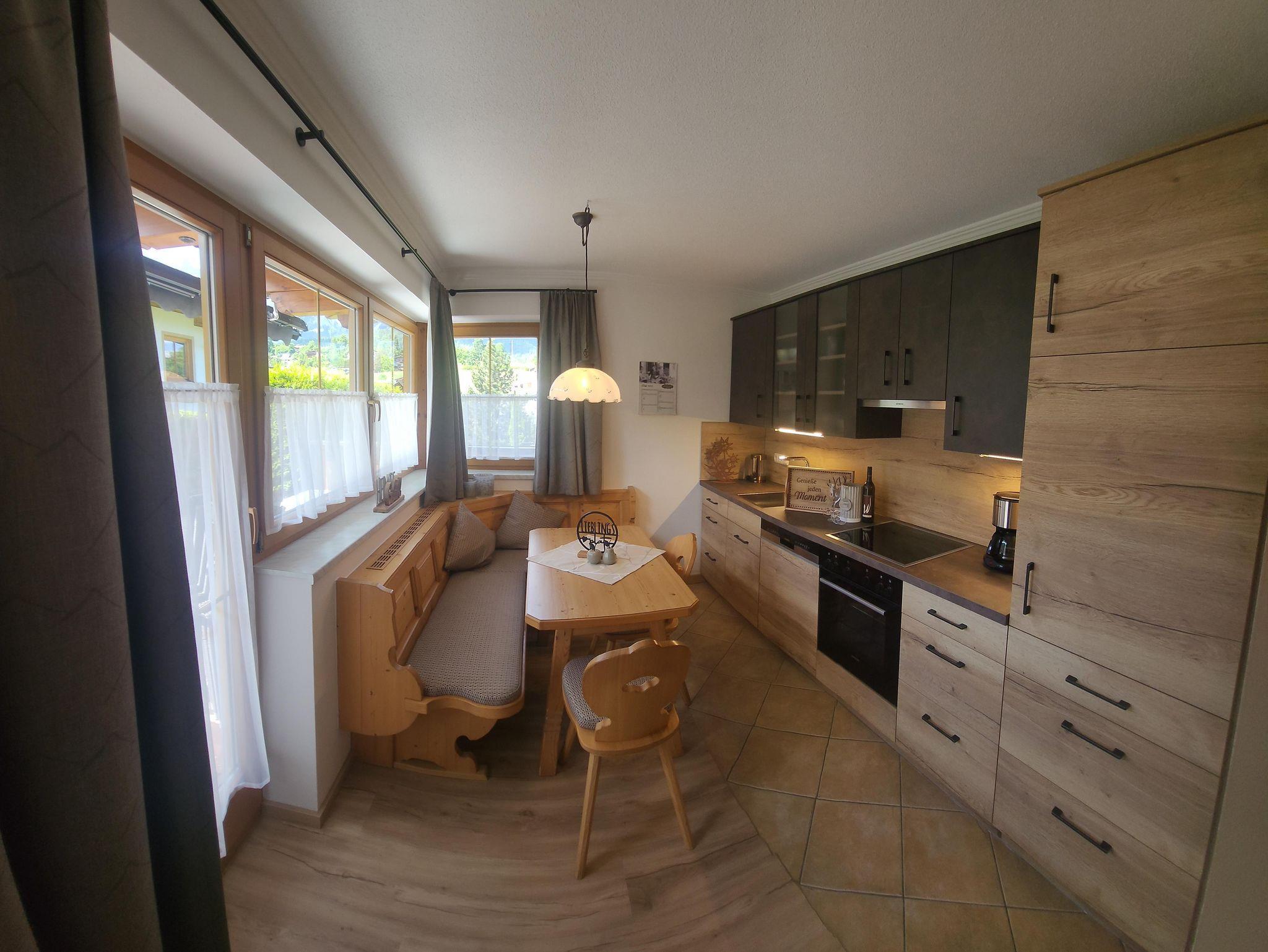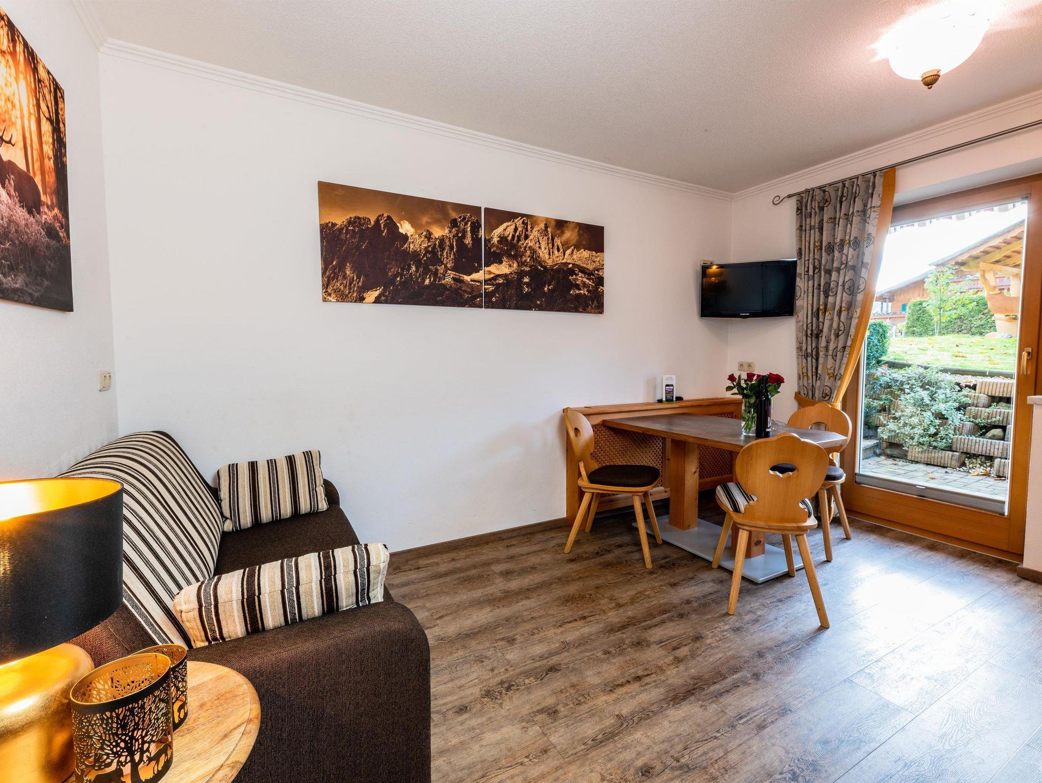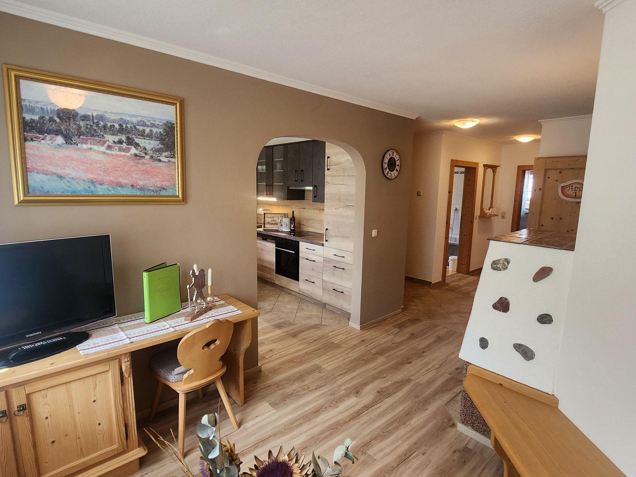 Das Appartement 1 liegt im Erdgeschoss. Es verfügt über eine eigene Terrasse mit Blick Richtung Westen auf den Dorfplatz und nach Norden zum Wilden Kaiser. Im Schlafzimmer befinden sich ein Doppelbett, Schreibtisch, Fernseher sowie ein Kachelofen zur Verfügung. Durch einen Rundbogen gelangen Sie in die großräumige Küche. Die Terrasse ist über die Küche zugänglich.