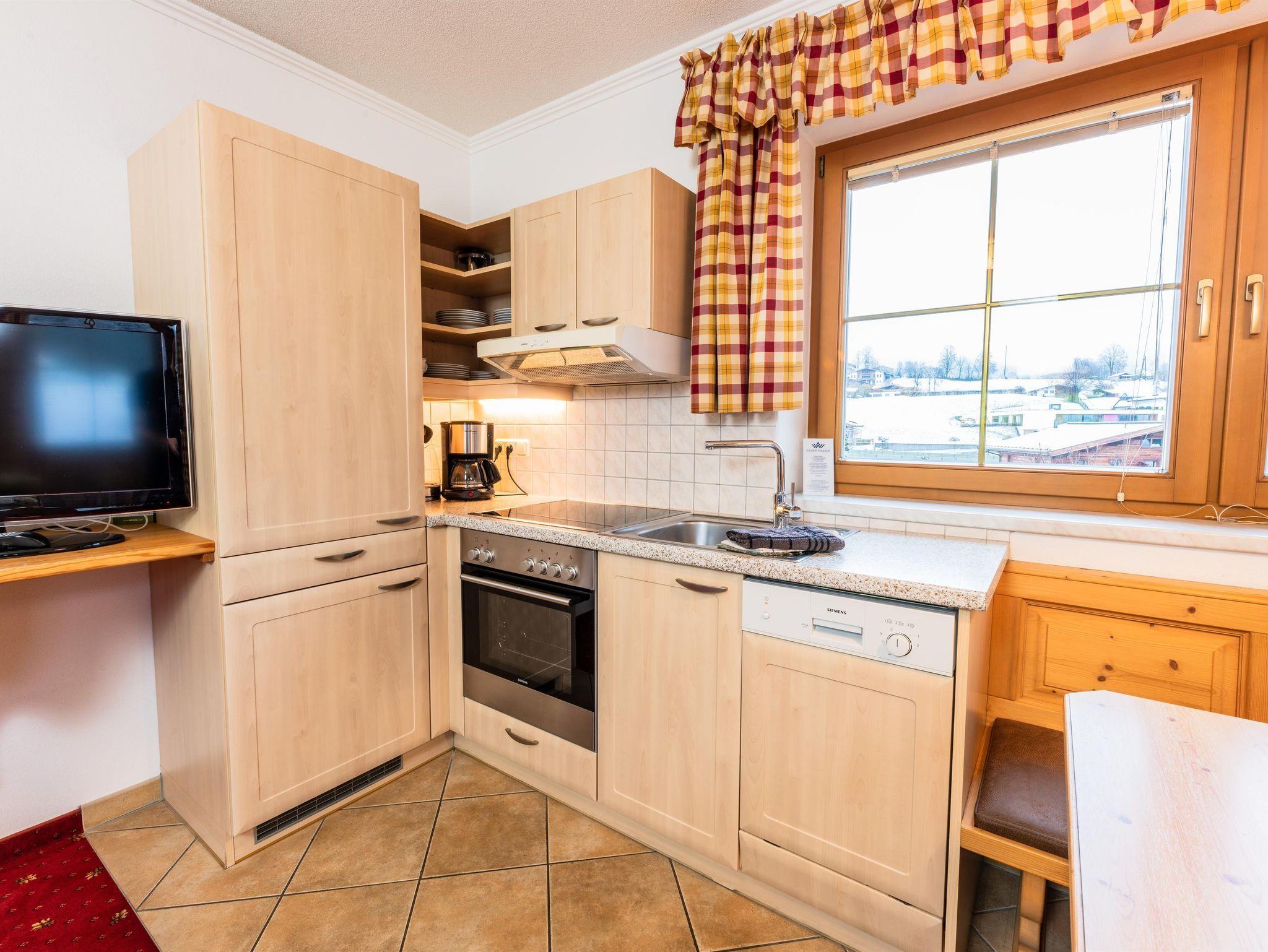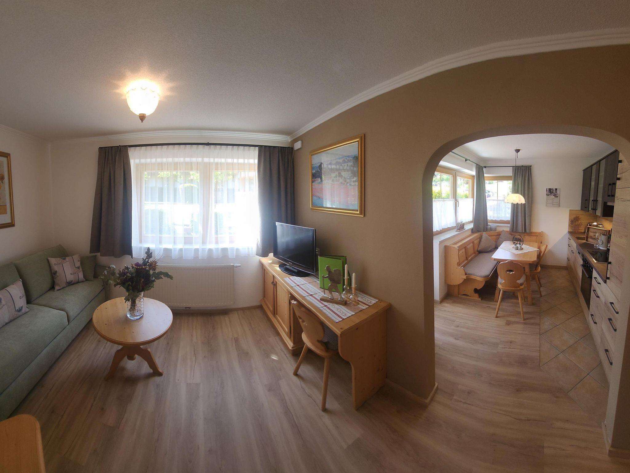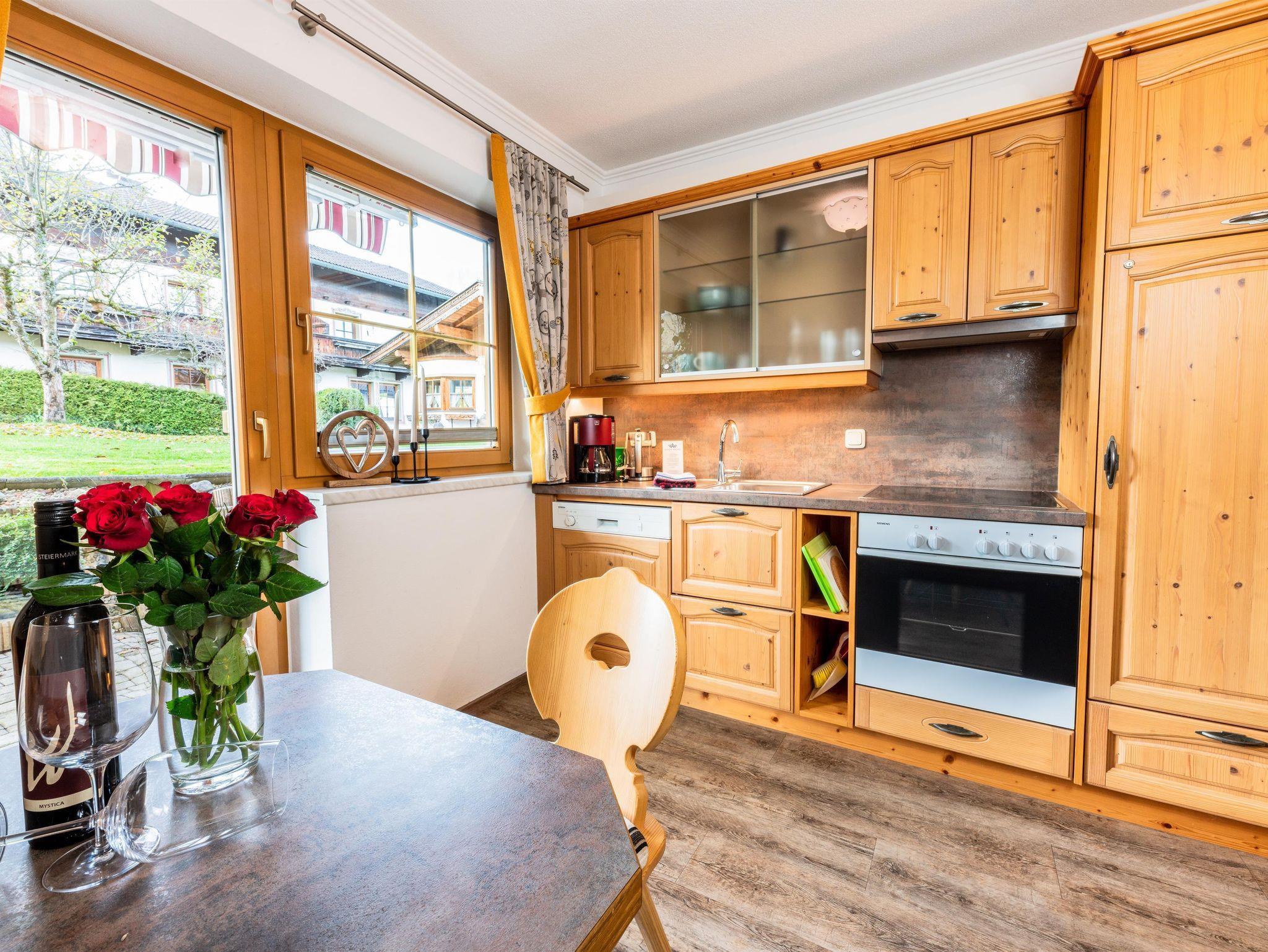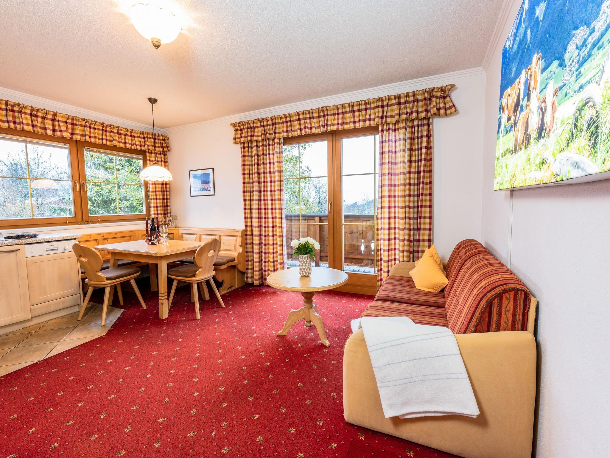 Das Appartement 1 liegt im Erdgeschoss. Es verfügt über eine eigene Terrasse mit Blick Richtung Westen auf den Dorfplatz und nach Norden zum Wilden Kaiser. Im Schlafzimmer befinden sich ein Doppelbett, Schreibtisch, Fernseher sowie ein Kachelofen zur Verfügung. Durch einen Rundbogen gelangen Sie in die großräumige Küche. Die Terrasse ist über die Küche zugänglich.