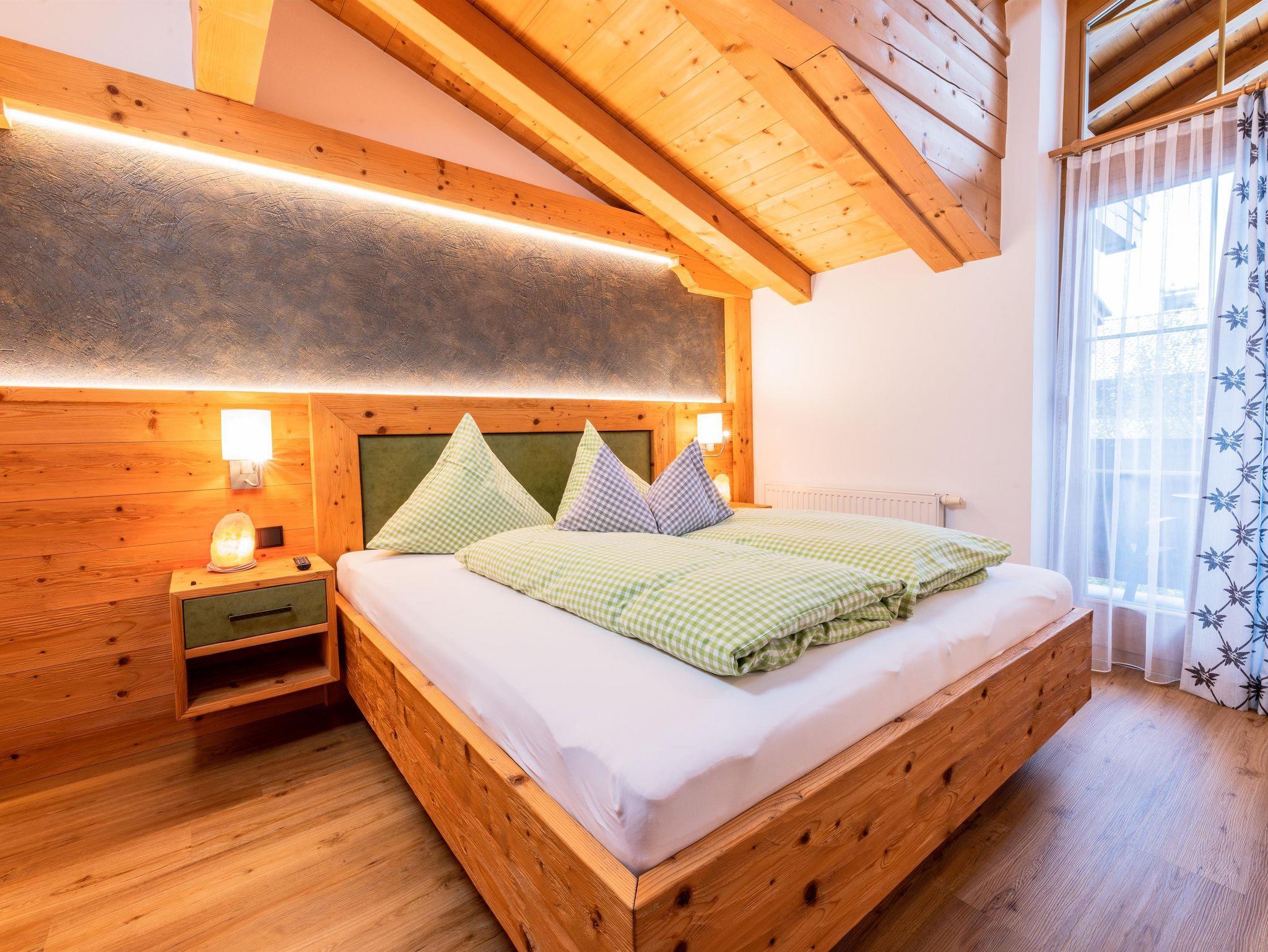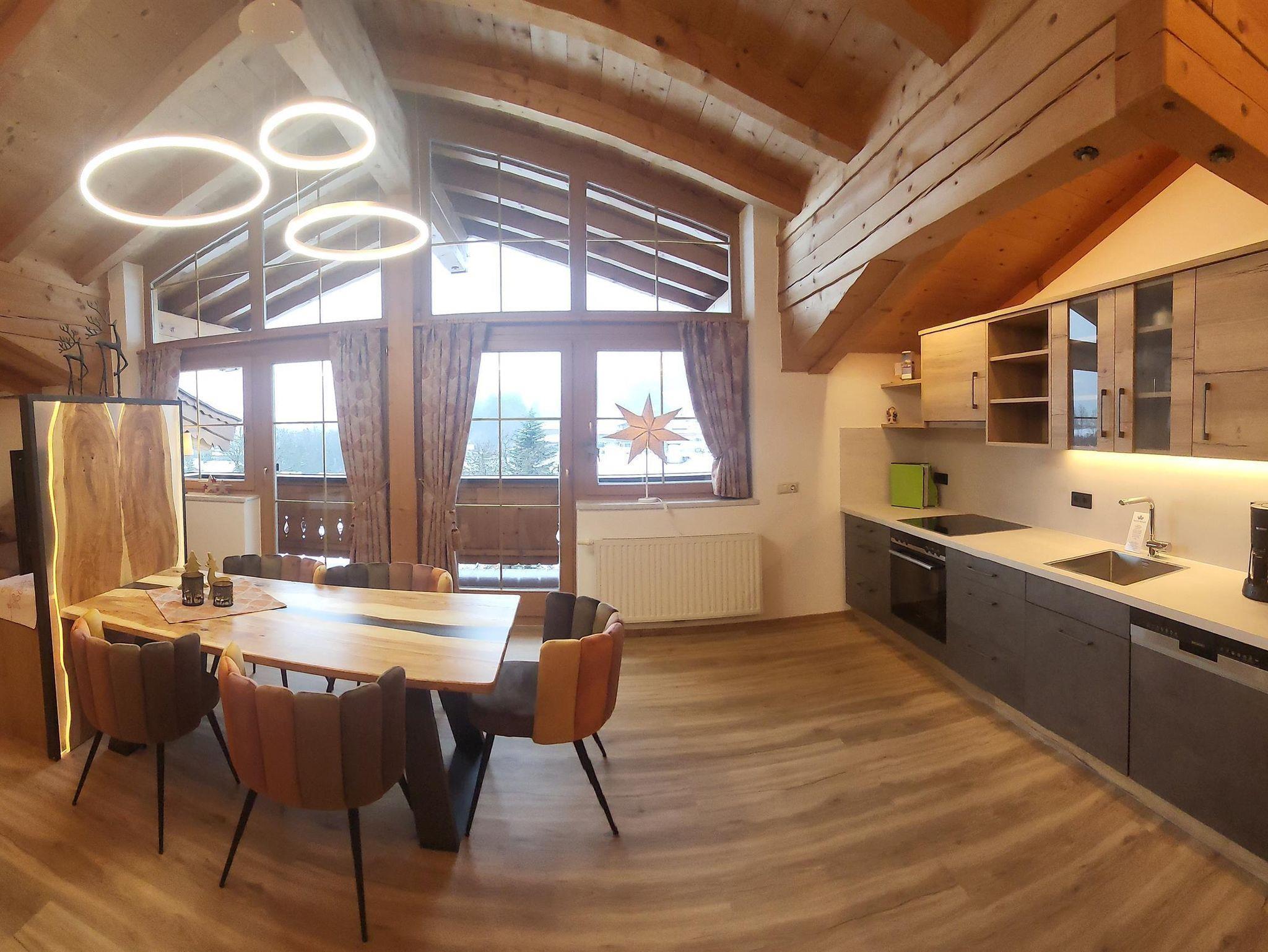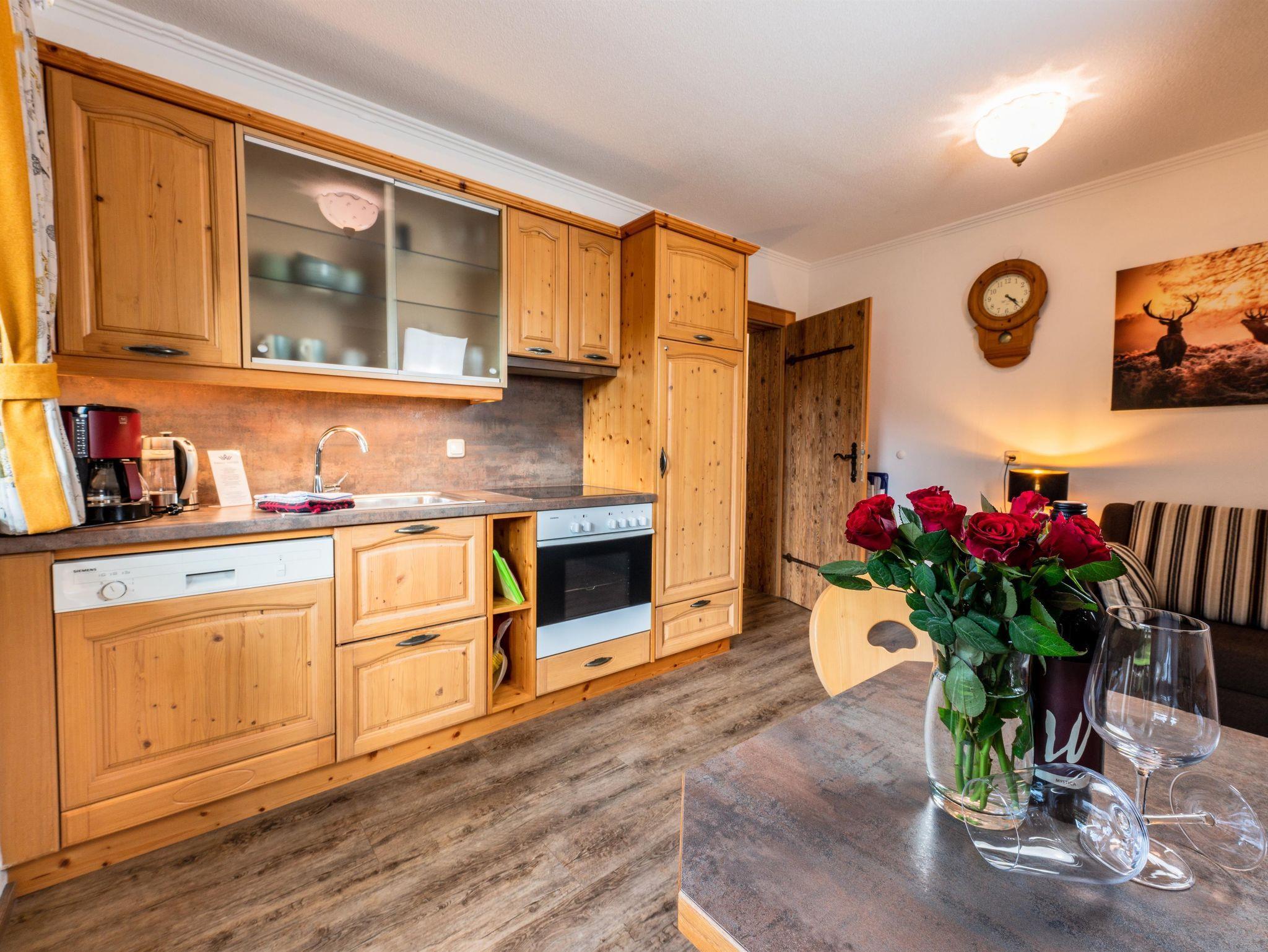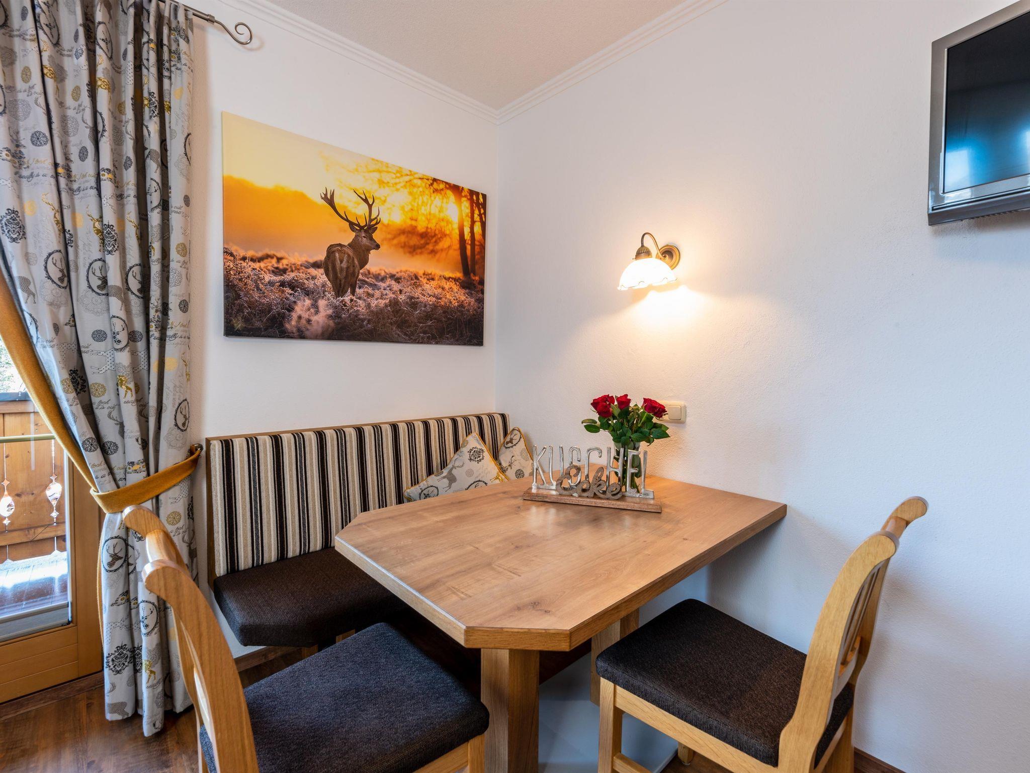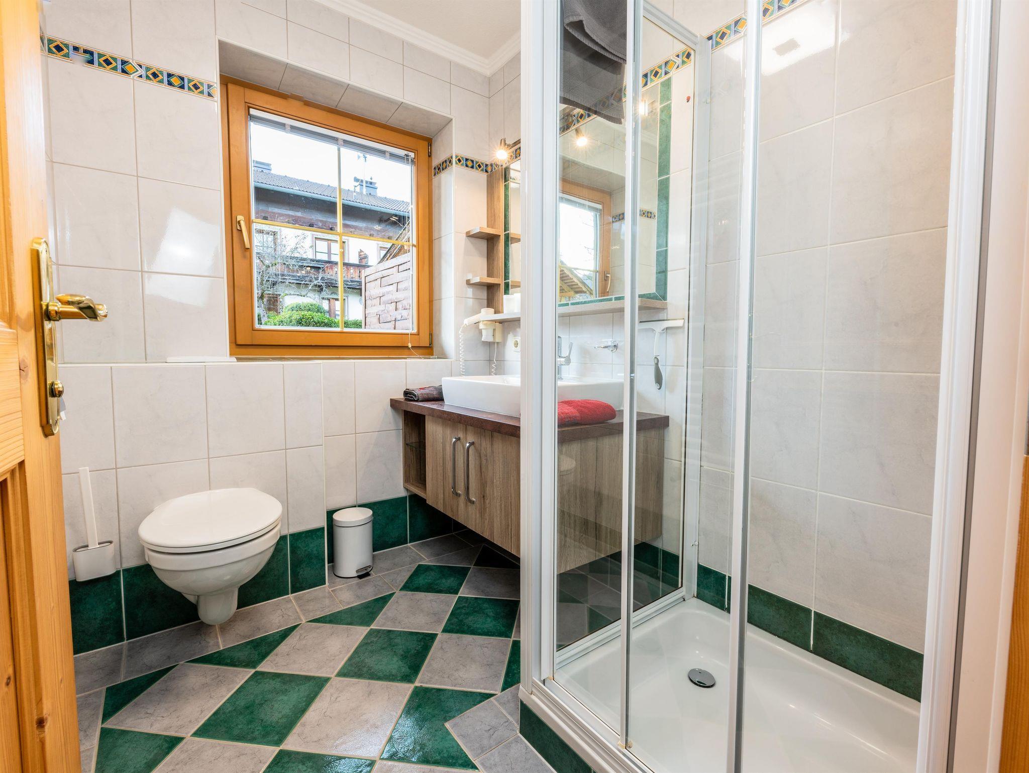 Das Appartement 1 liegt im Erdgeschoss. Es verfügt über eine eigene Terrasse mit Blick Richtung Westen auf den Dorfplatz und nach Norden zum Wilden Kaiser. Im Schlafzimmer befinden sich ein Doppelbett, Schreibtisch, Fernseher sowie ein Kachelofen zur Verfügung. Durch einen Rundbogen gelangen Sie in die großräumige Küche. Die Terrasse ist über die Küche zugänglich.