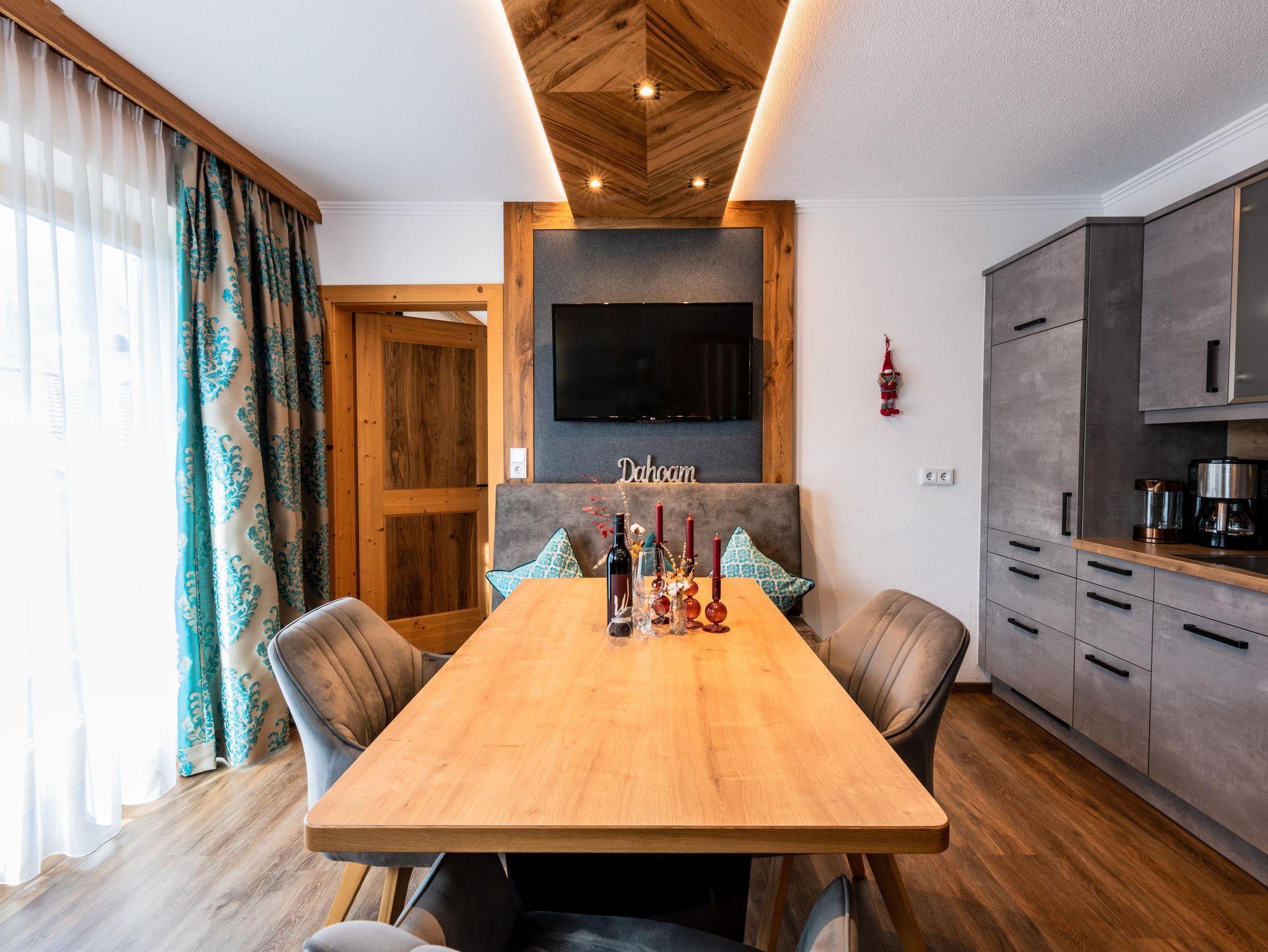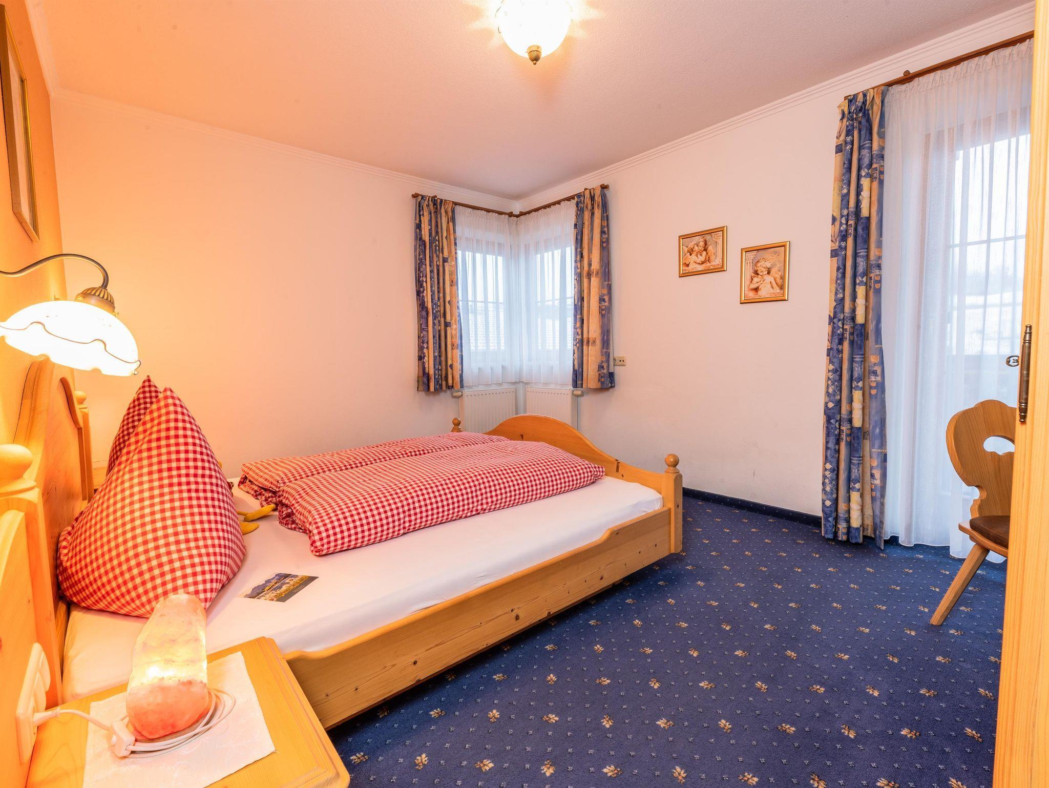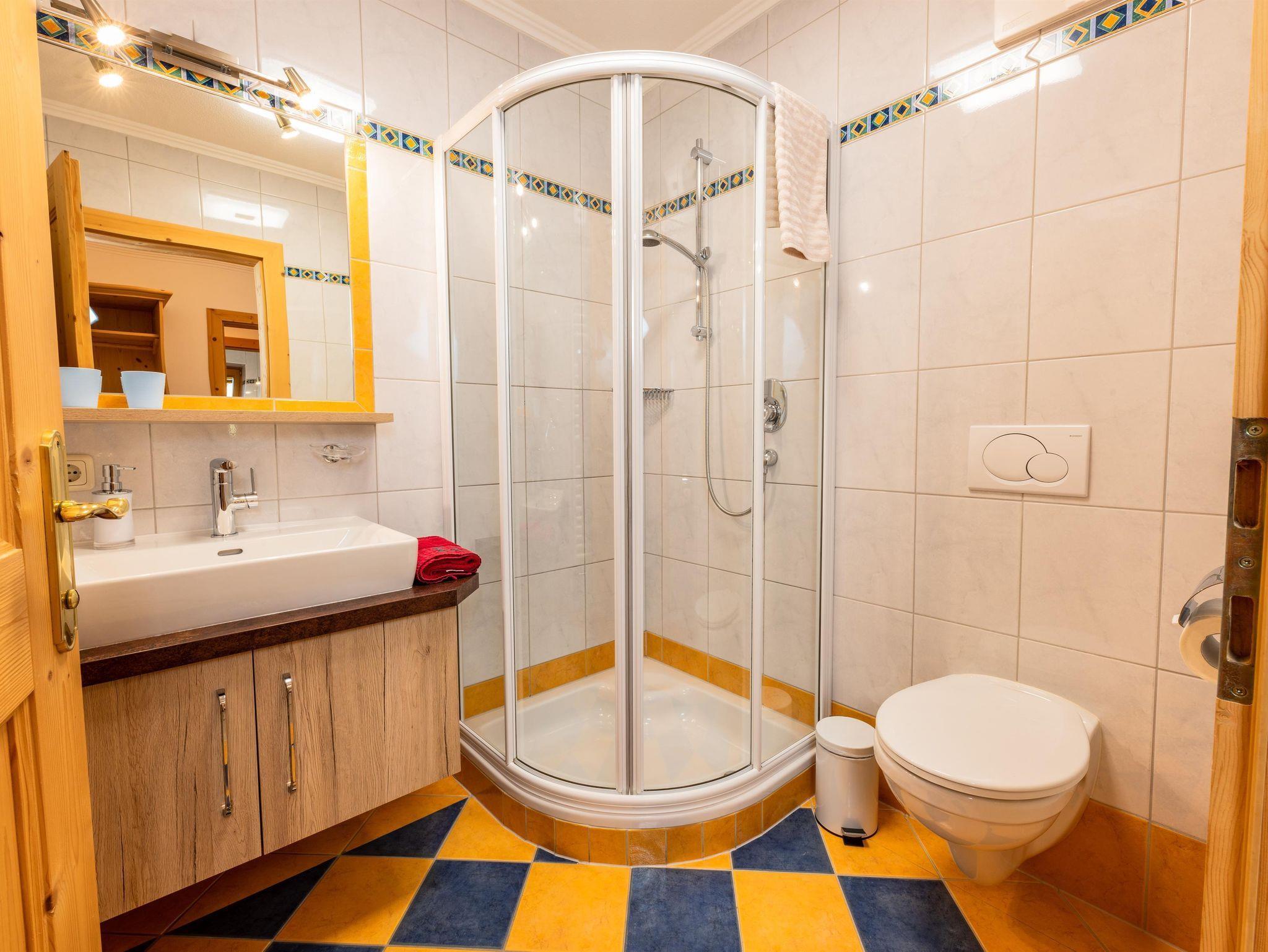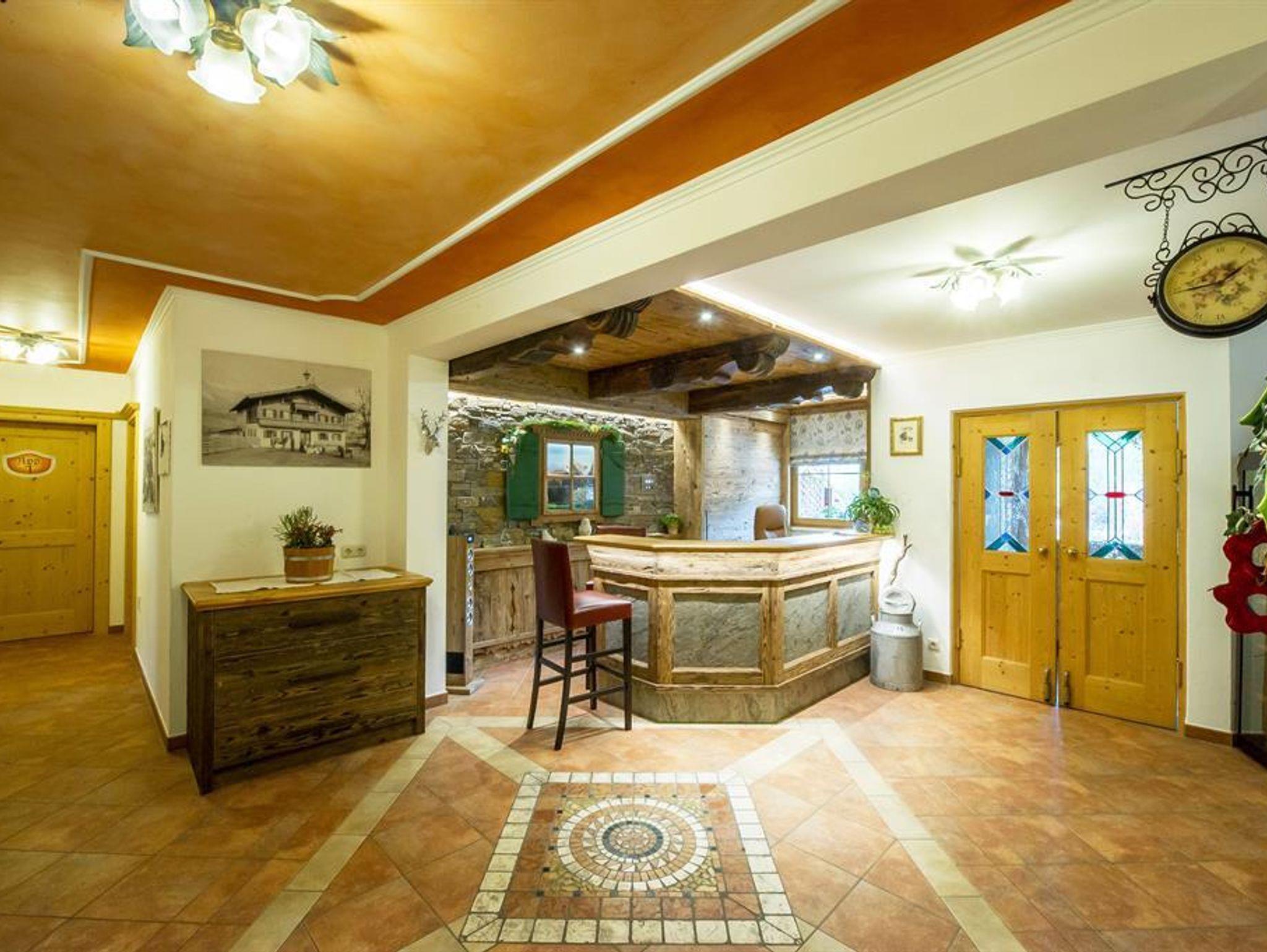 Das Appartement 1 liegt im Erdgeschoss. Es verfügt über eine eigene Terrasse mit Blick Richtung Westen auf den Dorfplatz und nach Norden zum Wilden Kaiser. Im Schlafzimmer befinden sich ein Doppelbett, Schreibtisch, Fernseher sowie ein Kachelofen zur Verfügung. Durch einen Rundbogen gelangen Sie in die großräumige Küche. Die Terrasse ist über die Küche zugänglich.