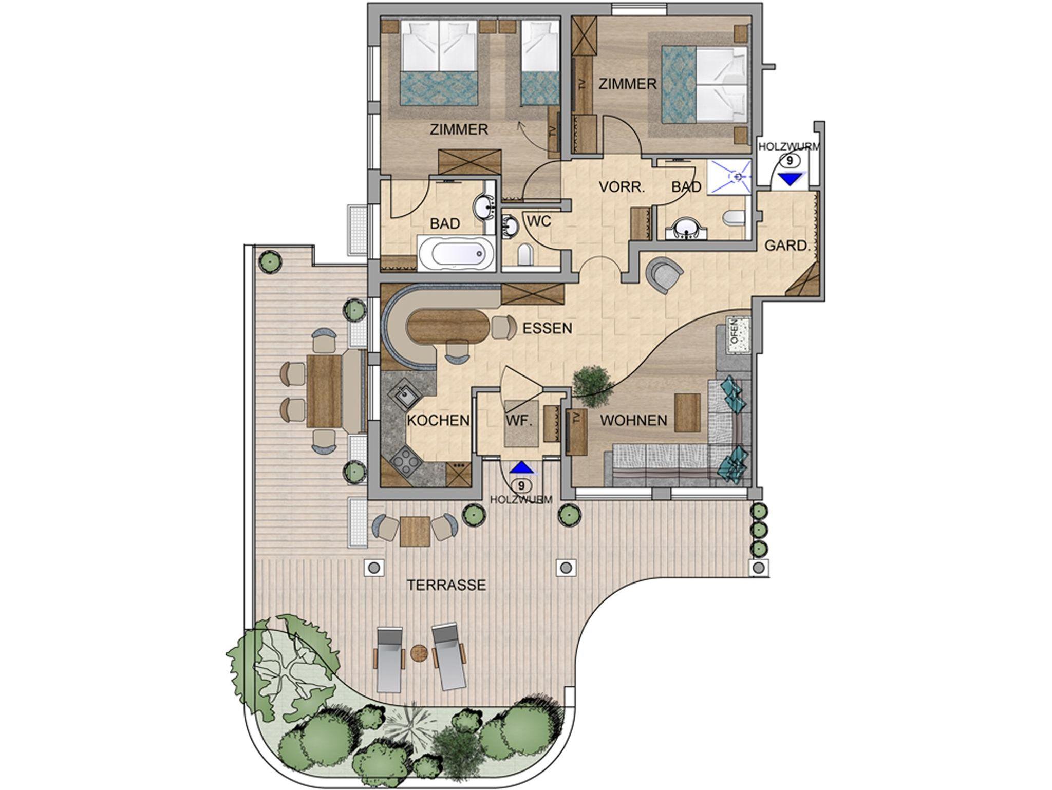 Das im Erdgeschoß mit großer Terrasse gelegene Appartement HOLZWURM ist sehr modern. Die Möbel sind aus edlem Kirschenholz, ganz fein. Auf 100 m² findest du 1 Dreibettzimmer, 1 Doppelzimmer, 2 Bäder mit Badewanne und ebenerdiger Dusche, 2 Toiletten. Das offene Wohnzimmer mit Kachelofen, die große Kuschelcouch mit Flat-TV und die moderne, komplett ausgestattete Hochglanzküche mit gemütlicher Essecke tragen zum Wohngefühl mit Stil bei.