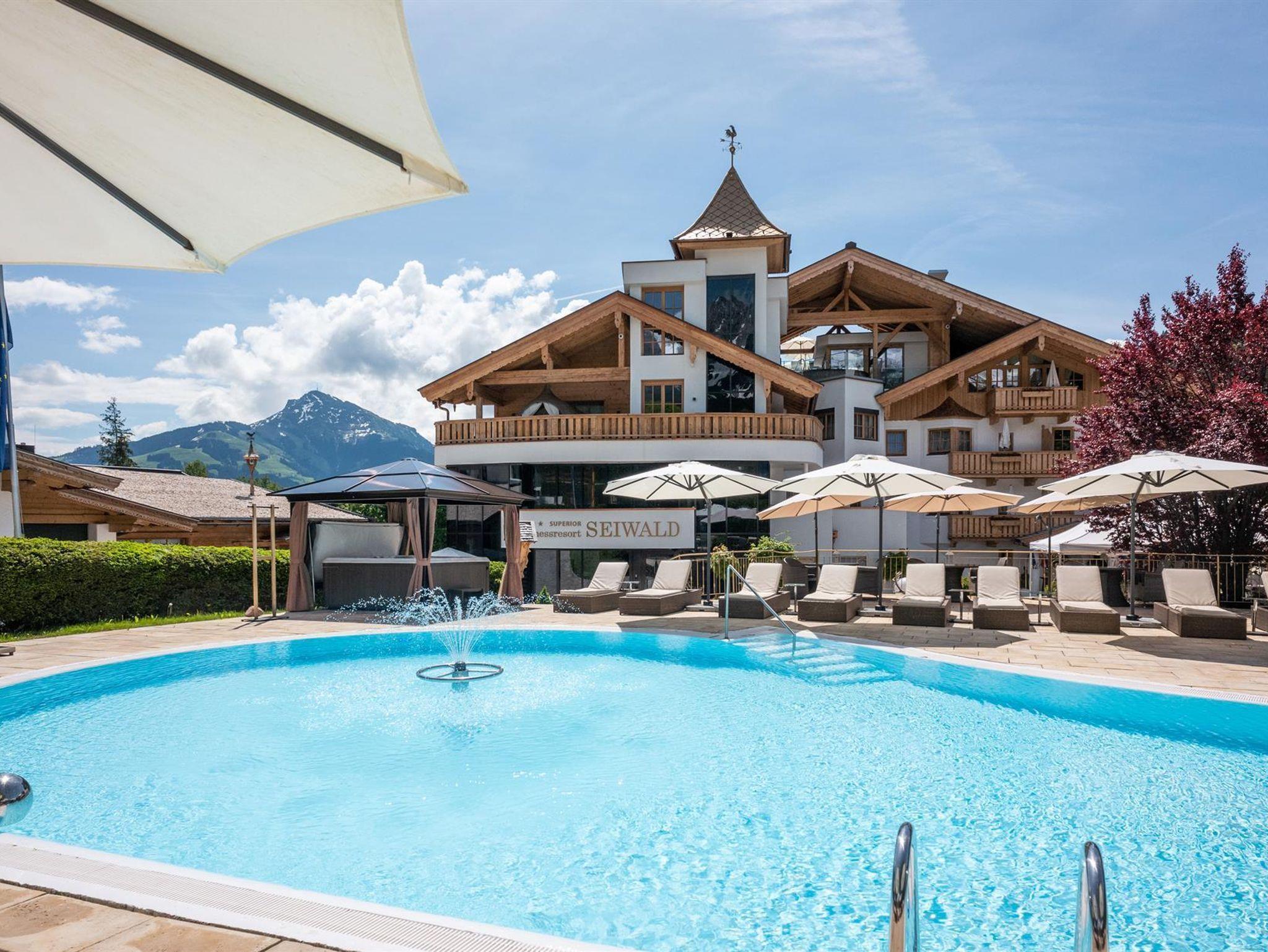 Herzlich willkommen im Familien-Wellnessresort Seiwald! Die Hotelanlage liegt sonnig und ruhig, in bester Lage von Going, 200m oberhalb vom Hotel Stanglwirt im Ortsteil Prama. In unserem familiär geführten Hotel, dem Kaiserschlöss'l und dem gegenüberliegendem Chalethotel können mehr als 100 Gäste unvergessliche Urlaubstage erleben. 10 Gehminuten ins Ortszentrum. Der kostenlose Skibus hält direkt am Hotel. Der berühmte Goinger Badesee, eine Reithalle, der Eislaufplatz und die Langlaufloipen sind vom Hotel in nur 5 Gehminuten erreichbar. Bei Schönwetter lädt der beheizte Außenpool zum Verweilen ein. Sollte Petrus mal streiken können Sie unser großes Erlebnis-Hallenbad genießen. Auf über 2.000 m² Wellnessbereich erwarten sie das Hallenbad mit Whirlpool, Sprudelbank und Luftsprudel, umgeben von einem sagenhaftem Bergbauerndorf mit Mühlrad mit Blick auf Going. Weiters ein großes Saunadorf mit türkischem Dampfbad, Sauna-Schwitzstube, Tepidarium, Solegrotte, Kneippstrasse in den Ötzikäteraum im Felsen, Infrarot-Wärmekabine sowie eine Schönheitsfarm mit Massage und Kosmetik.