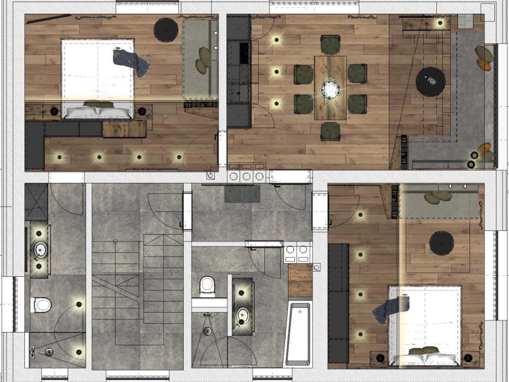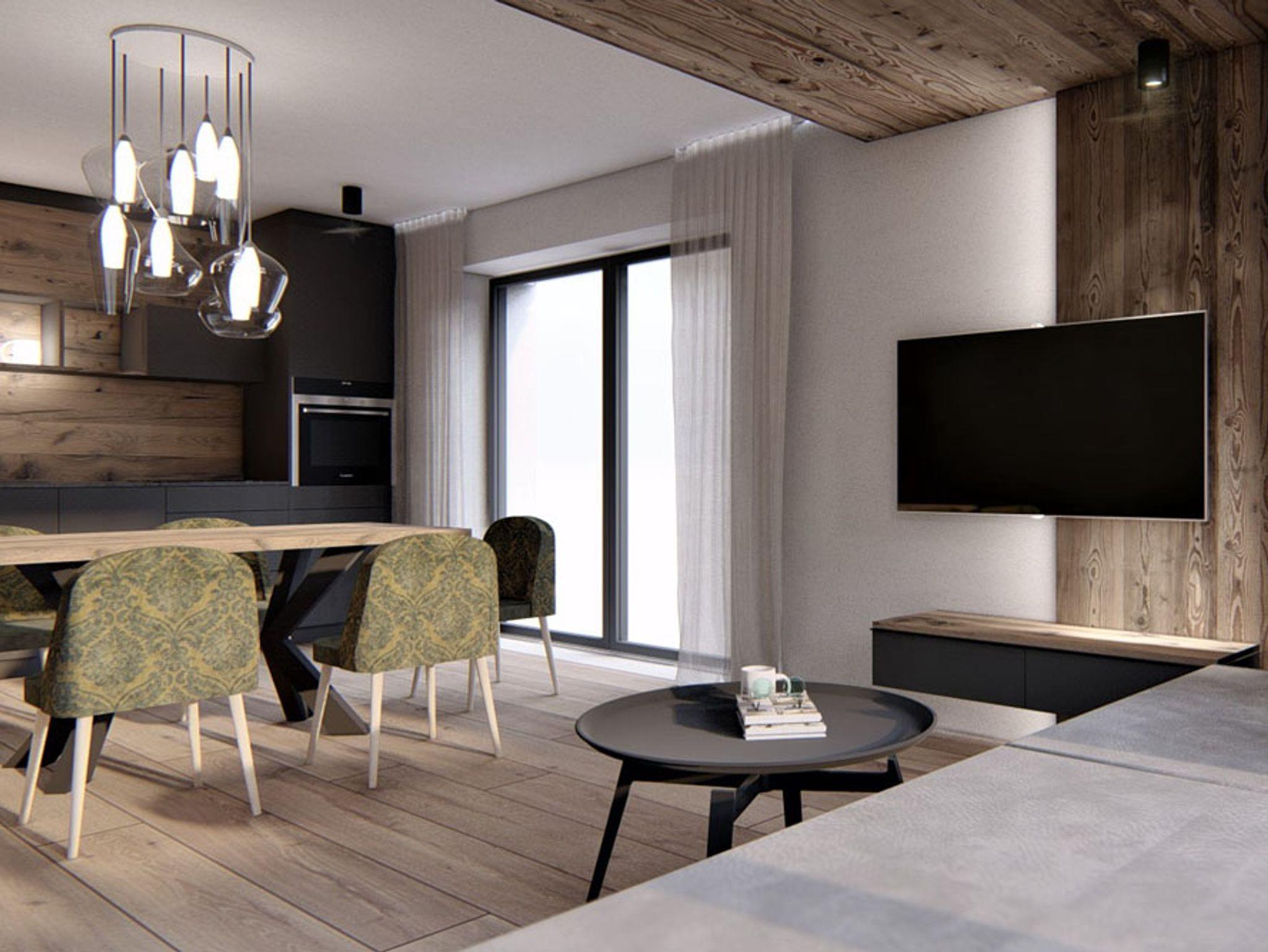 • Jedes Apartment umfasst einen kombinierten Wohn-Essbereich mit einem einladenden Essplatz sowie einer gemütlichen Schlafcouch zur Entspannung und TV-Nutzung.