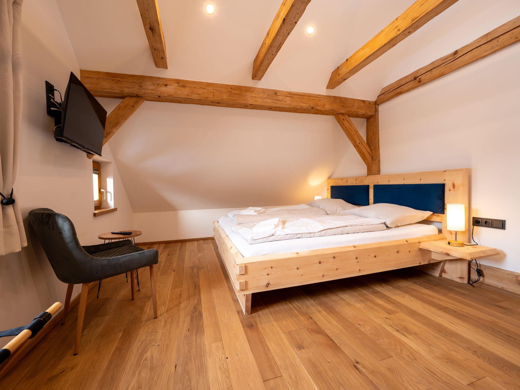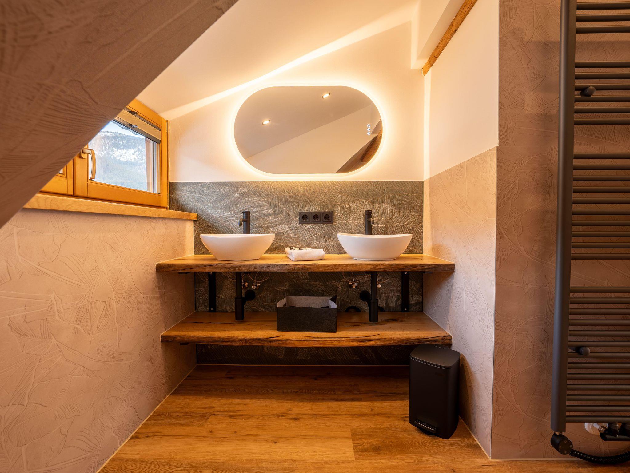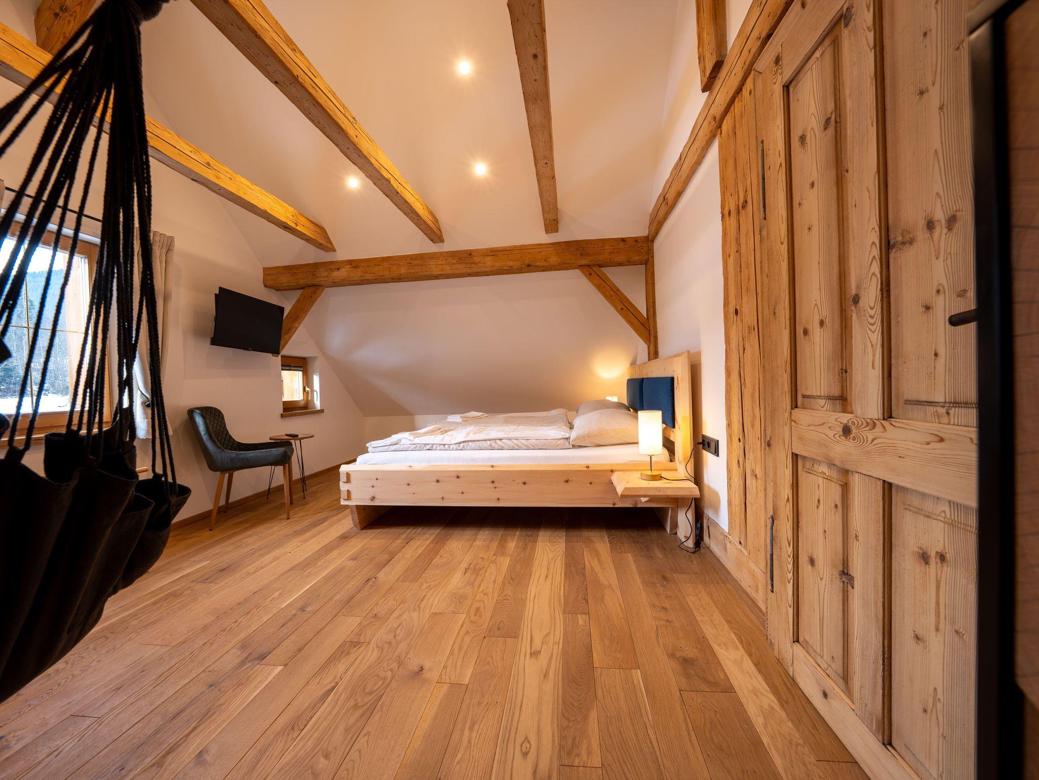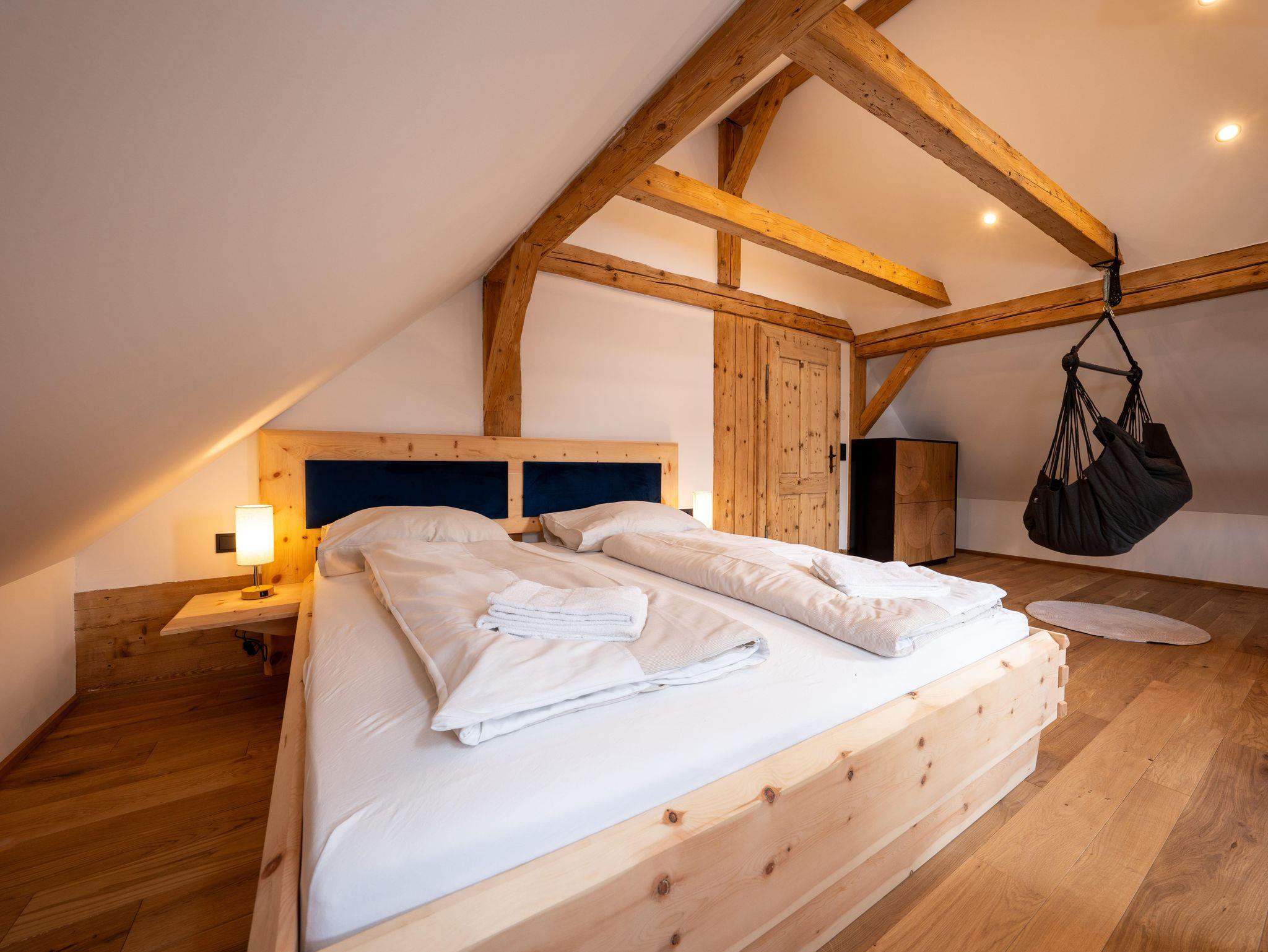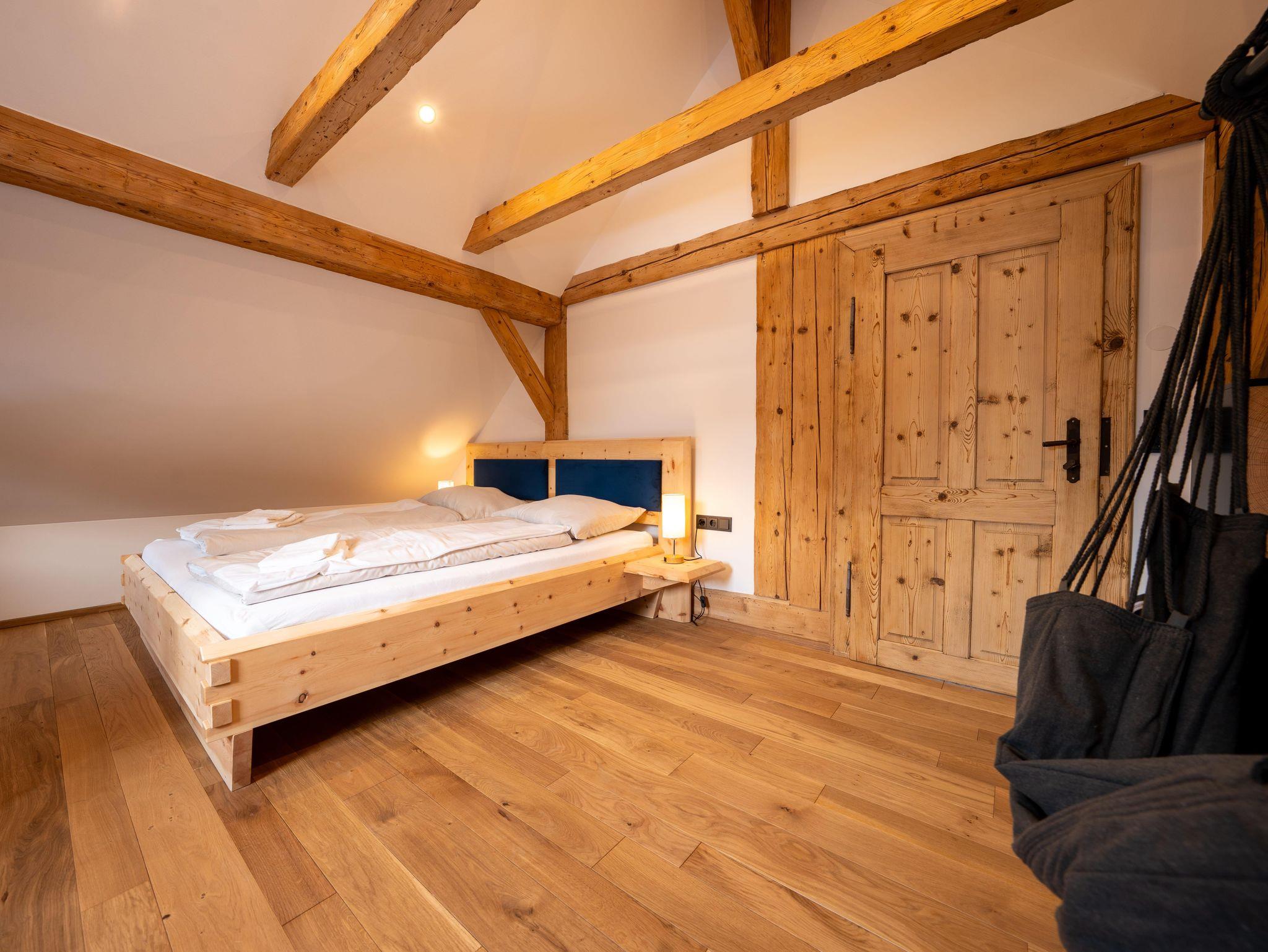 Charaktervolle Holzelemente schaffen eine warme Atmosphäre: Das Zirbendoppelbett sorgt für erholsamen Schlaf, und der handgefertigte Eichen-Esstisch lädt zu geselligen Momenten ein. Im Badezimmer setzt eine restaurierte Werkbank aus dem Jahr 1920 mit modernen Steinbecken einen besonderen Akzent.